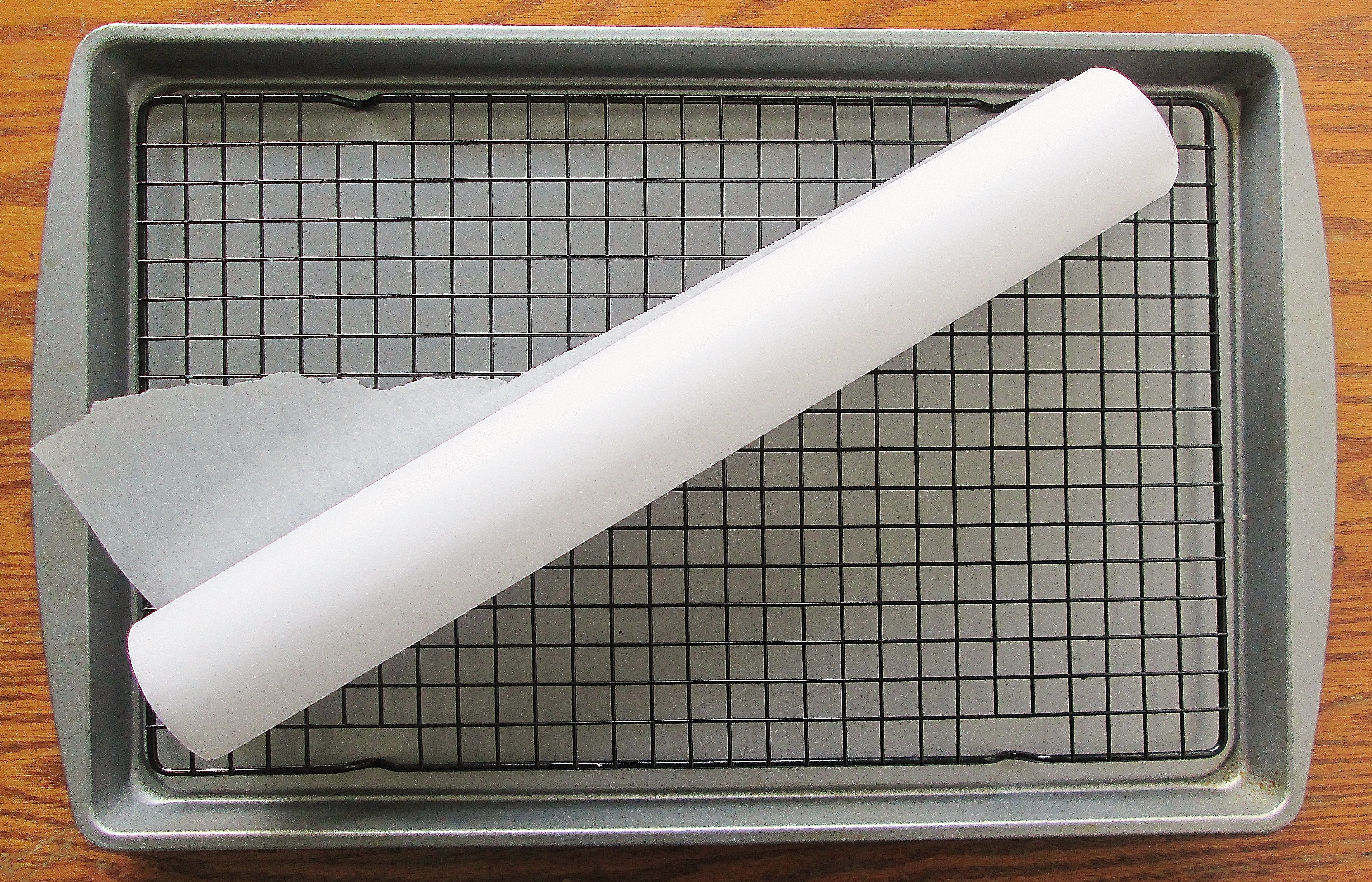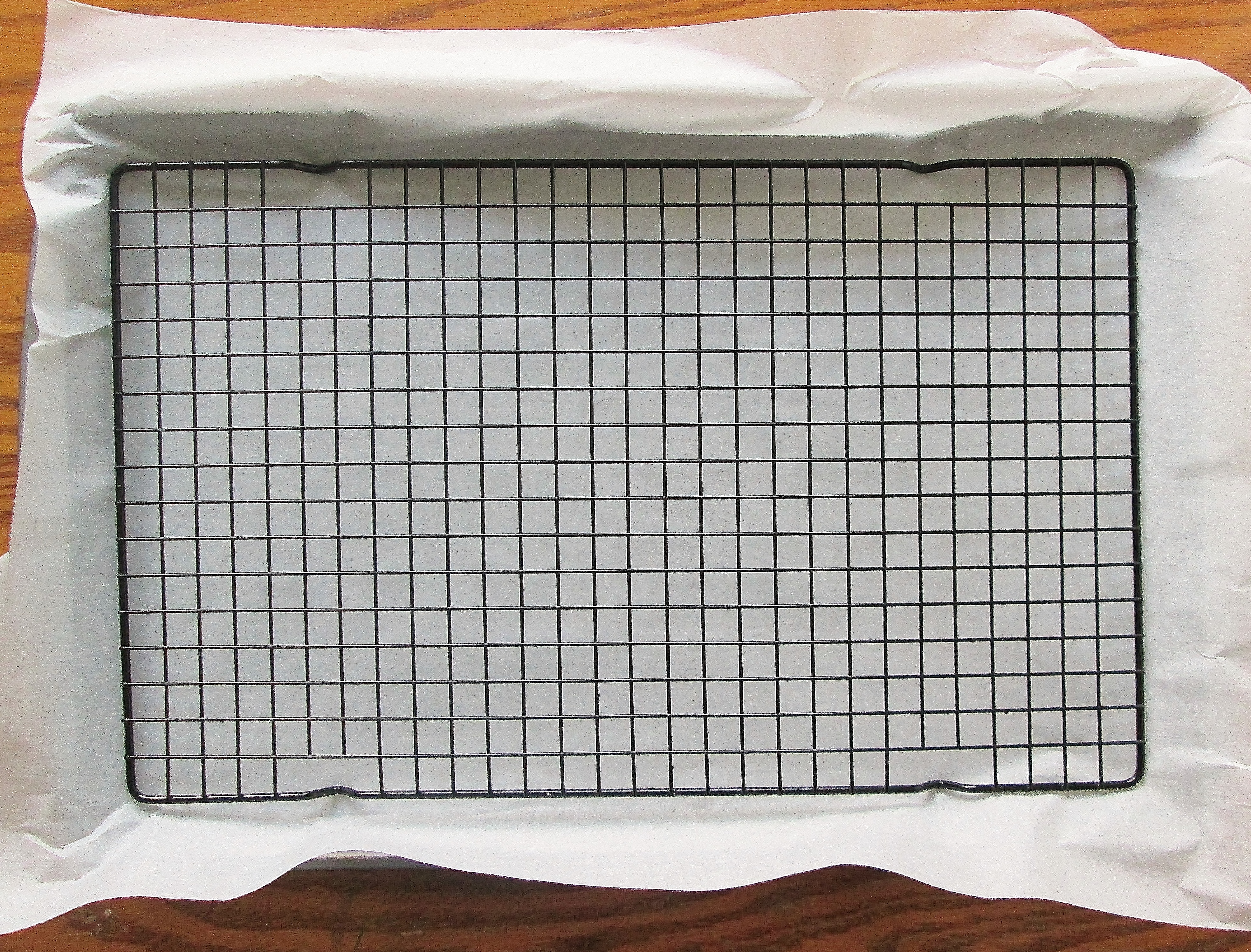 - Spread some wax paper or parchment paper over a baking sheet, then place a wire cooling rack on the baking sheet.