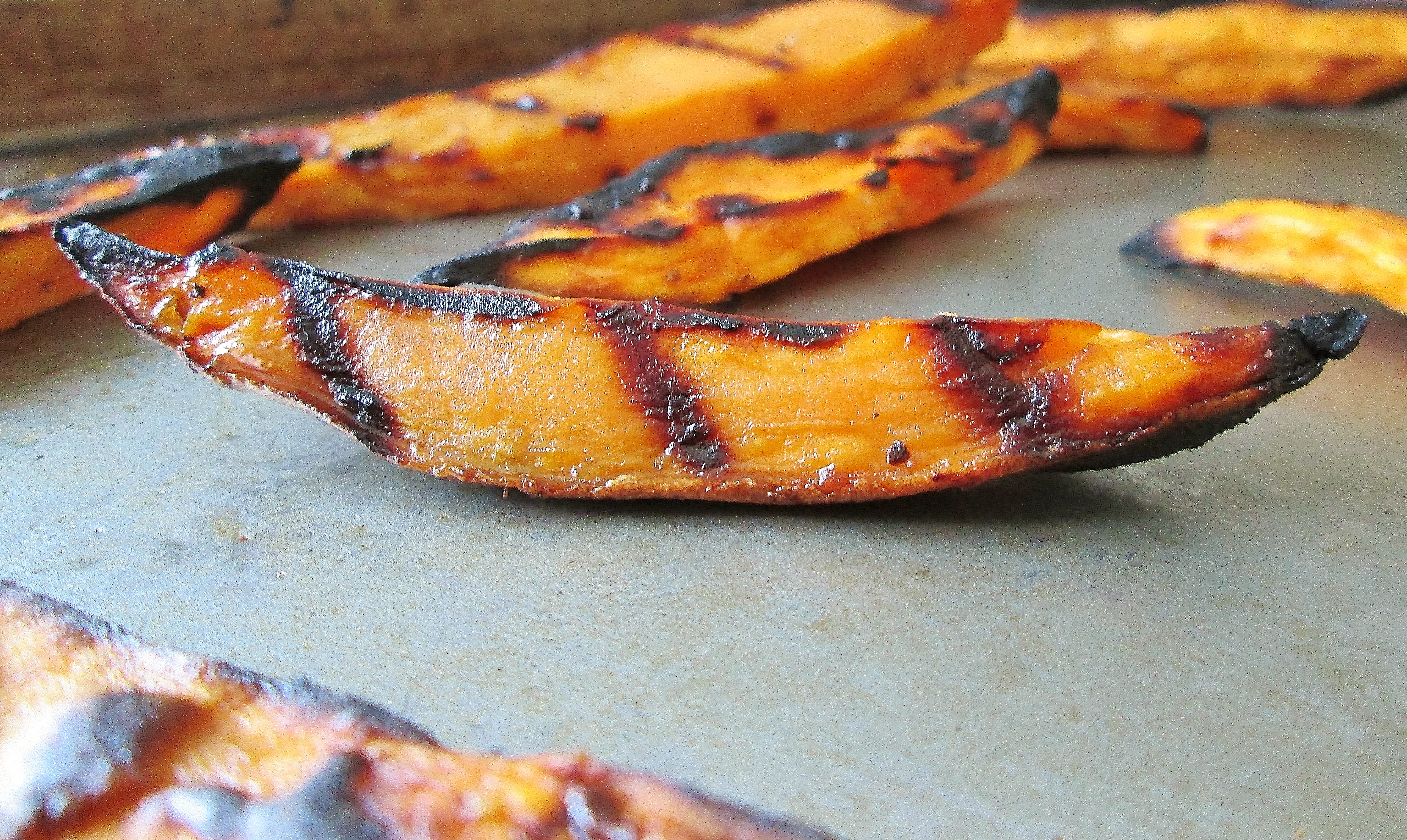 - Using a pastry brush, coat the sweet potato stripes with the honey sauce and sprinkle on the salt and pepper.