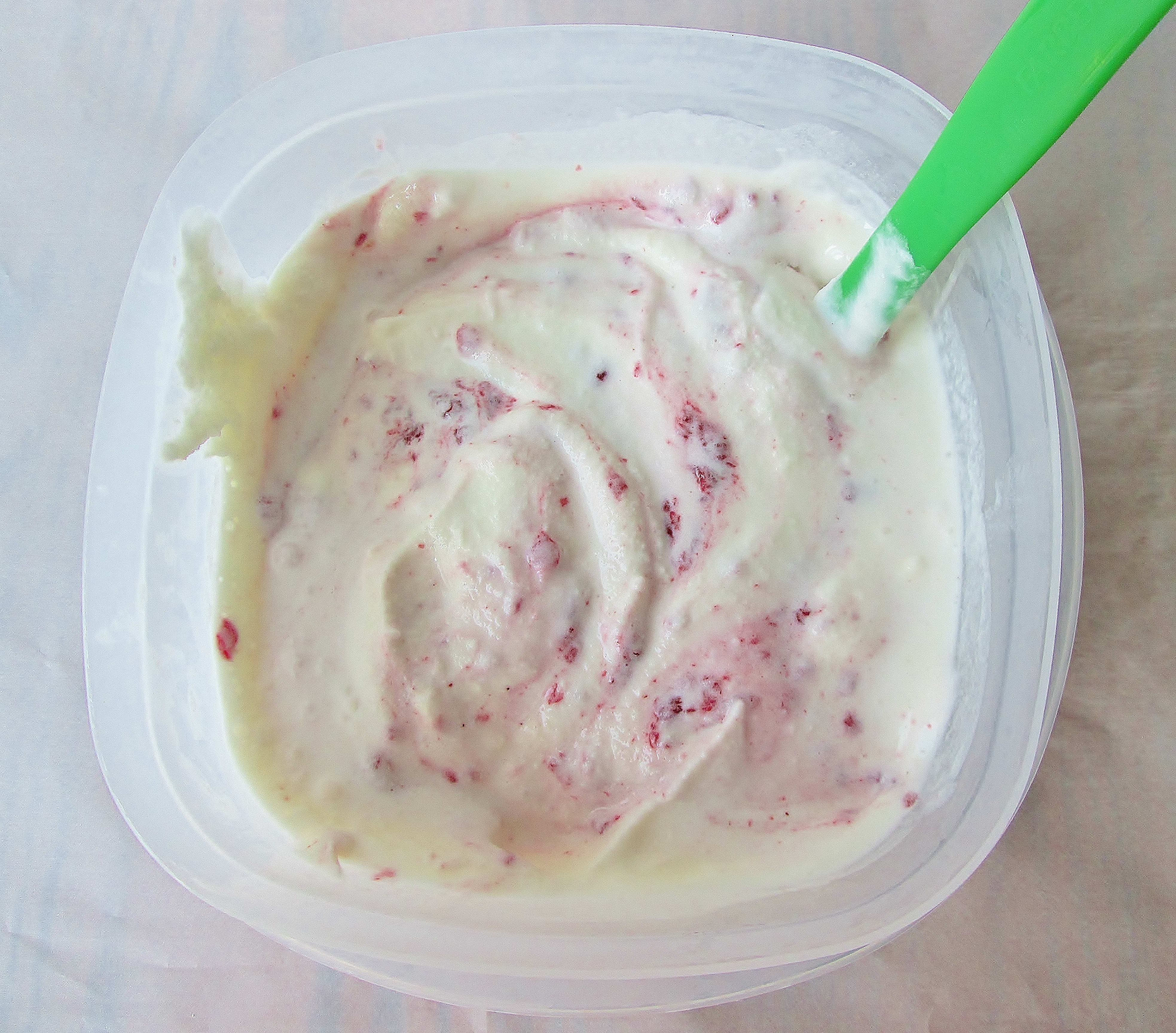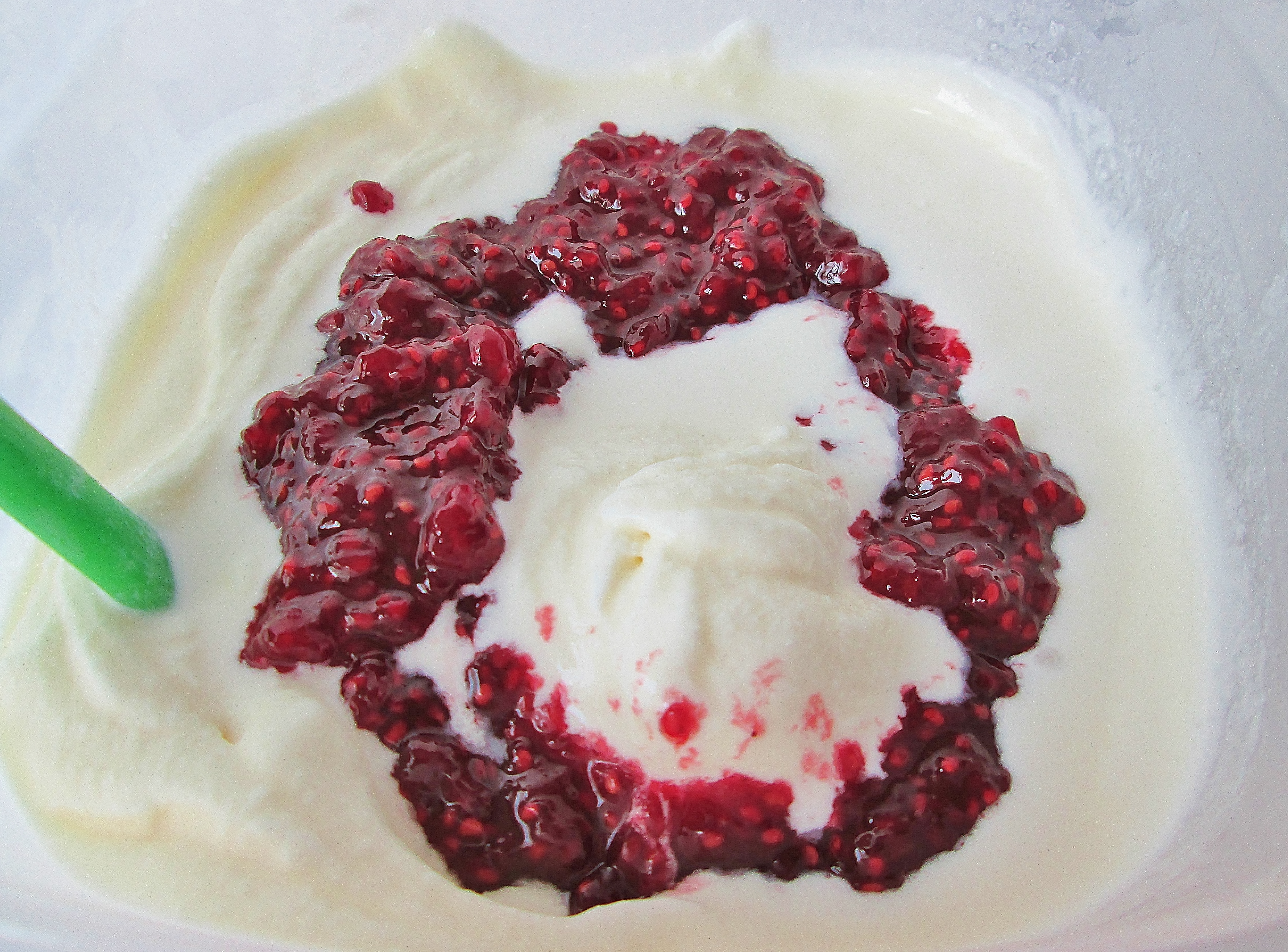 - Gently fold the jam into the ice cream for a few strokes---just enough to incorporate a raspberry swirl through the vanilla.