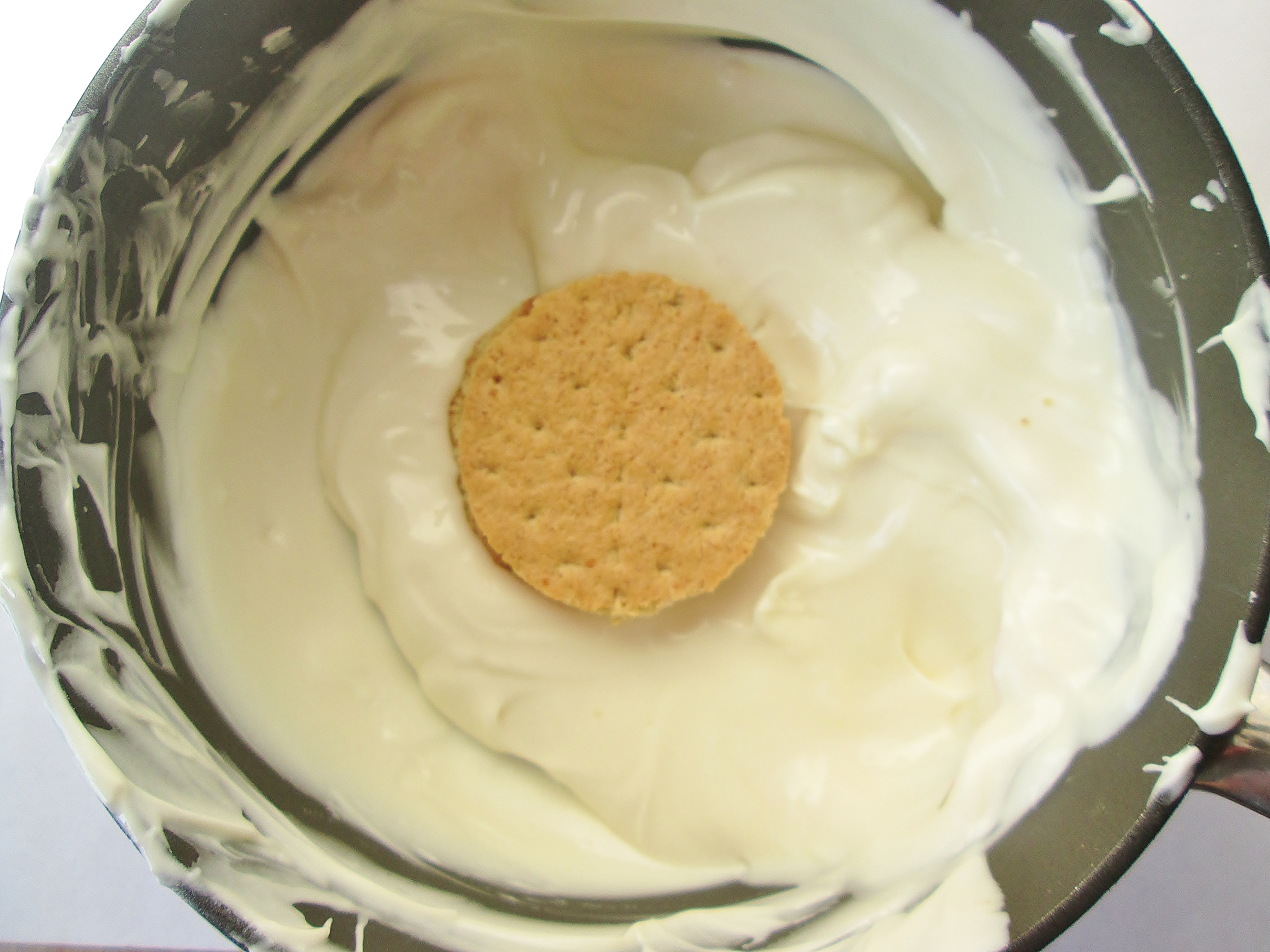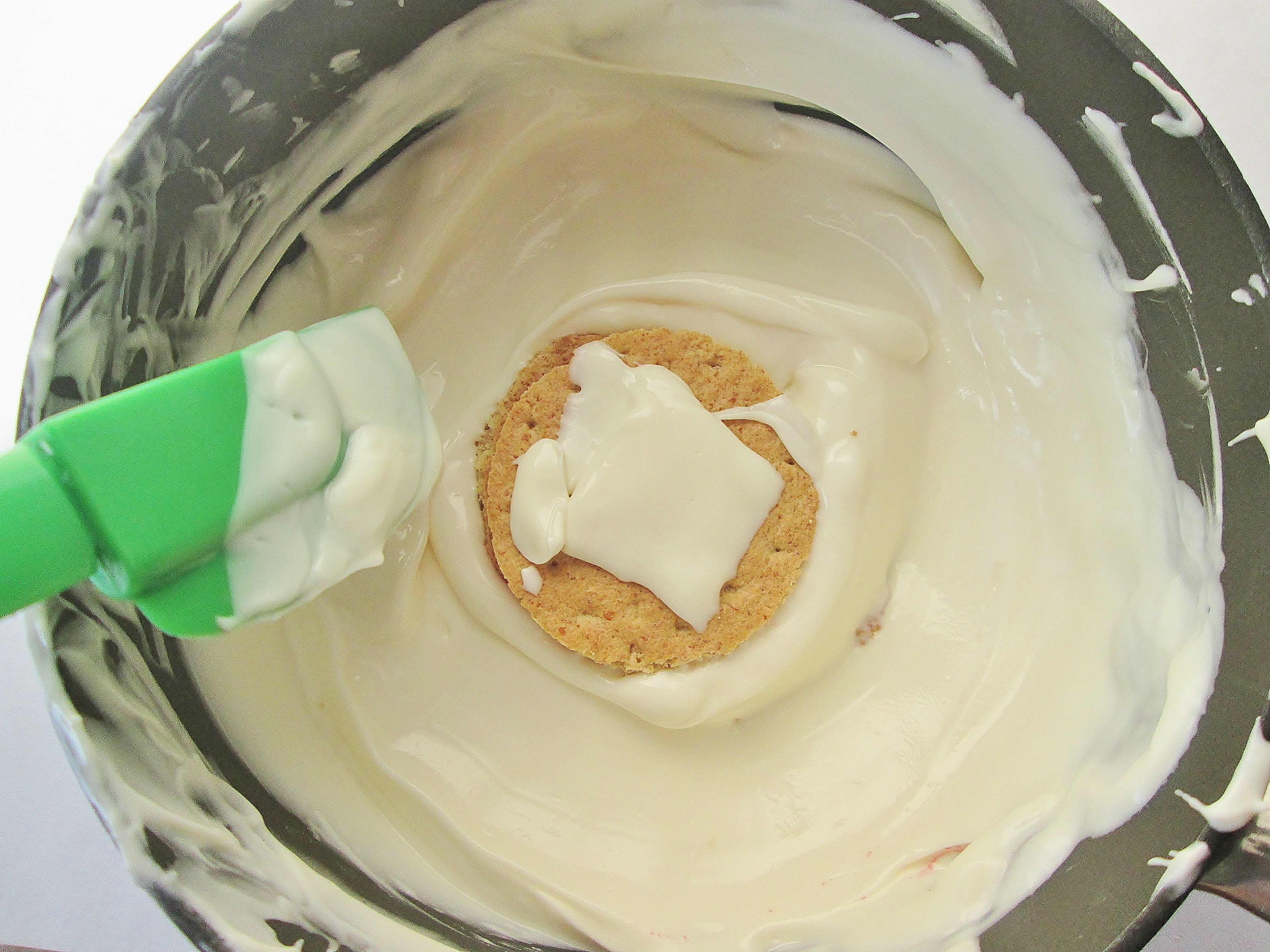 The exact amount of fluff you’ll need depends on the size of your cookie cutter. My graham disks were about two inches wide, and my dollop was a little bigger than a marble. See how there’s a little bit of a gap between the edge of the fluff and the edge of the graham? That’s what you want to achieve. - Place the “graham sandwich” in the middle of the saucepan. Use your spatula to fold the melted coating over the top of the grahams and around the edges. Continue until the sandwich is completely coated.