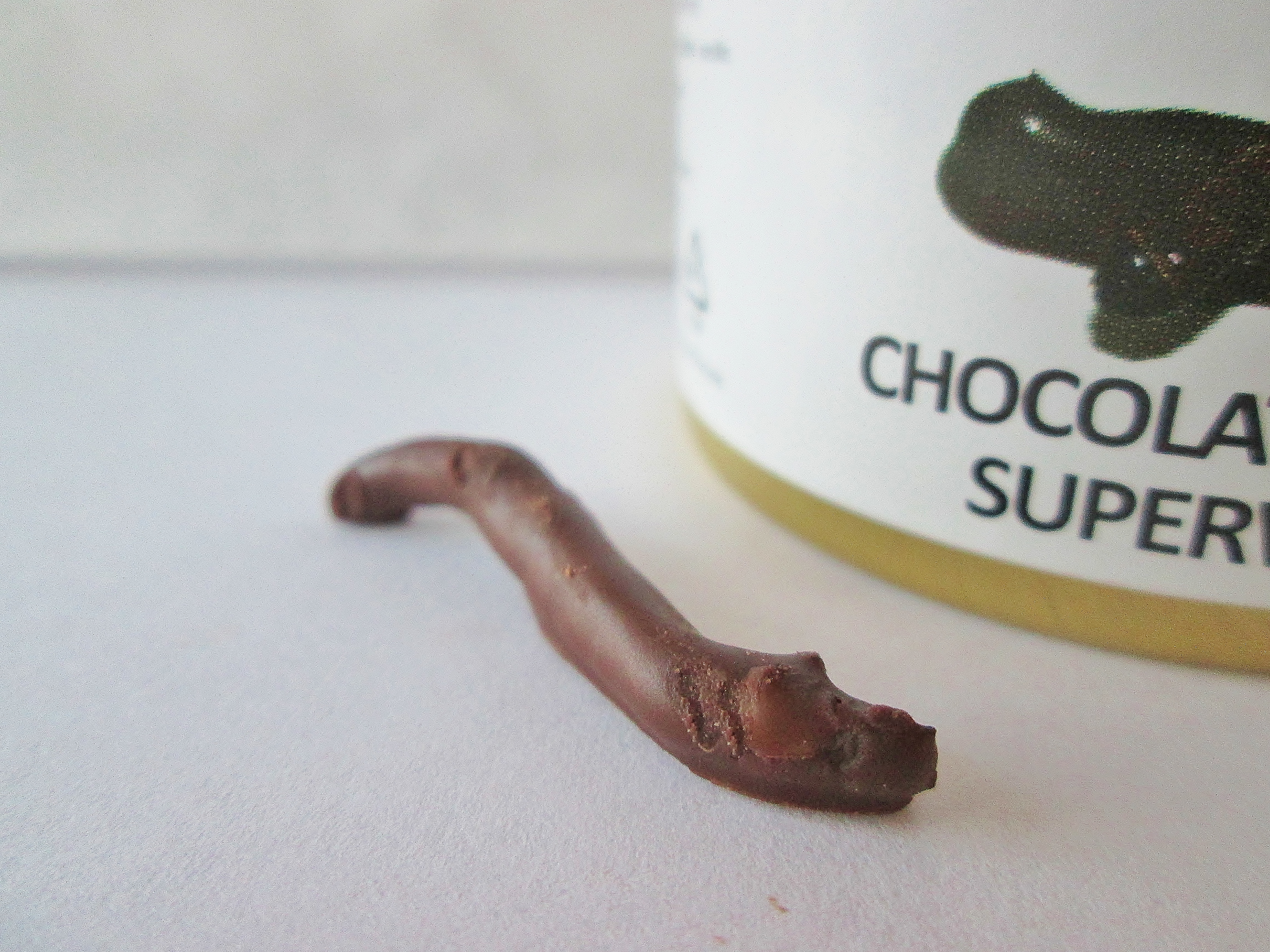 These definitely looked a lot more like worms. On some of them, you could even see the bumps of segmentation. These were crunchier and a little more firm than the silkworms. The flavor here was more distinct but in a pleasant way. The worms had an earthy, oatmeal flavor that reminded me of cookies when combined with the chocolate. Definitely a bit more snack appeal than the silkworms!