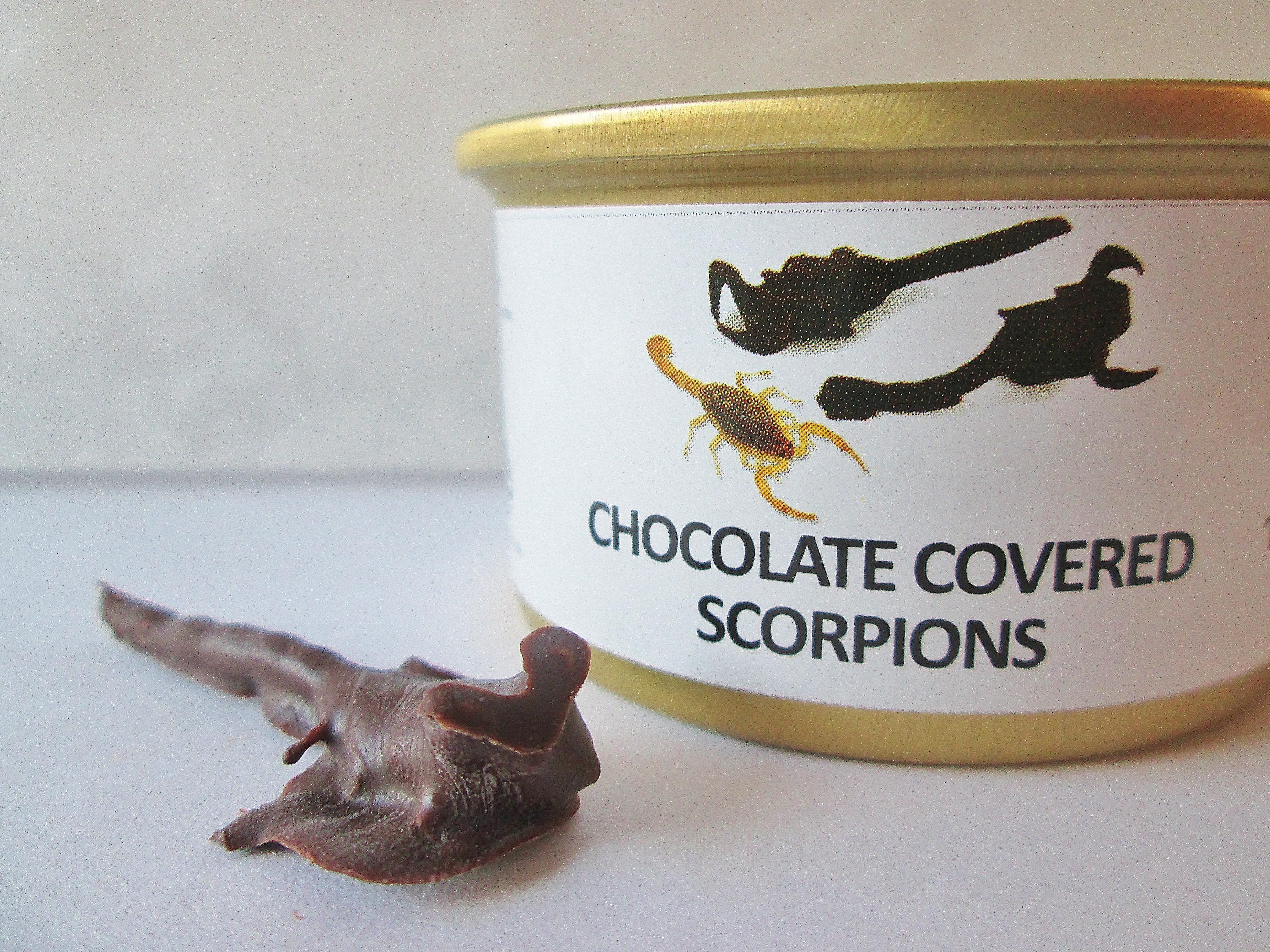 Last week, I ordered a 3-tin pack of chocolate-covered bugs from ThinkGeek. The tins contained 12 silkworms, 12 superworms, and 2 scorpions. Full Disclosure: I’ve been morbidly curious about edible bugs for ages, so Halloween is really just as excuse for me to let my freaky foodie flag fly. 😉