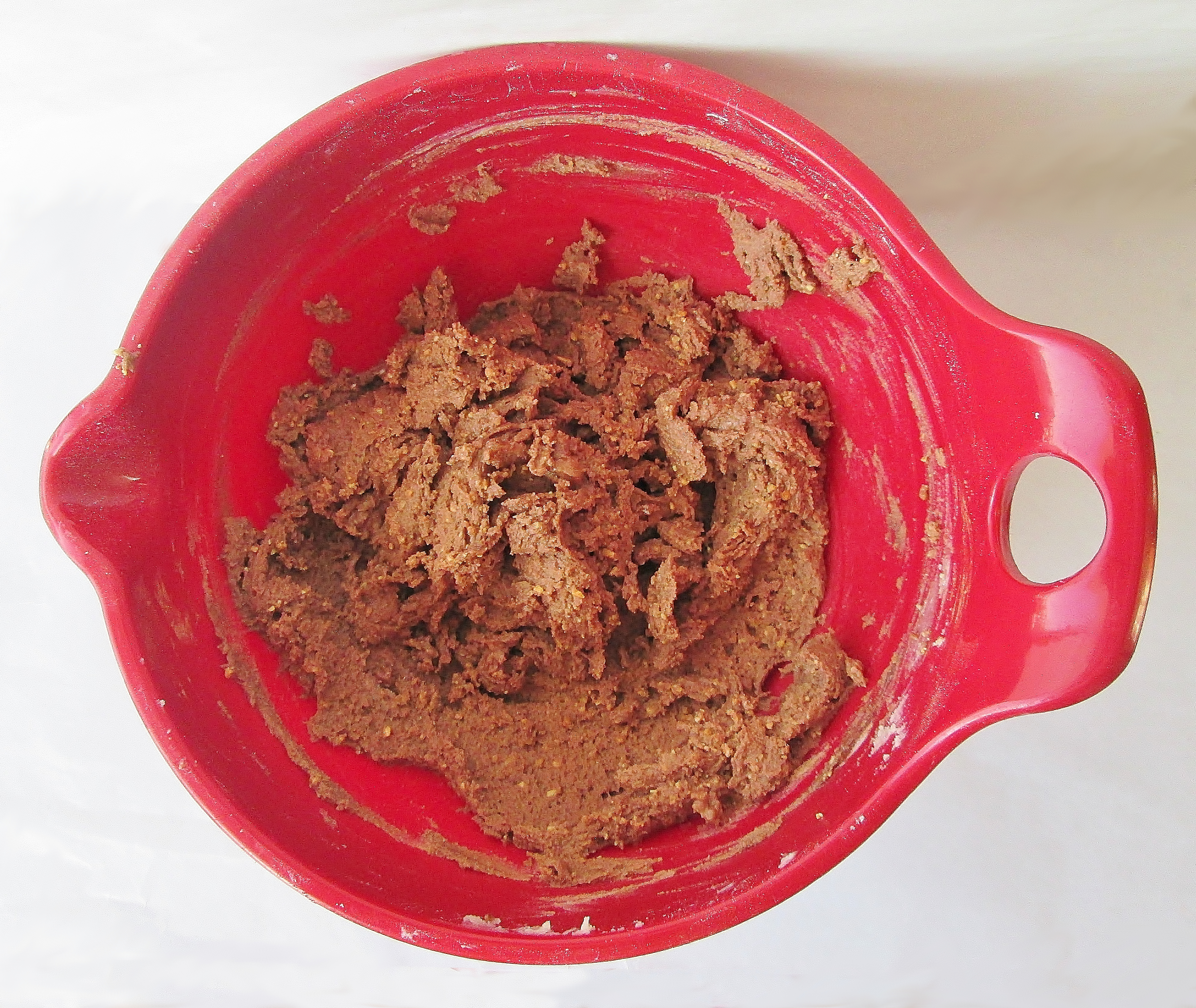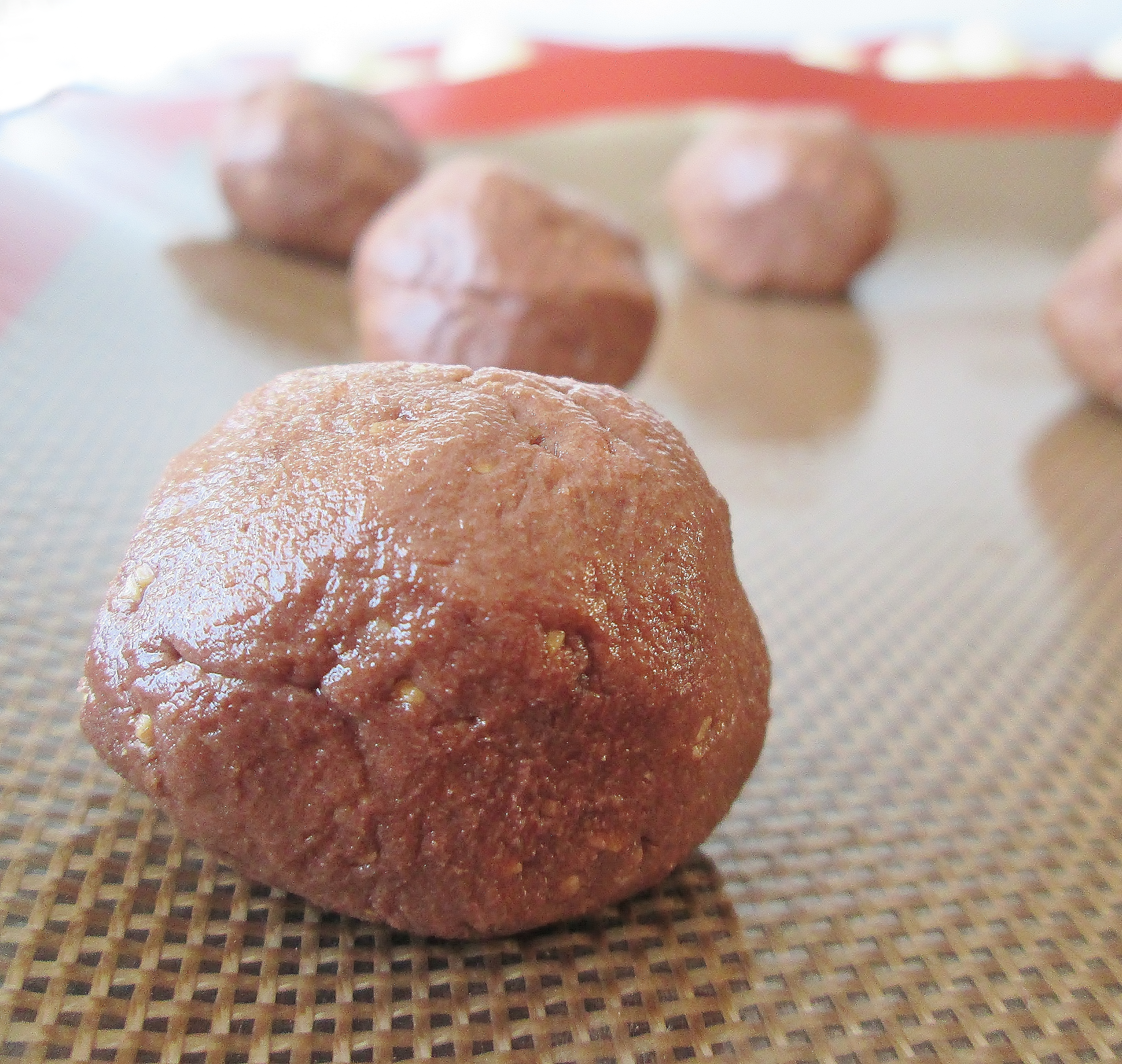 - While the Romeo cookies bake, prepare the Juliet cookie dough. Whisk the butter and powdered sugar for the Juliet cookies together in another medium bowl. Add the salt and vanilla or almond extract and stir until smooth. Whisk in the flour and cocoa powder until the cocoa powder is evenly distributed. Stir in 1/3 cup of the ground almonds. Shape the dough into 1″ balls and set at least 1″ apart on another buttered or silicon-lined baking sheet.