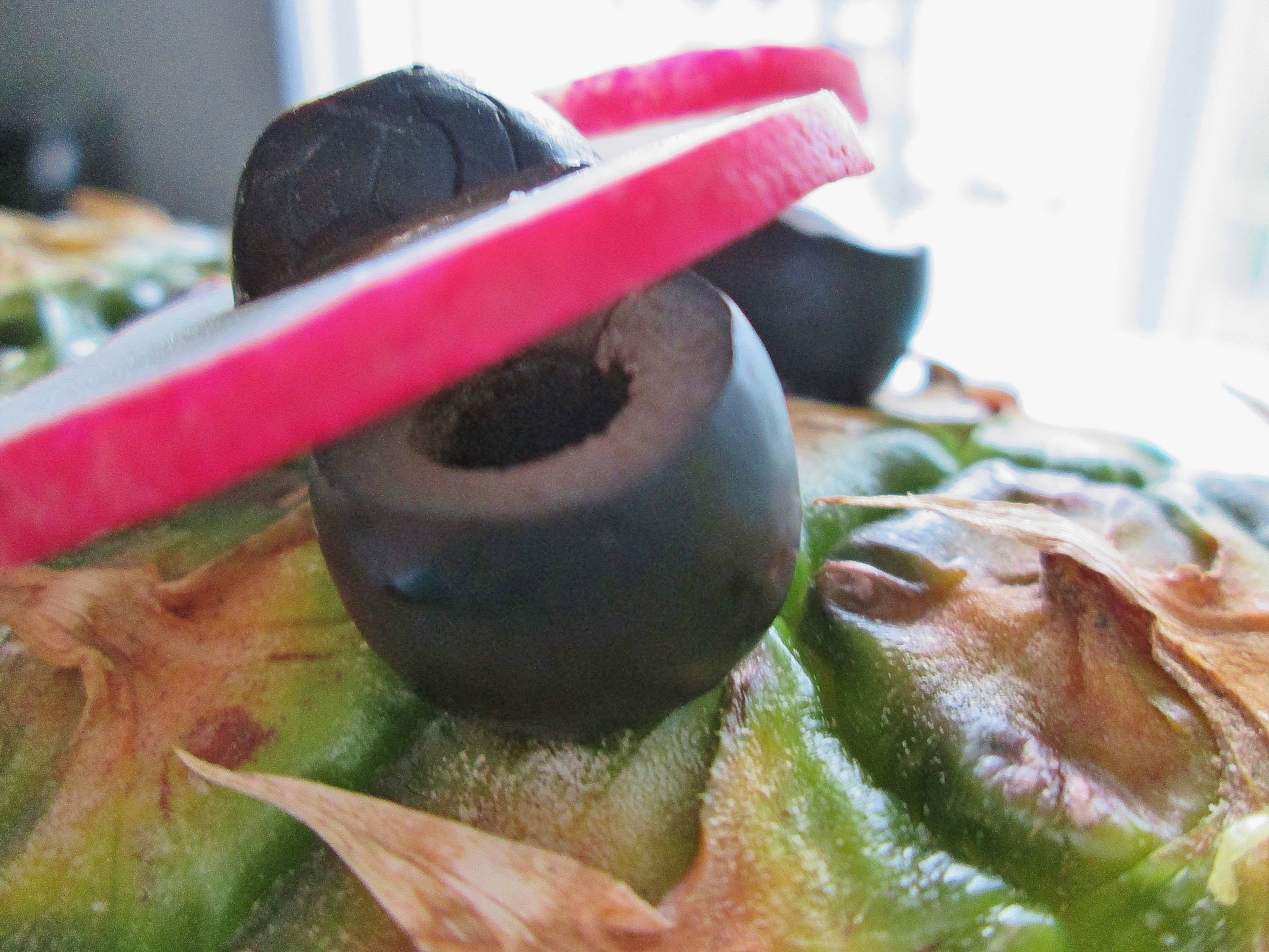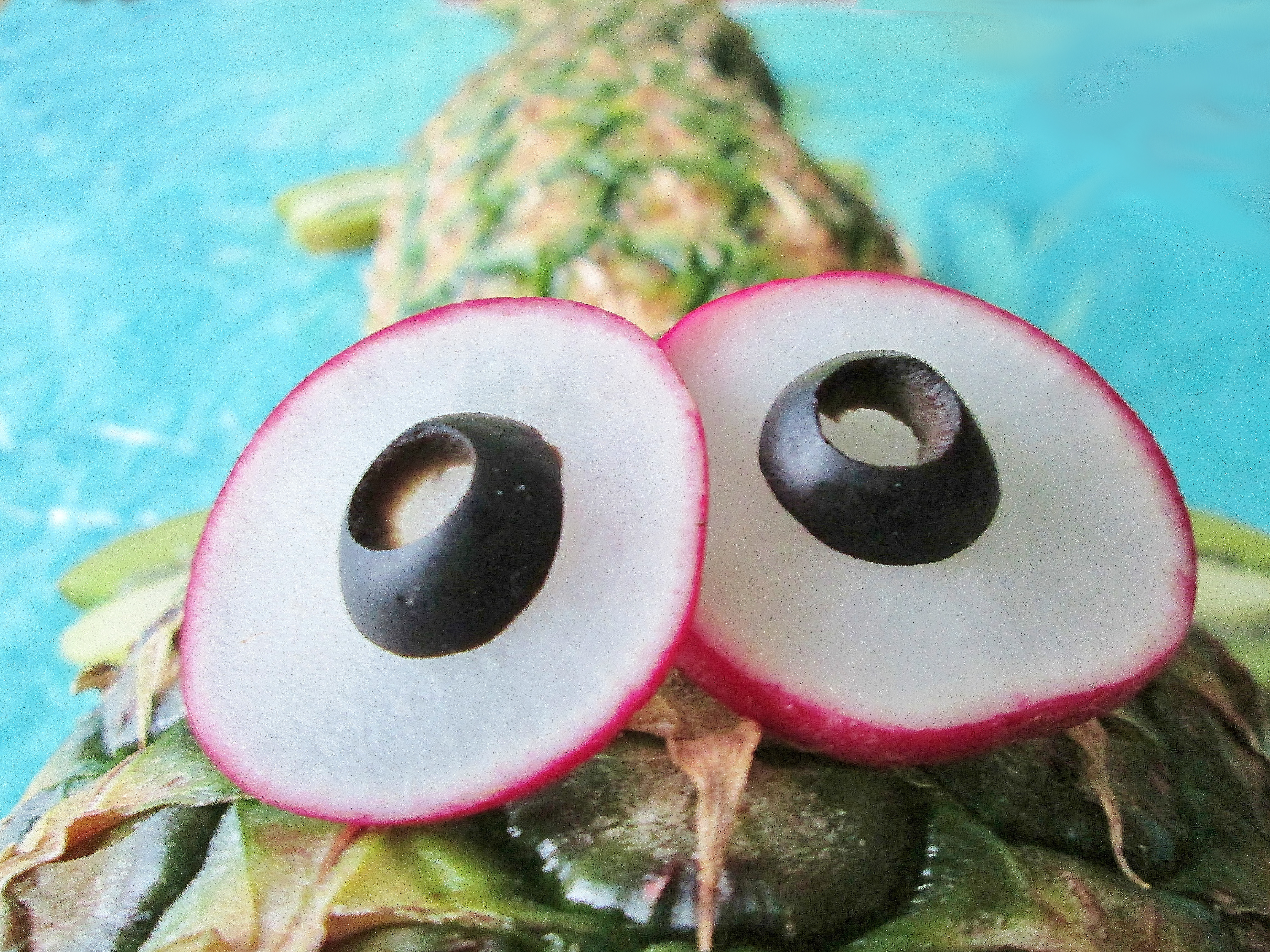 - Slice your radish into thin circles. Choose two slices of similar size to be the base for your eyes. Take a look at your remaining two olives: one end of each olive should have an open circle, the other an “x” shape. Slice off the “open” ends—these are now olive rings. Place the rings on your radish bases. You’ve got eyes!