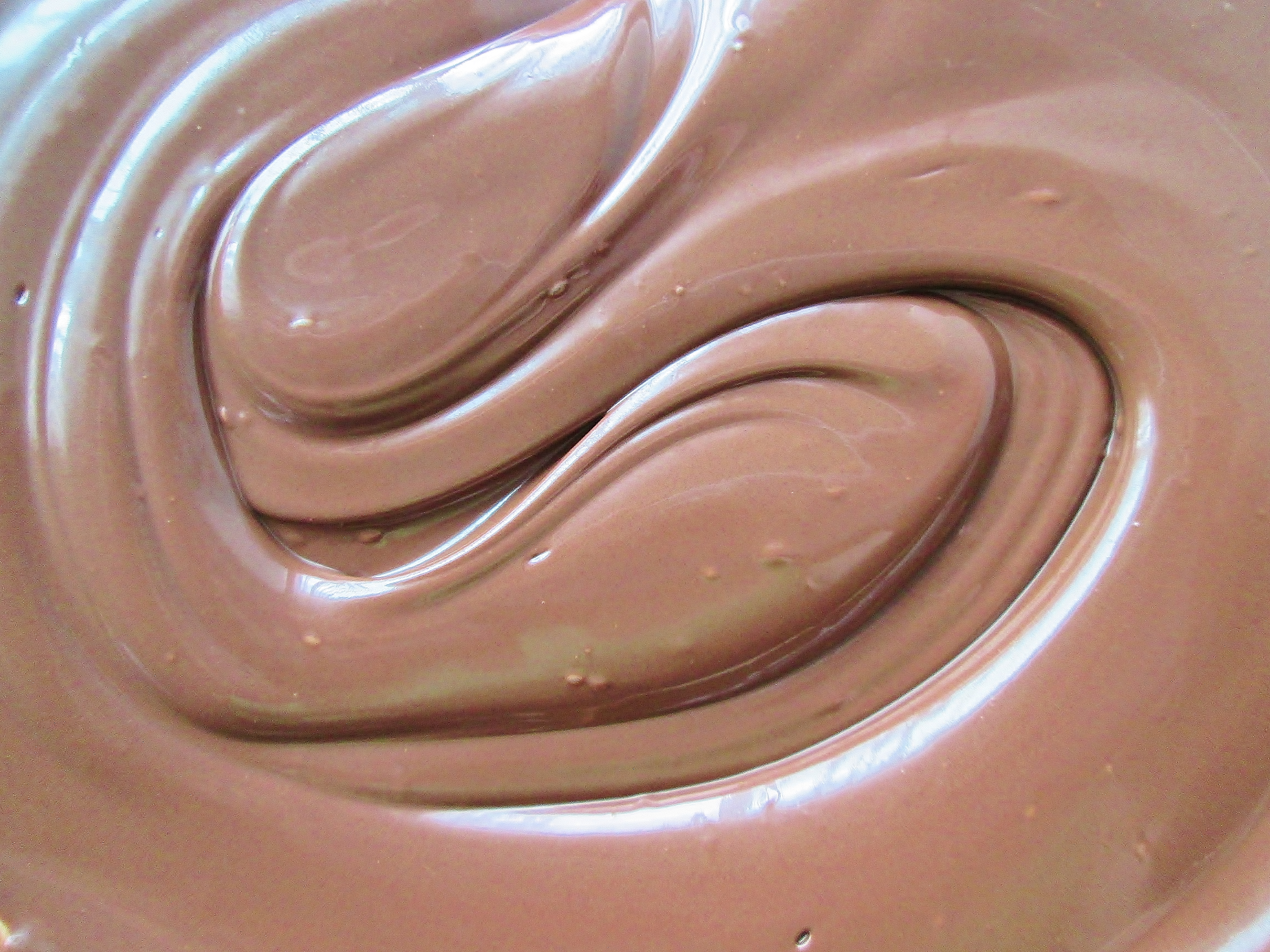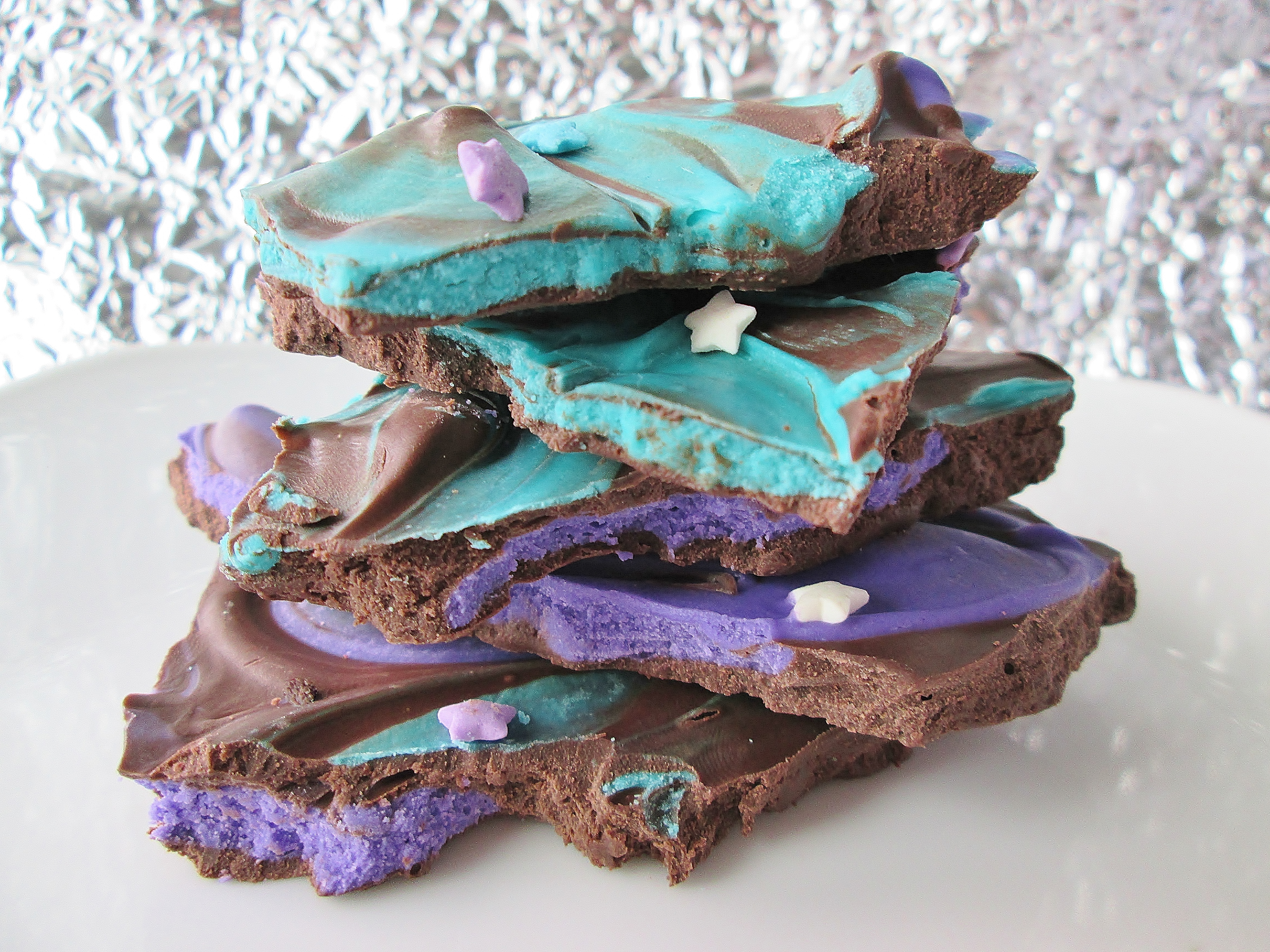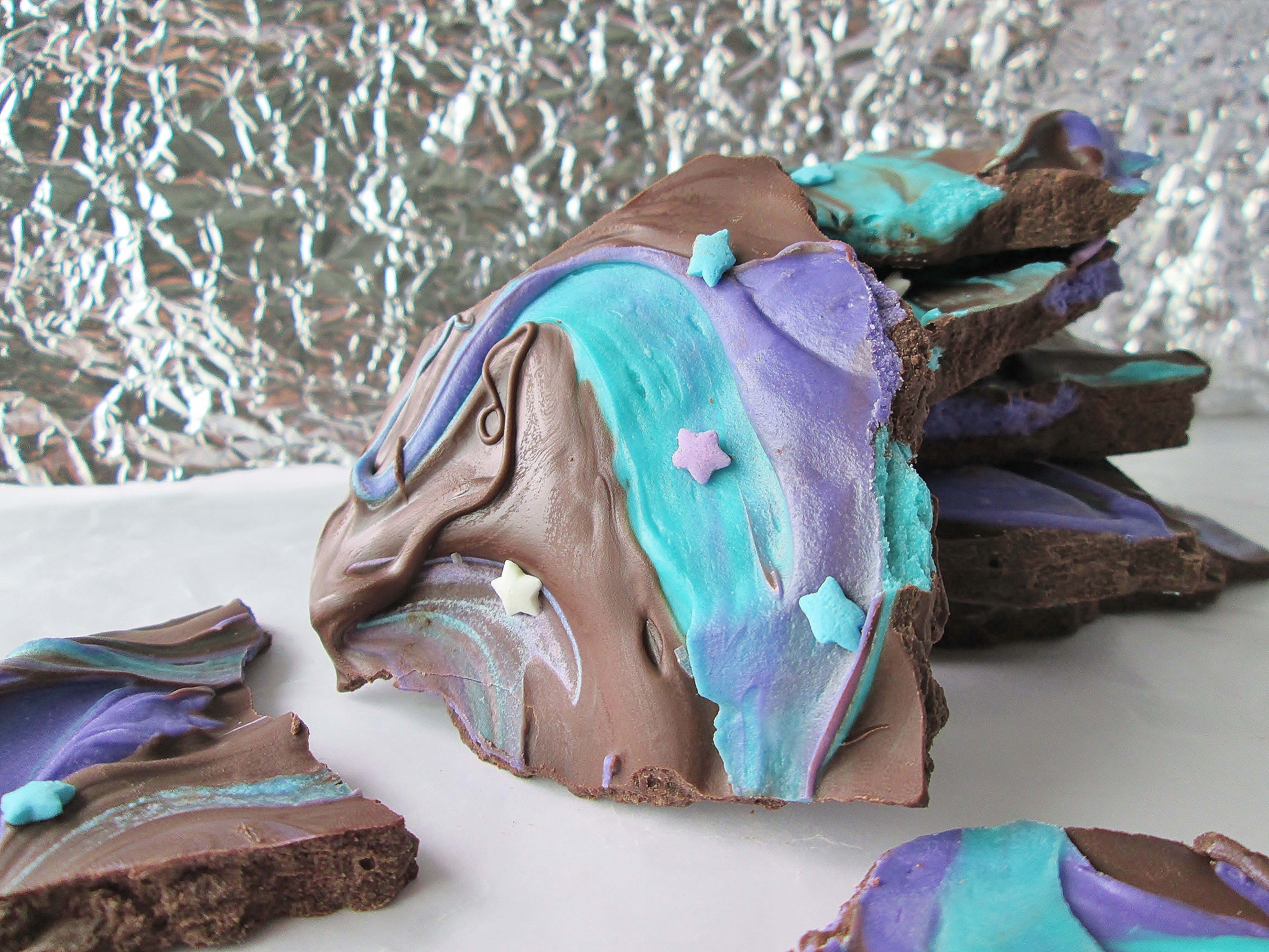 - Pour the dark chocolate onto a wax paper lined baking sheet, spreading it out into a 10″ circle with a fork. Add 9 dollops of the purple and teal chocolate across the surface of the circle, alternating the colors. Swirl each dollop one or two times with a butter knife, wiping the knife clean when you go to swirl a different color. NOTE: Limiting the number of swirls per dollop and wiping after changing colors helps ensure bright colors and distinct lines.