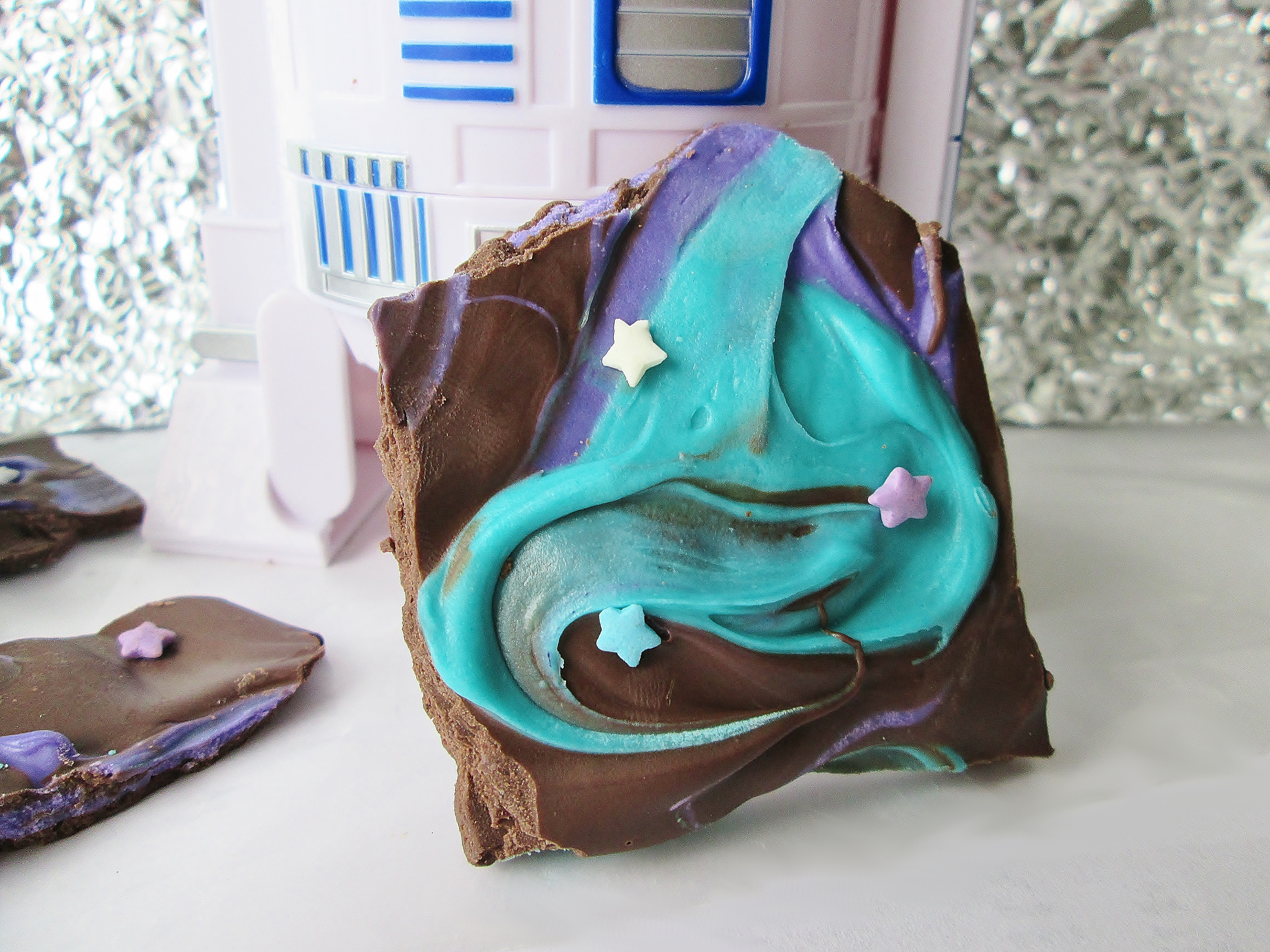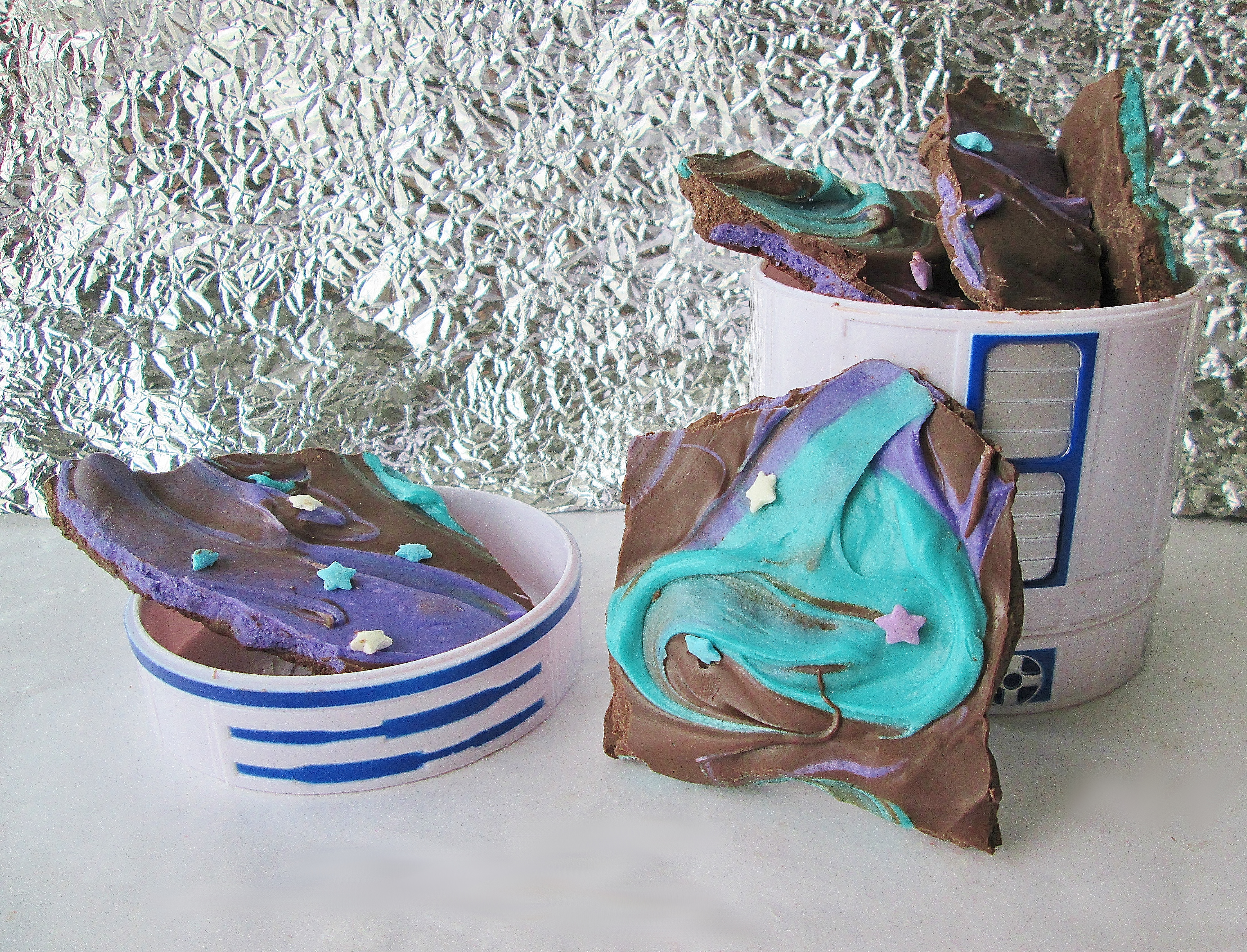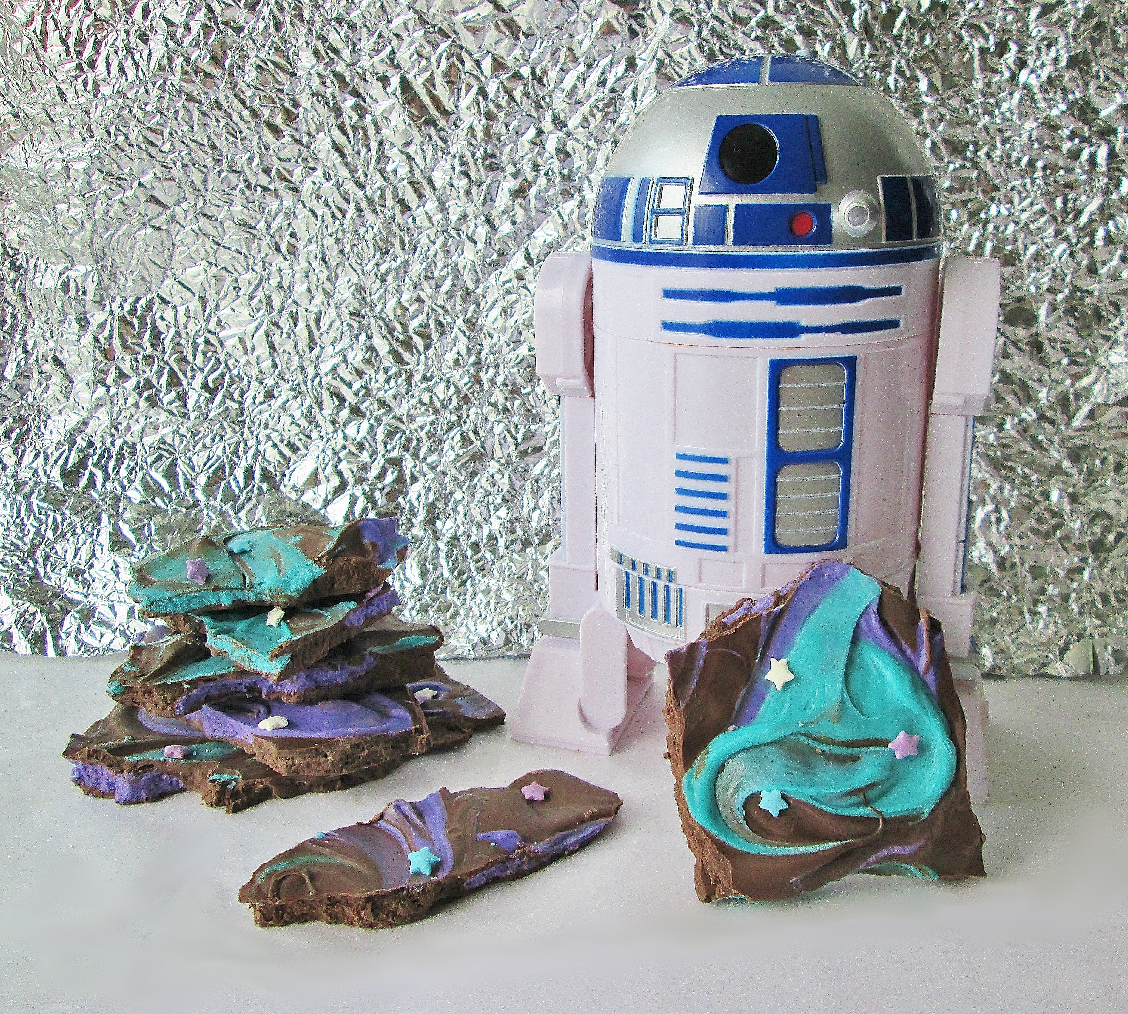 I was really torn as to what to make for our Star Wars bonus recipe. Should I make another molecular gastronomy recipe? A skillet cookie Death Star? Admiral Ackbar’s “It’s a Trap” Wraps? In the end, I decided on this fun, easy Galaxy Bark from Life with the Crust Cut Off. Gotta love those funky colors…and the extra texture element added by the sprinkles! Plus, it’s chocolate, which of course directly translates to SUPER DELICIOUS. Enjoy!