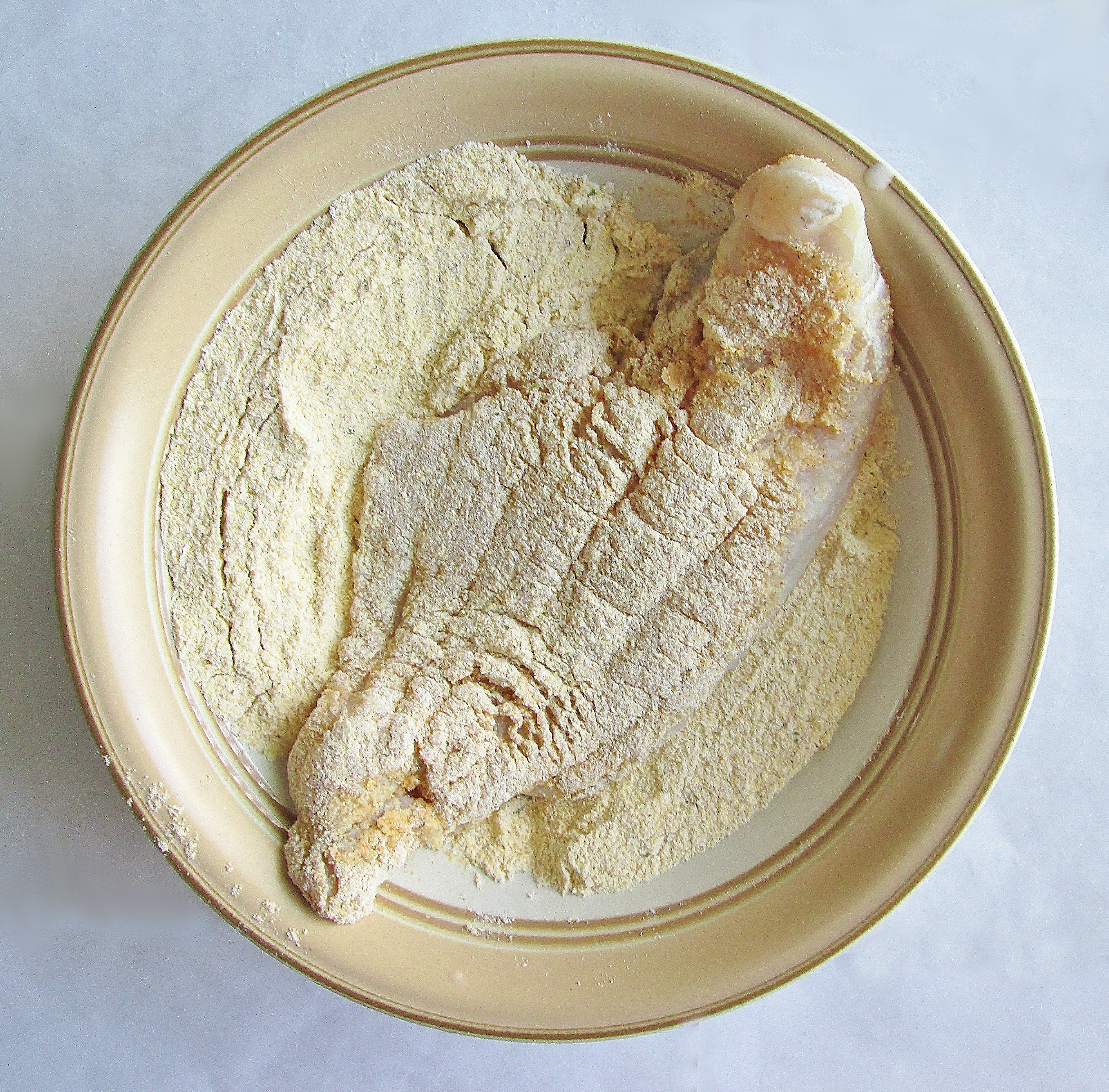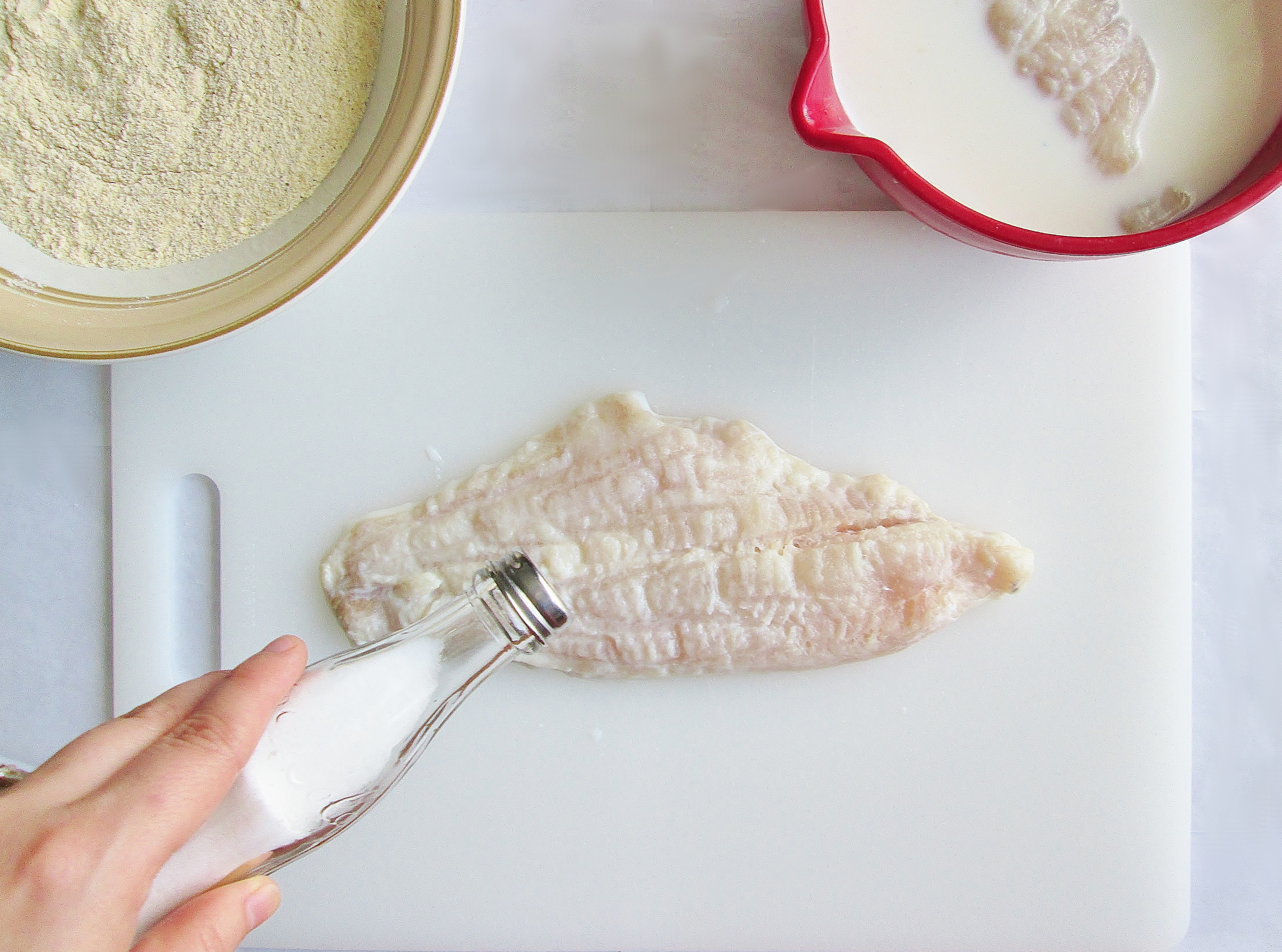 - When the oil reaches 350° or the flour mix sizzles when you flick a bit into the oil, remove your first fillet from the milk. Sprinkle it with salt and dredge it through the flour mix.