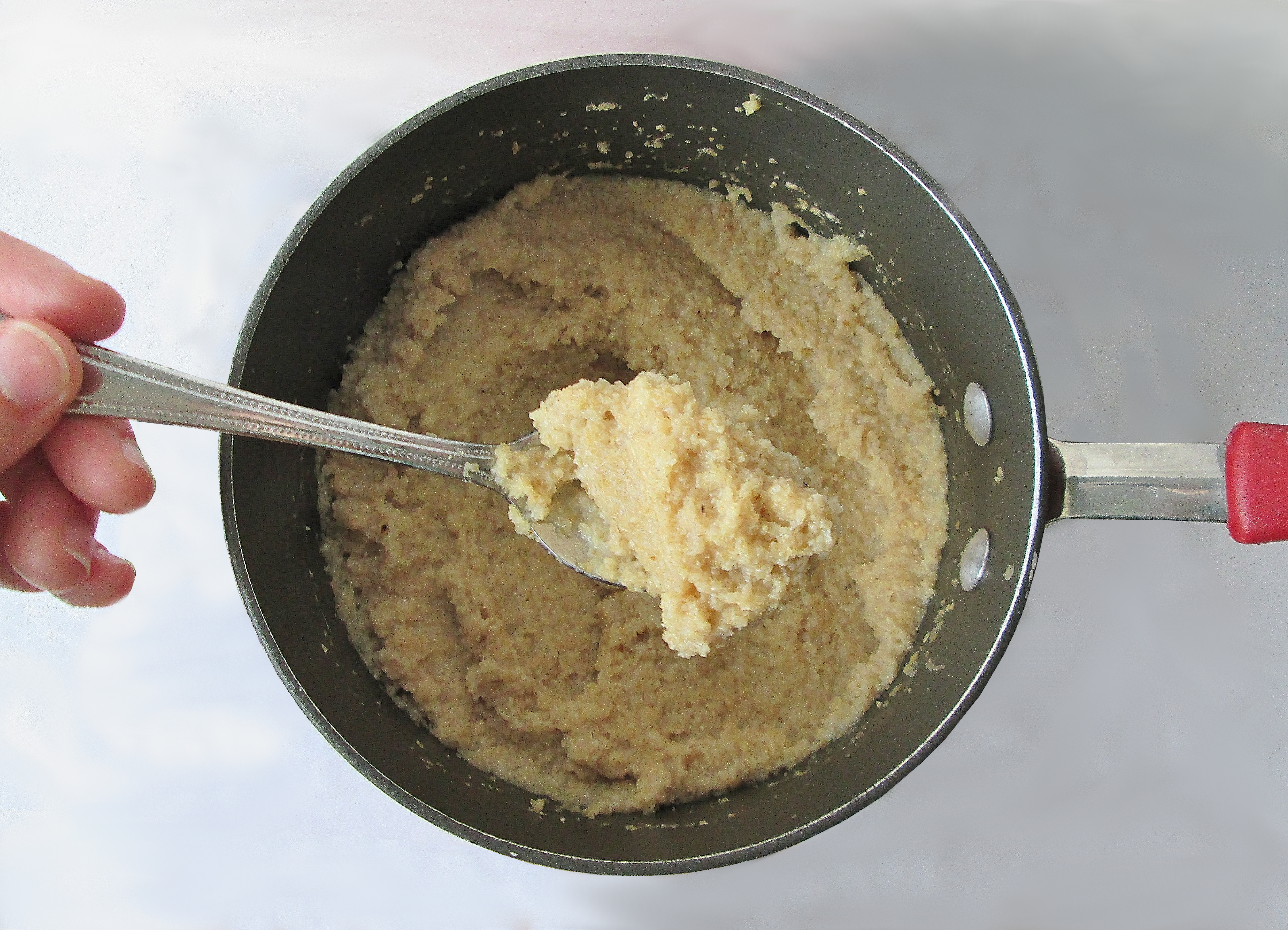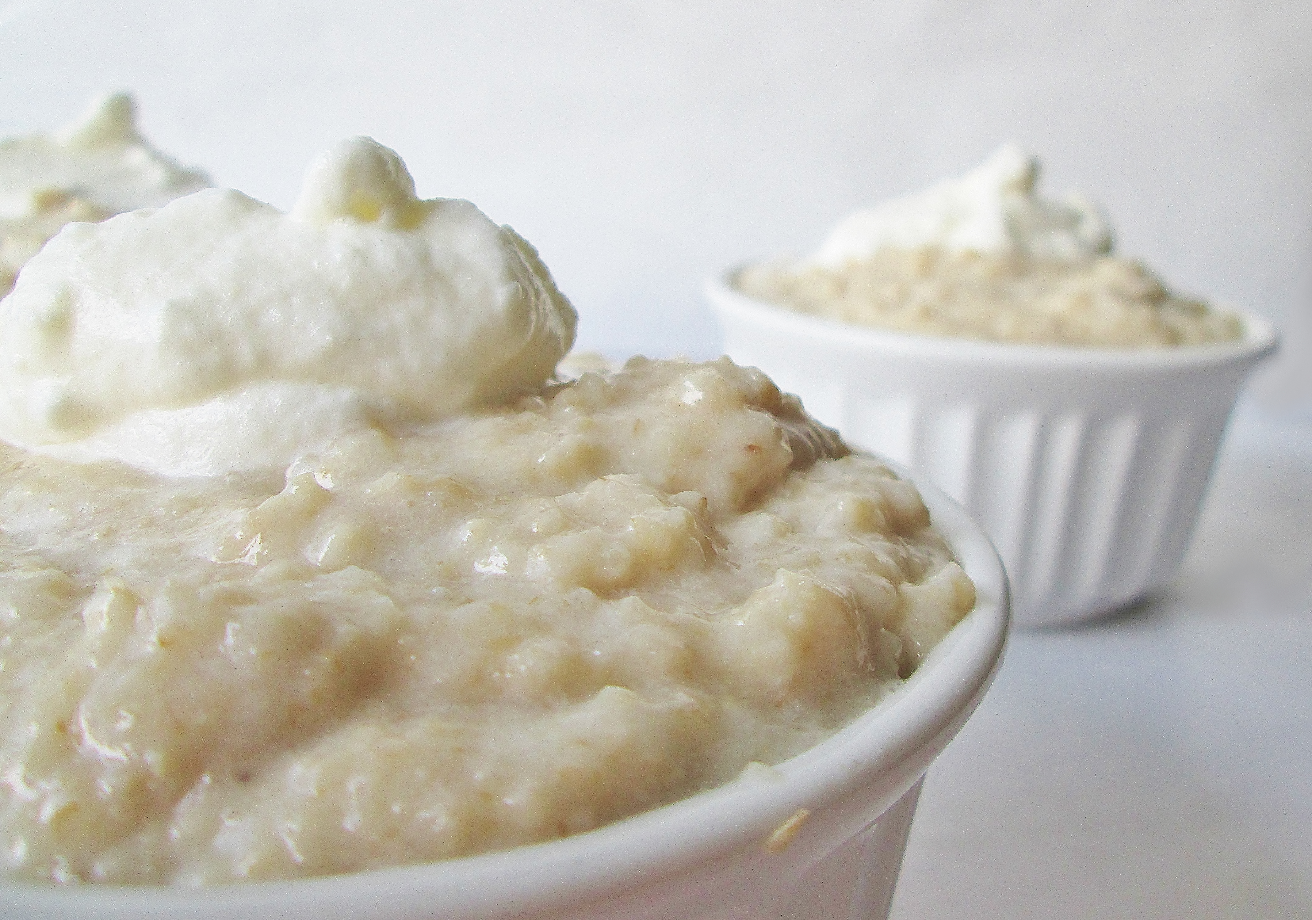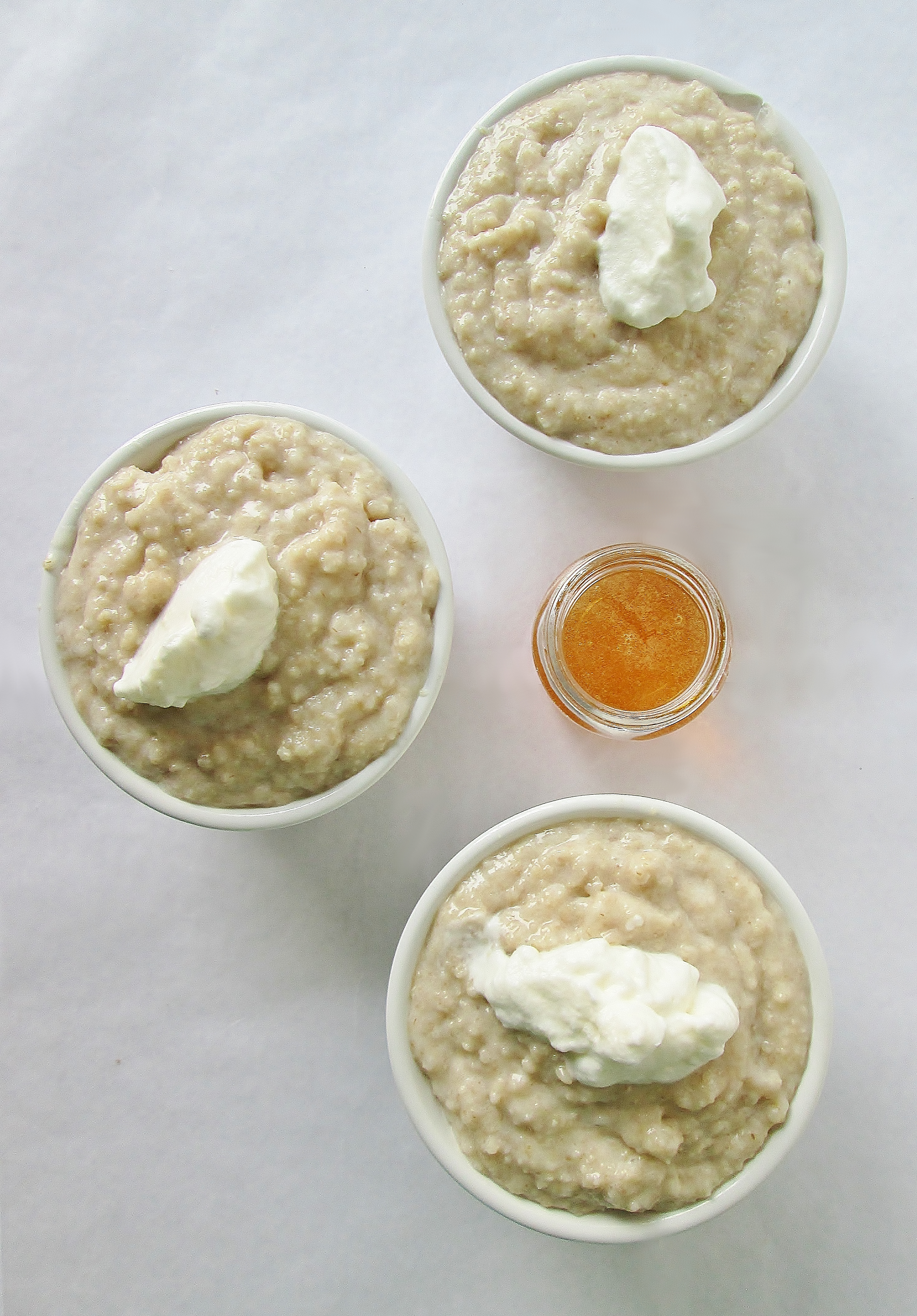 This looks a little like stiff peaks because I’ve got the whisk pointed down, but the tip curled if I held it upright. If you want, you can whip until you get stiff peaks, but they’re not really necessary for this recipe. More on the difference between soft and stiff peaks here. - When your water boils, stir your oat bran, honey, and vanilla into the pan. Continue to cook and stir for 3 minutes (the porridge will be thick and have a slightly grainy texture). When it’s finished, turn off the heat and stir in 1 cup of the whipped cream. This will give the porridge a sweet, creamy flavor and give it a texture like slightly thin oatmeal.