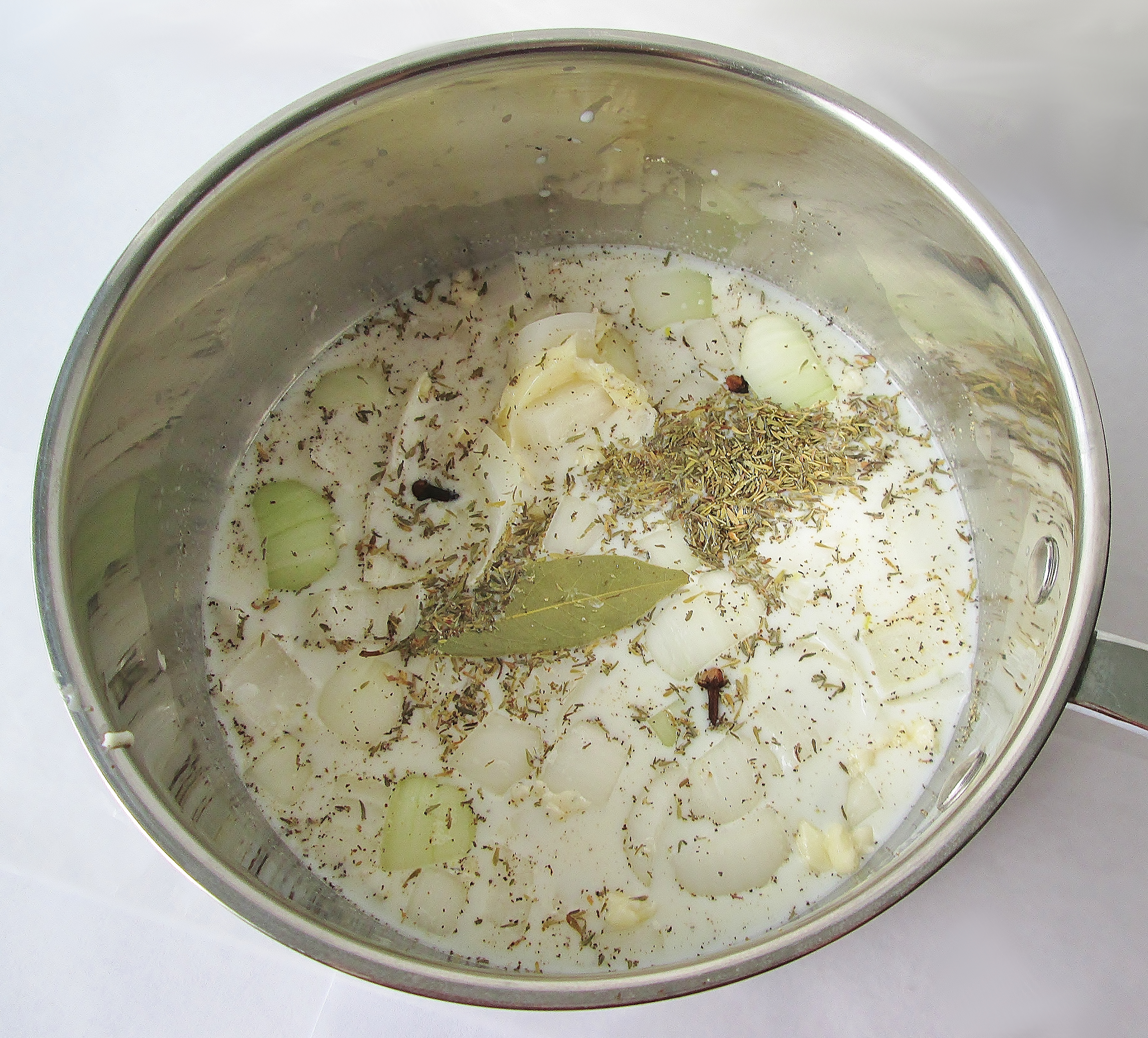 The extra 5 minutes at a higher heat adds more color and crispiness to the skin. - After your chicken has been cooking for about 20 minutes, start working on your bread sauce. Combine your milk, butter, onion, cloves, pepper, garlic, bay leaf, and thyme in a saucepan. Let it simmer for 20 minutes, stirring regularly to keep it from developing a film on top.