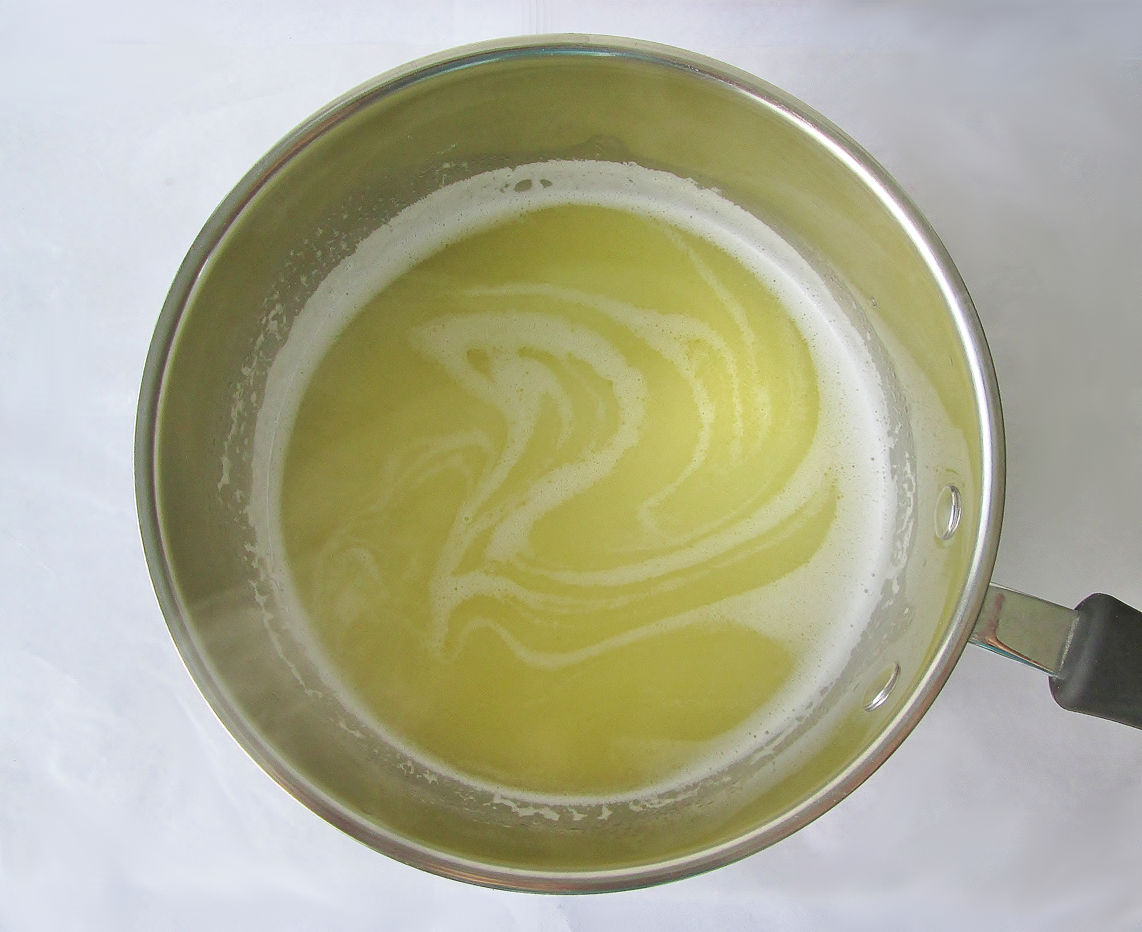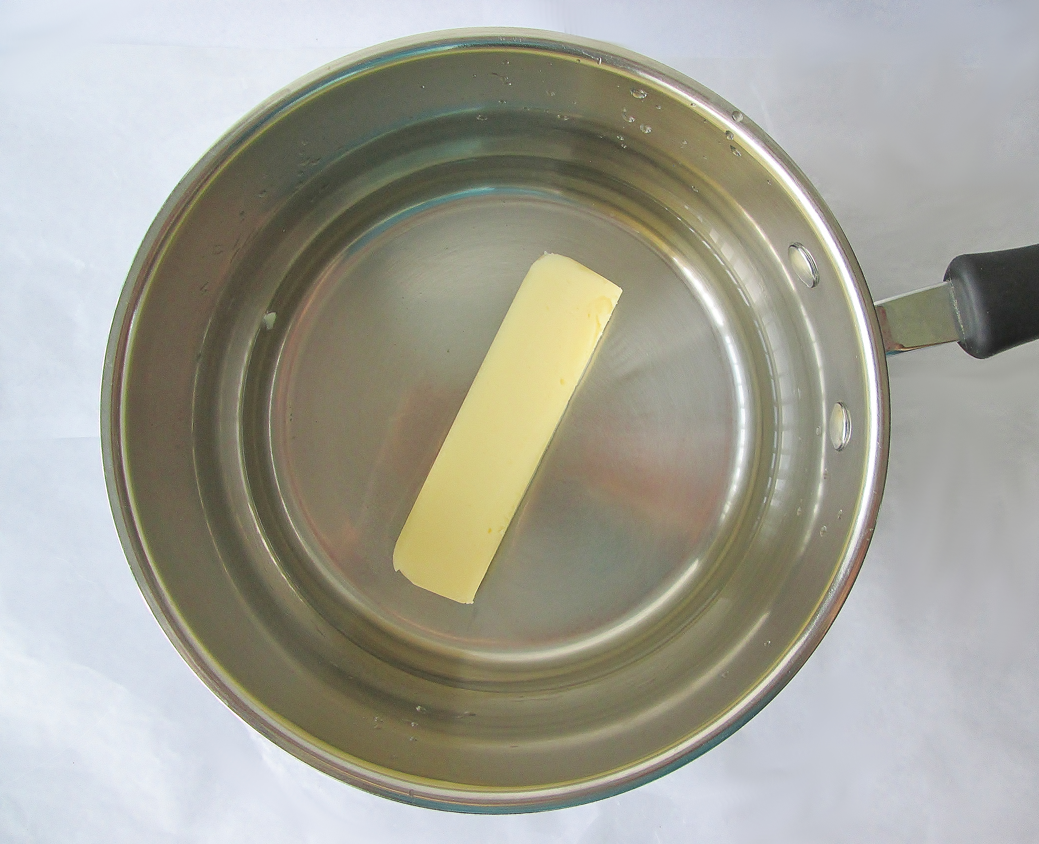 - Melt the butter, water, and salt together in a large saucepan on low heat. Then turn up the heat to medium and bring it to a boil.