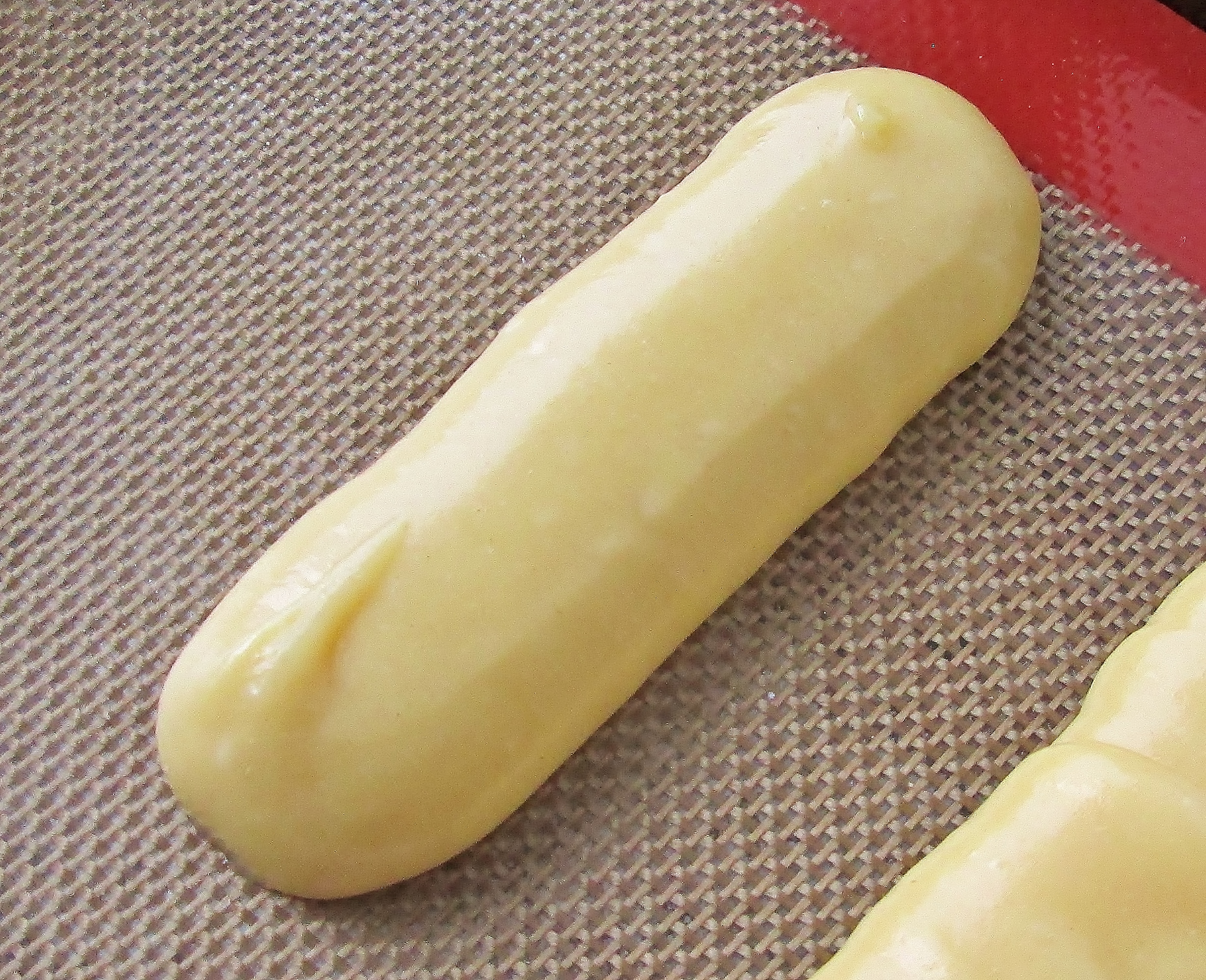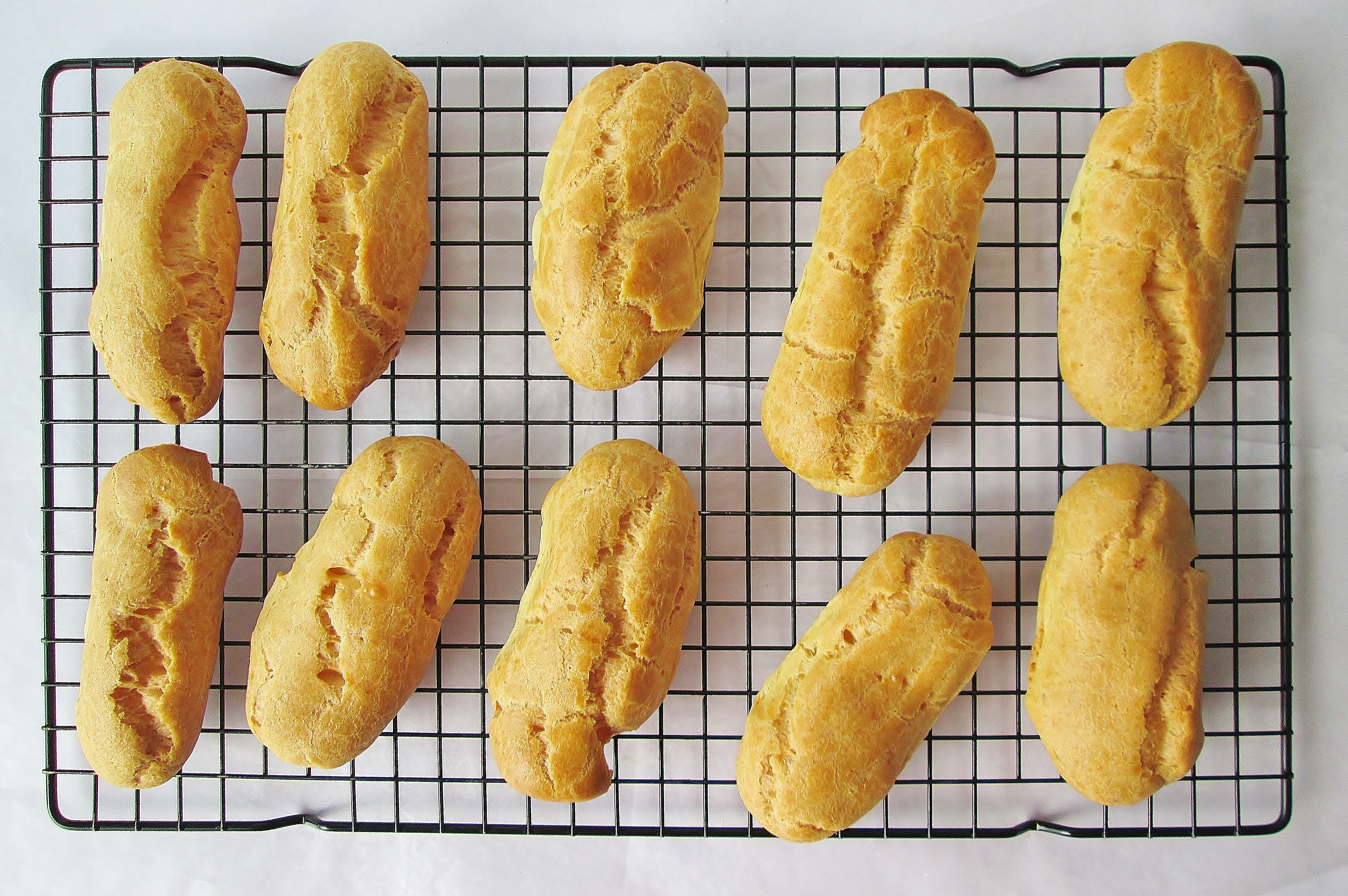 - Fit a piping bag with a 1/2 inch round tip and fill the bag with the dough. Pipe 8 4-inch long lines on each prepared baking sheet, placing them 2 inches apart. Place one baking sheet on the top wrack and one on the bottom. Bake for 20 minutes, then turn the heat down to 350°. Rotate the sheets top to bottom and front to back, baking for another 20 minutes. Turn off the oven and let the sheets sit inside for 10 minutes. Move the pastries to a wire wrack to cool.