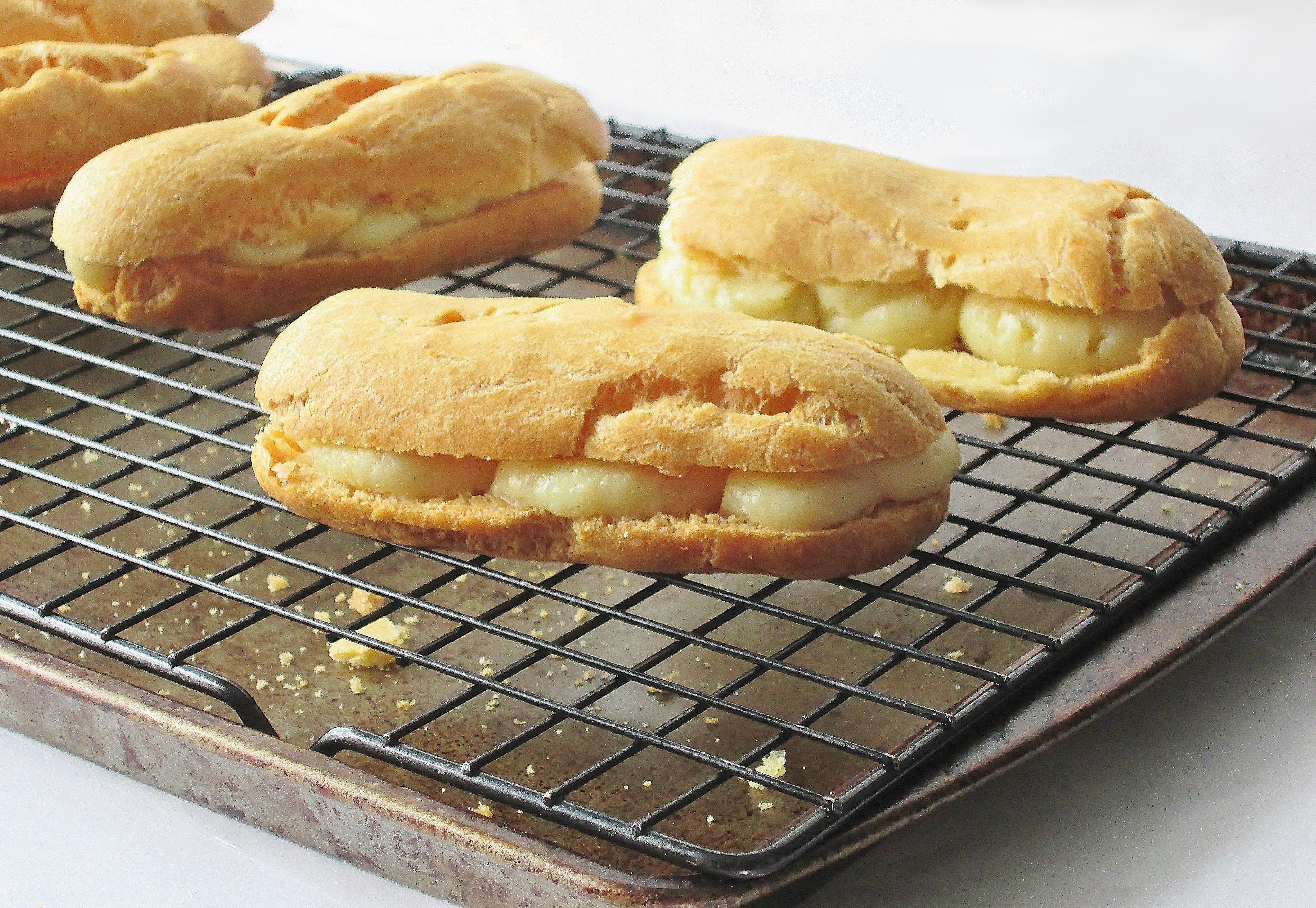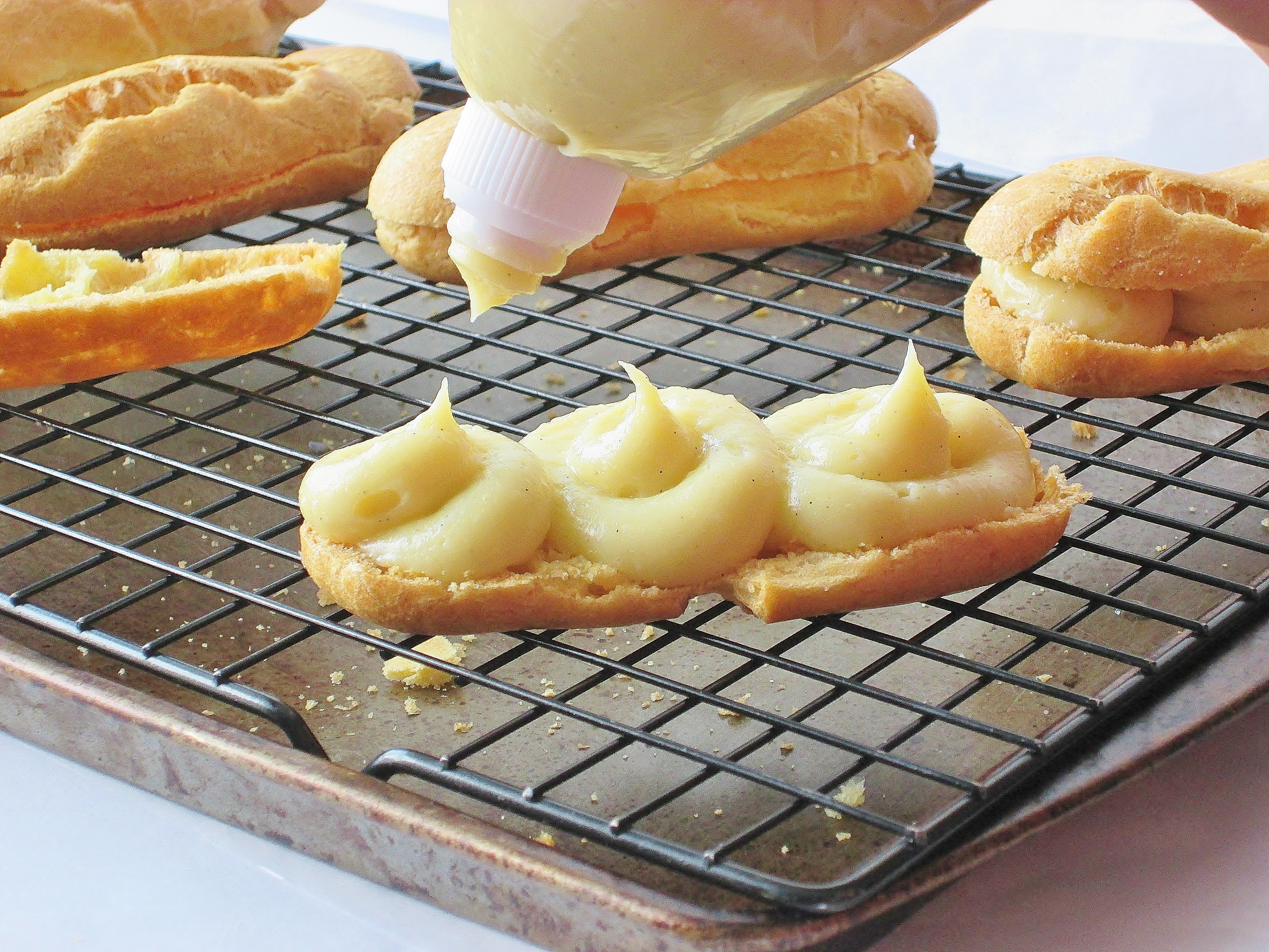 - When the pastry cream is fully cooled, give it a quick whisk and transfer it to a piping bag fitted with a 1/2 inch round tip. Pipe 3 large swirls onto the bottom half of each pastry and place the second half on top.