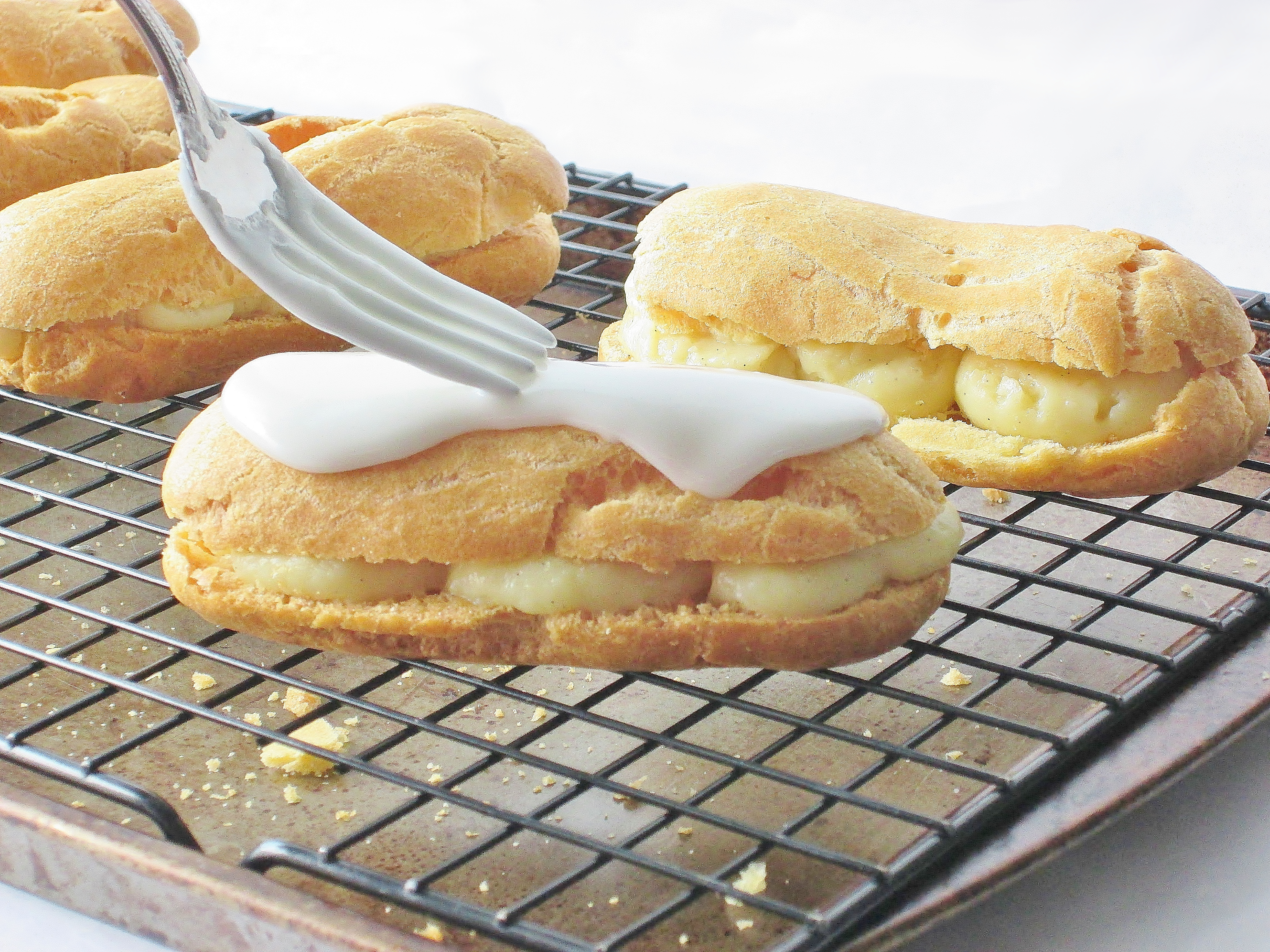For our Secret Garden menu, I wanted to make a truly elegant dessert. Eclairs (one of my greatest weaknesses) immediately sprang to mind. Of course, they needed to fit the theme of the story, and what better way to tie in the garden than adding a little floral touch? Thus, these lavender lemon eclairs were born! I’m not normally into flower-flavored things, but I found these to be light, sweet, and fragrant in all the right ways. The lavender-infused pastry cream perfectly complements the lemon glaze. I used a pate a choux (that’s pastry dough) recipe from Flavor the Moments and made a variation on a pastry cream recipe from Ricón Cocina. Enjoy!