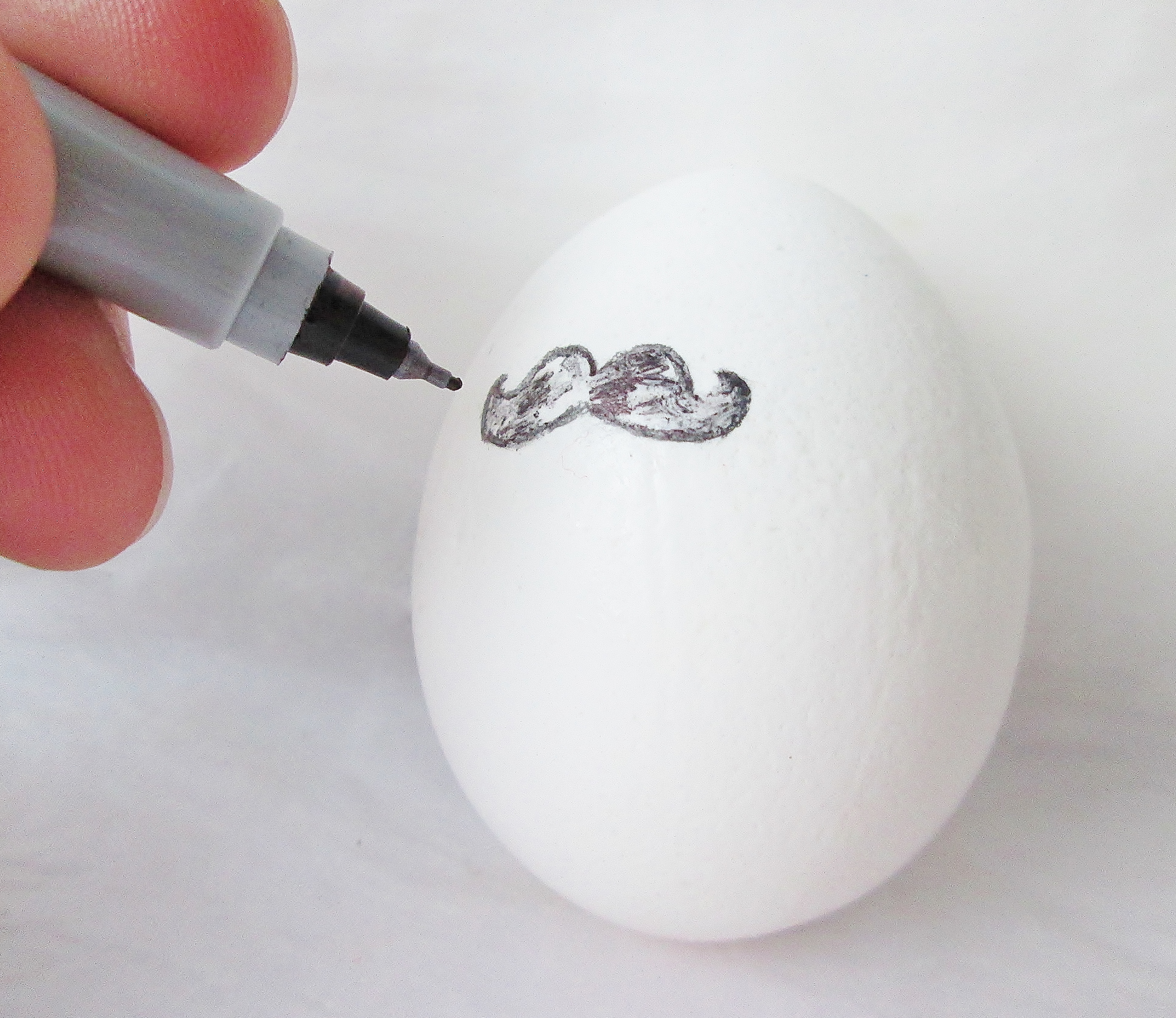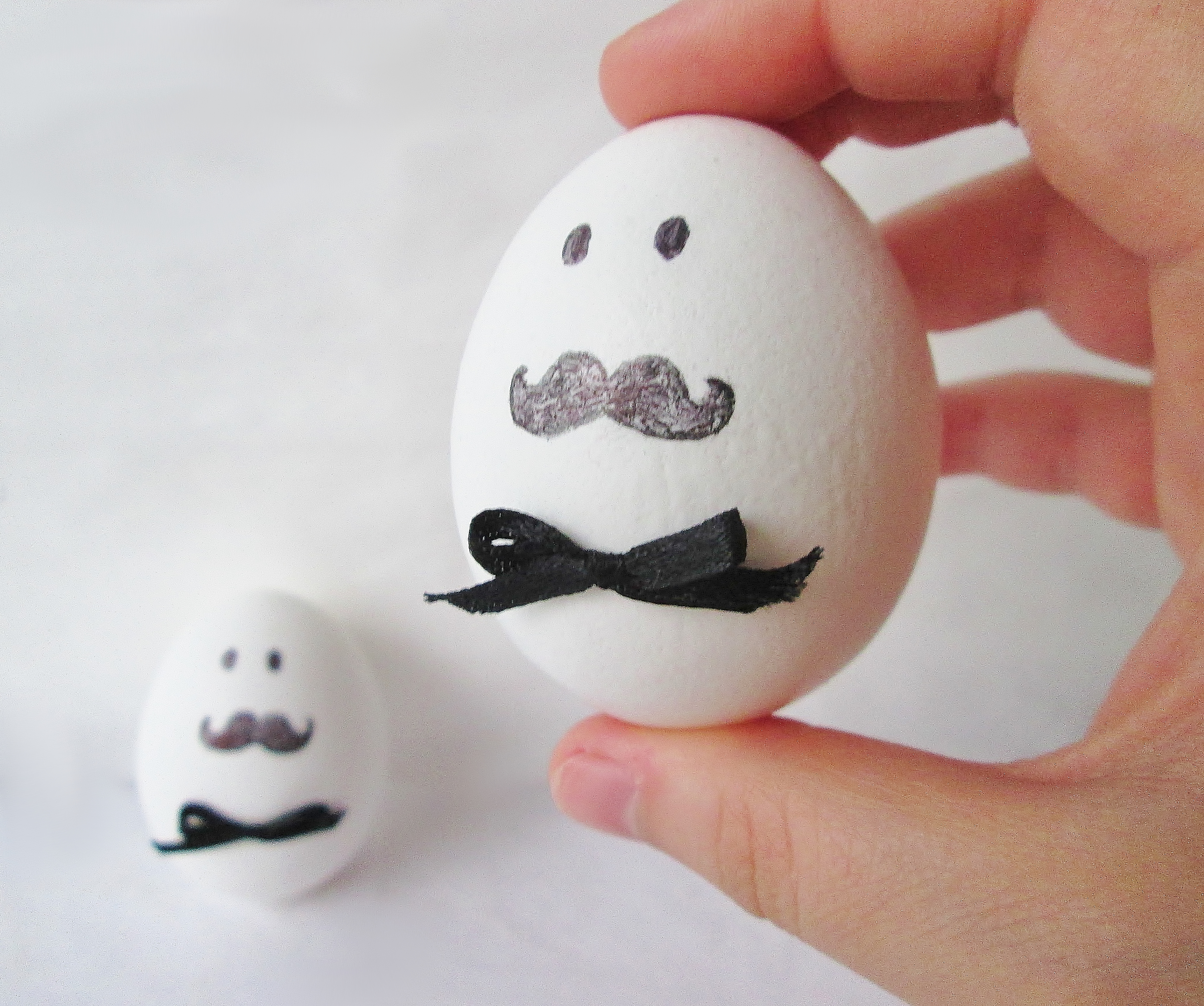 - While you wait, decorate your eggs. I used a fine-tipped black Sharpie to draw the mustaches and eyes, but make sure the egg is room temp before you start (otherwise the egg will sweat, and the marker won’t draw properly). Tie little bows out of thin black ribbon and use a dot of super glue to fix them onto the eggs.