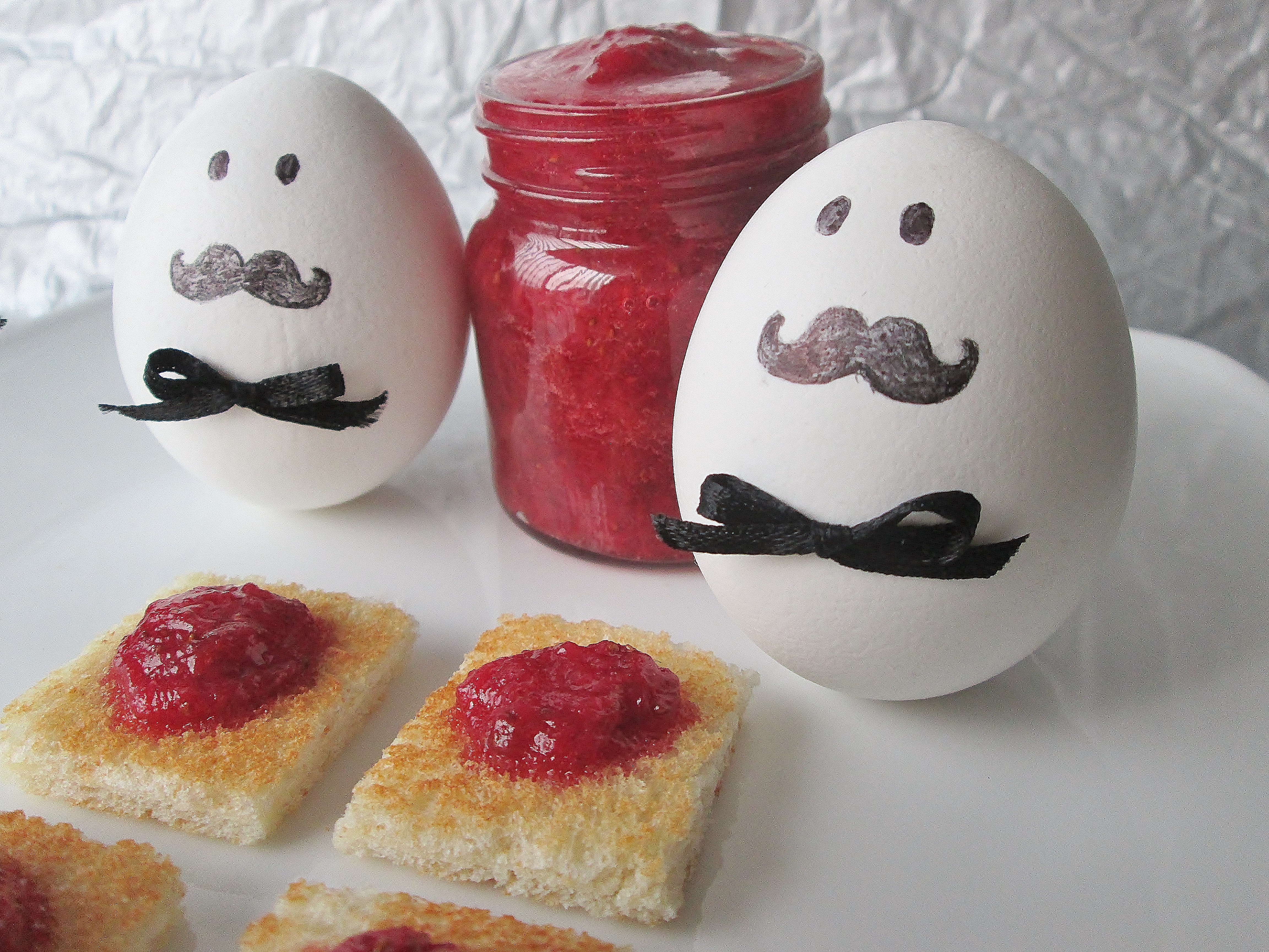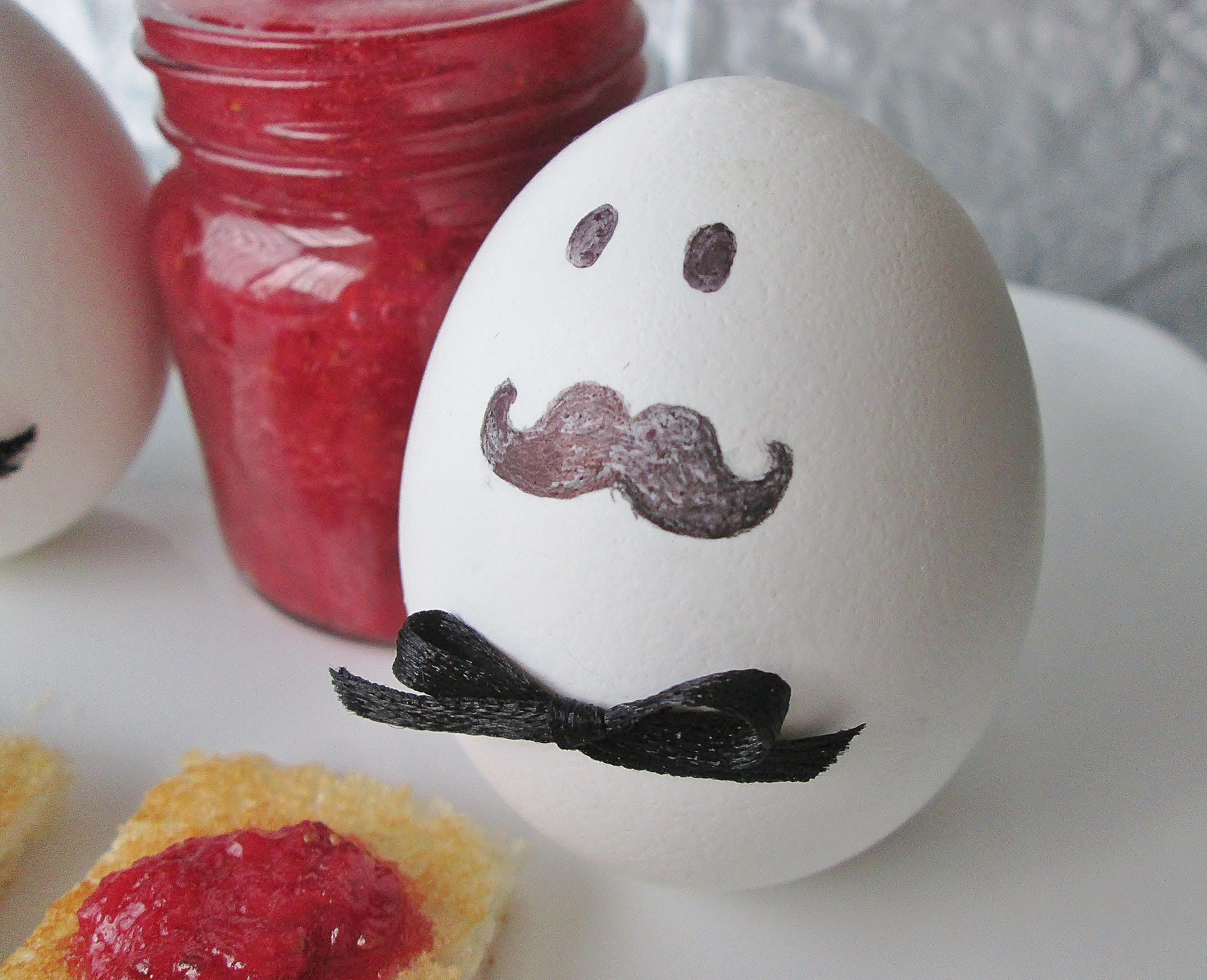 Our first dish will delight Hercule Poirot fans. We’re making Poirot’s breakfast! Every single morning the detail-oriented detective eats the same thing: two symmetrical boiled eggs and a piece of toast cut into perfect squares, trimmed of crust. And in the TV show, the toast squares are topped with perfect circles of jam. We made our own jam using this recipe and decorated the eggs to look like the famous detective himself (after all, he’s said to have a head shaped just like an egg). I’m sure Poirot would find this breakfast to be tres magnifique!