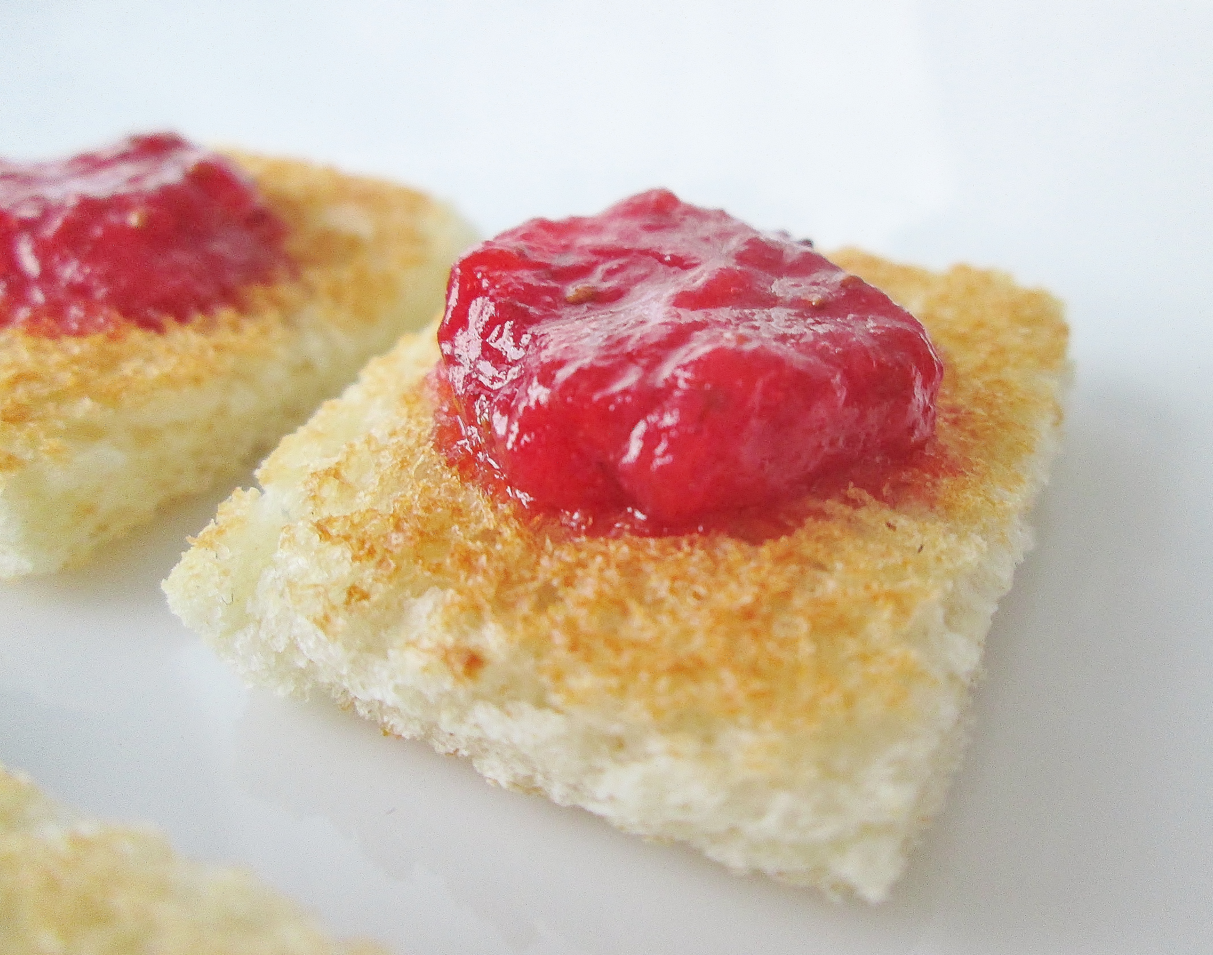 The books don’t say exactly how many toast squares Poirot eats, but we do know all the squares come from one piece of toast. In the show, he has 9 squares, but my bread slices weren’t nearly big enough for that. - When your jam is cool, spoon it into a sandwich bag. Seal the bag and cut off one of the corners. Pipe 4 identical circles of jam into the exact center of your toast squares.