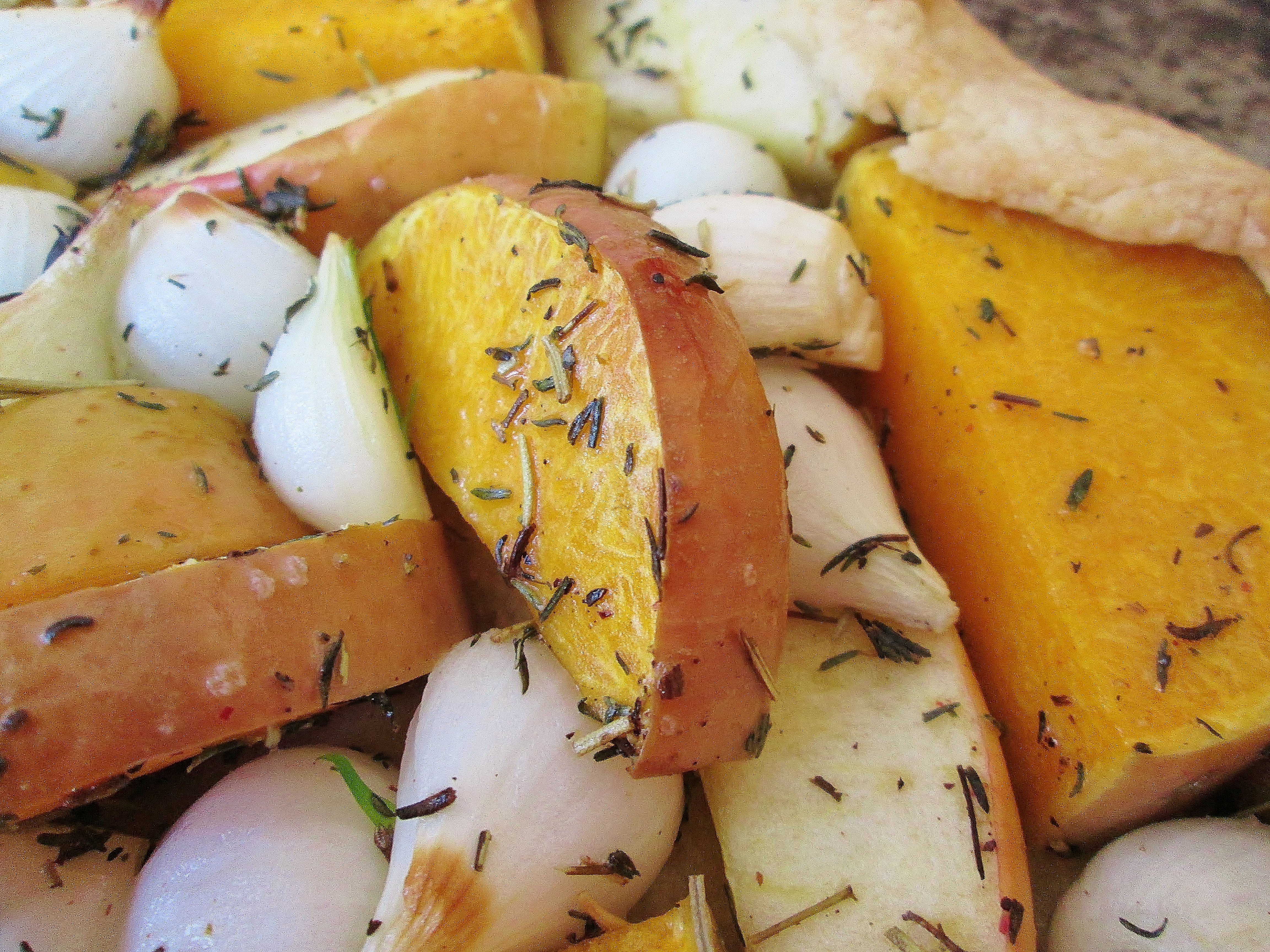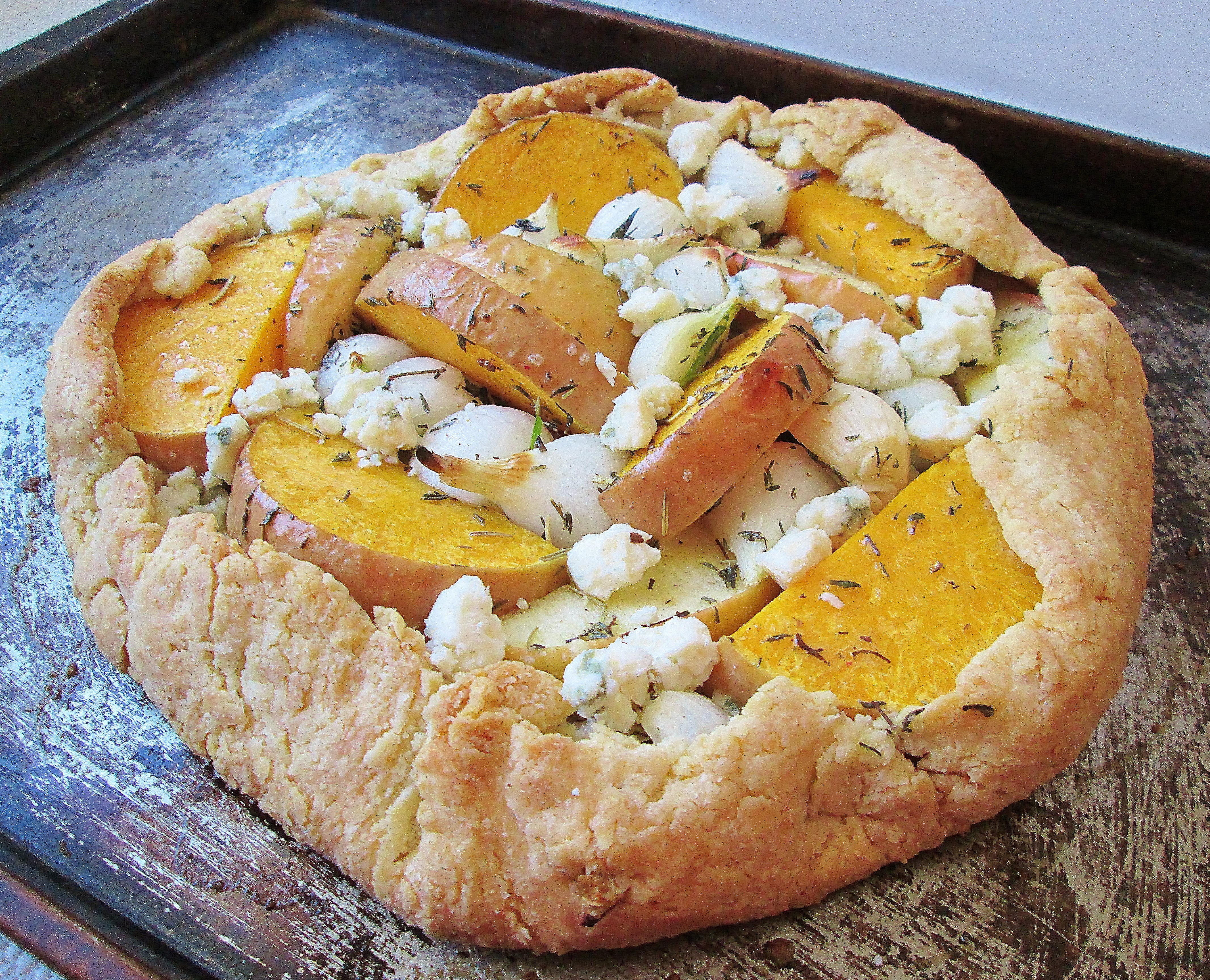 I like to roll the dough out on a cutting board so I can just flip it over onto the baking sheet. Just make sure your board is thoroughly floured first, so the dough doesn’t stick when you try to flip it. - Starting 2 inches from the edge of the dough, alternate adding pieces of squash, apple, and onion in concentric circles until you reach the center of the dough. Casually fold and pleat the edges of the dough over the outermost portion of the filling. Fill any gaps in the filling with extra pieces of apple, squash, or onion.