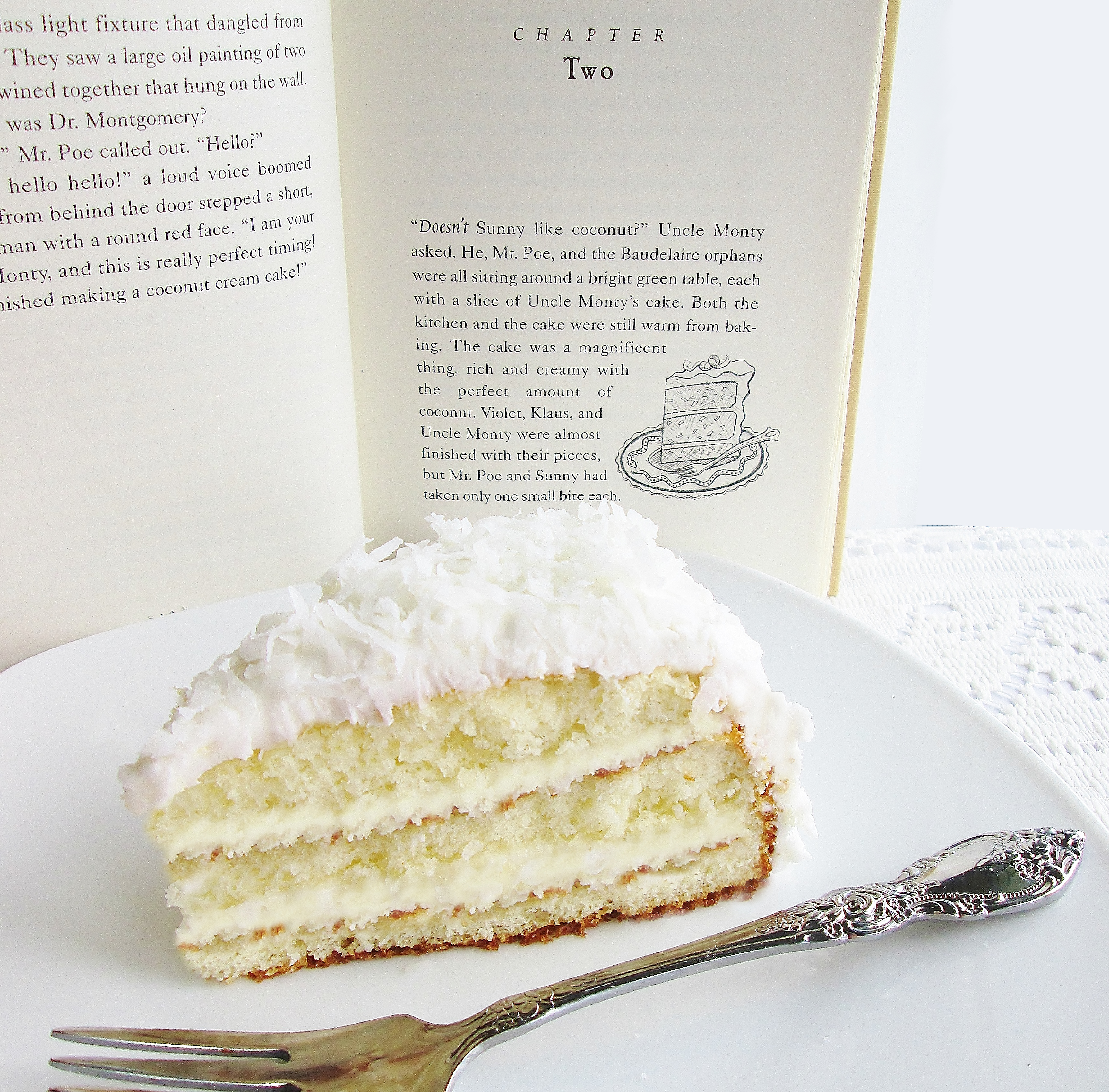 “He, Mr. Poe, and the Baudelaire orphans were sitting around a bright green table, each with a slice of Uncle Monty’s cake. Both the kitchen and the cake were still warm from baking. The cake was a magnificent thing, rich and creamy with the perfect amount of coconut.”