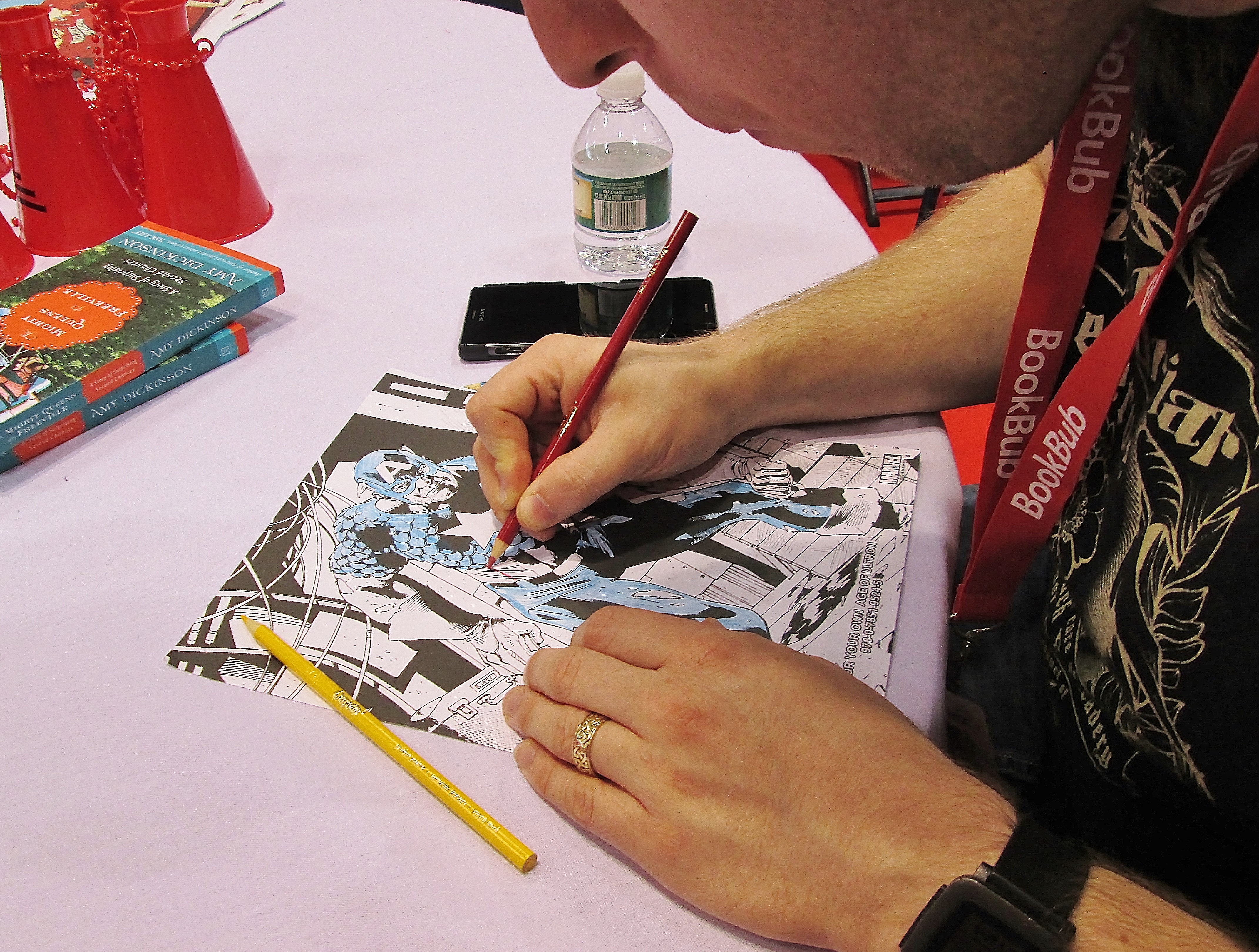 We relaxed, refueled, and colored some pictures of Captain America. Then we went out to do our final run of the show floor, where I picked up The Beautfiul Thing That Awaits Us All by Laird Barron—a Bram Stoker Award winner—from the Skyhorse Publishing booth!