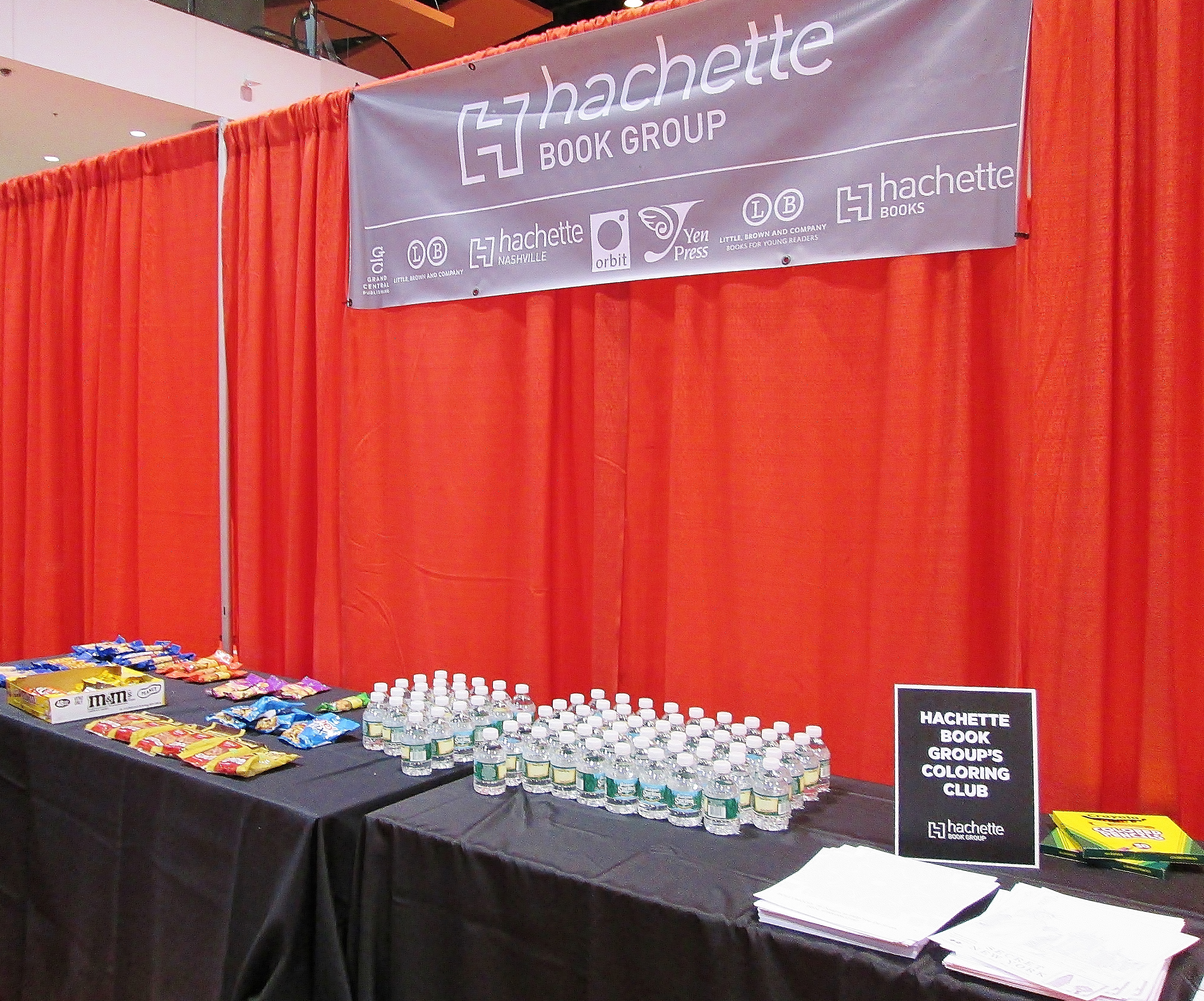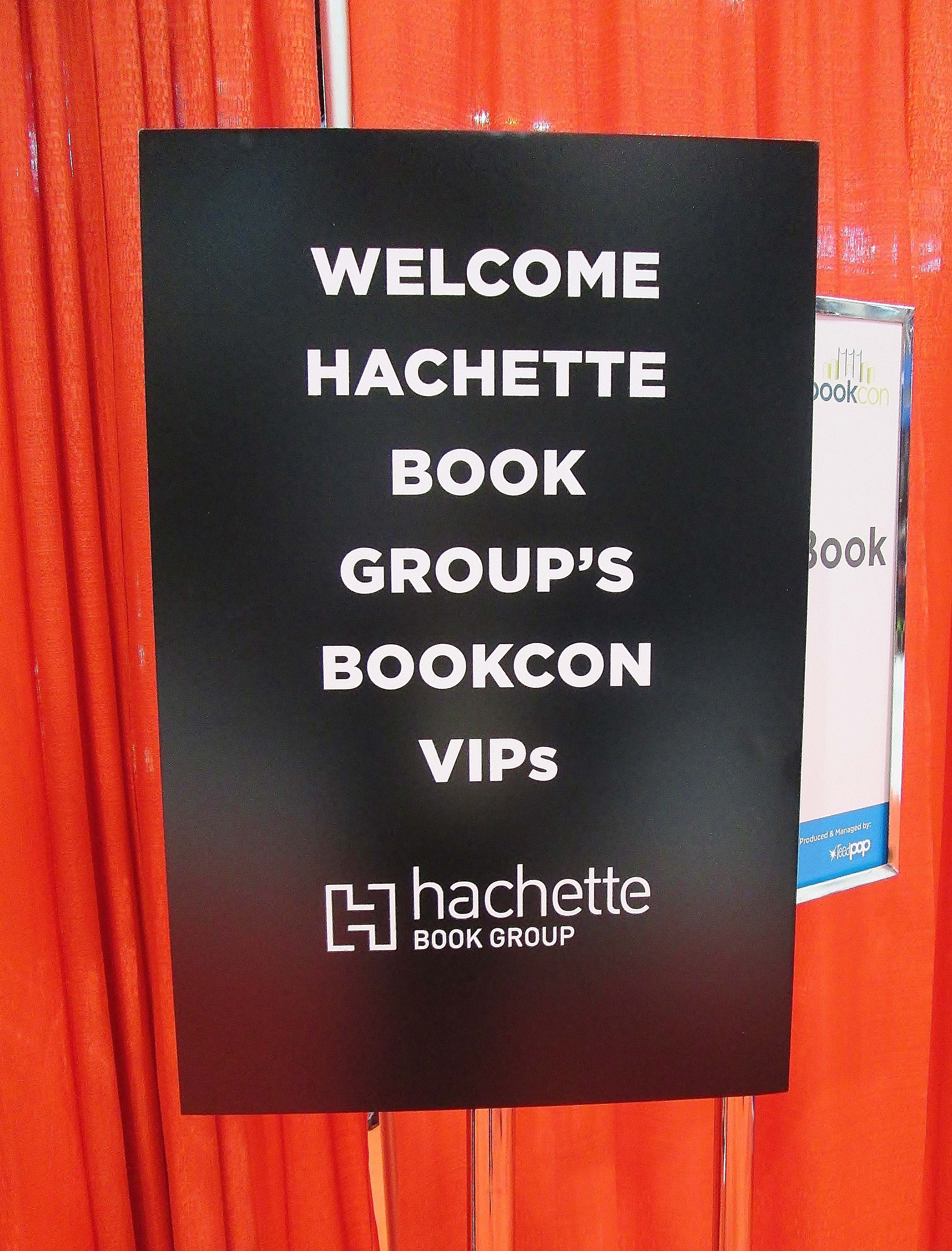 When I ordered our BookCon tickets a couple months ago, there was a drawing for free VIP passes to the Hatchette Publishing private lounge, and we won one! We stopped by after our preliminary run through the show floor, and I gotta say it was pretty awesome to have an oasis of calm in the middle of the all activity. There were snacks, a coloring corner, a phone charging station, free posters and totes, and tables decorated with book displays that were free to take home.