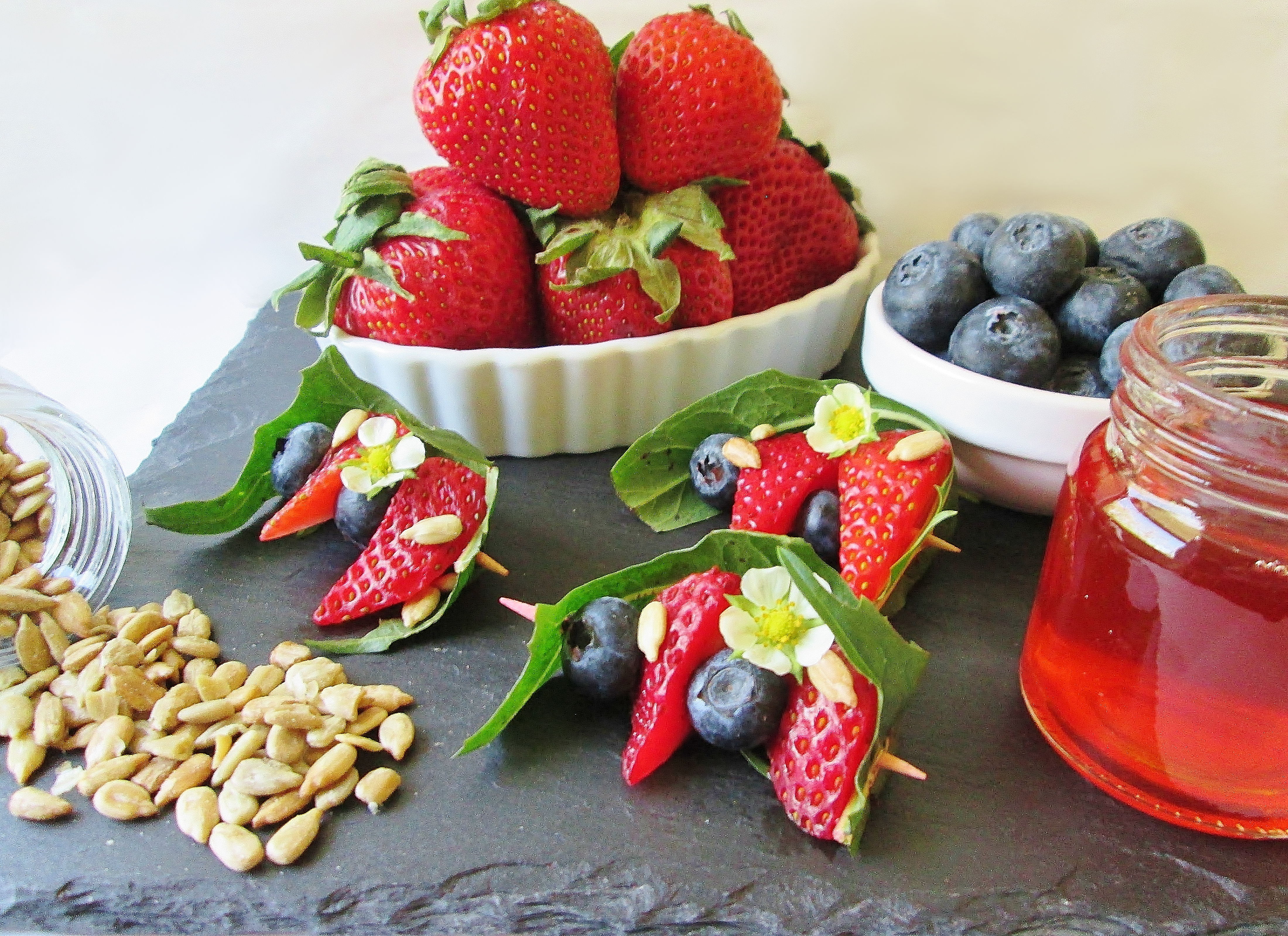 Small strawberries are best for this because you can fit little wedges more comfortably on the toothpick than big wedges. - To assemble, insert a toothpick through one end of a dandelion green and slide the green to the bottom of the toothpick. Slide a strawberry and a blueberry width-wise onto the toothpick. Then slide on another strawberry and blueberry. Insert the toothpick through the other end of the dandelion green. Depending on what kind of flowers you use, they may be sturdy enough for you to insert them on the toothpick with the berries. My strawberry blossoms were kinda delicate, so I just tucked them in beside the berries. To finish, add some sunflower seeds.