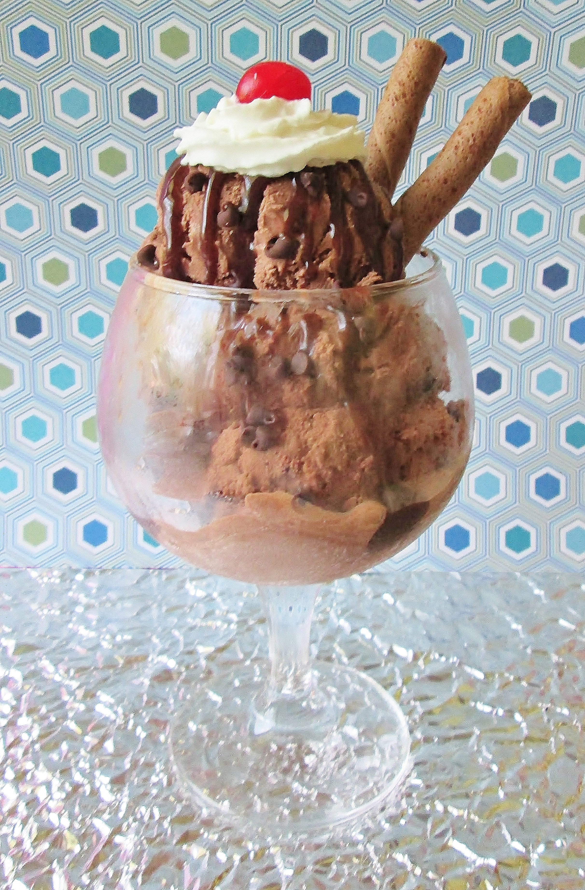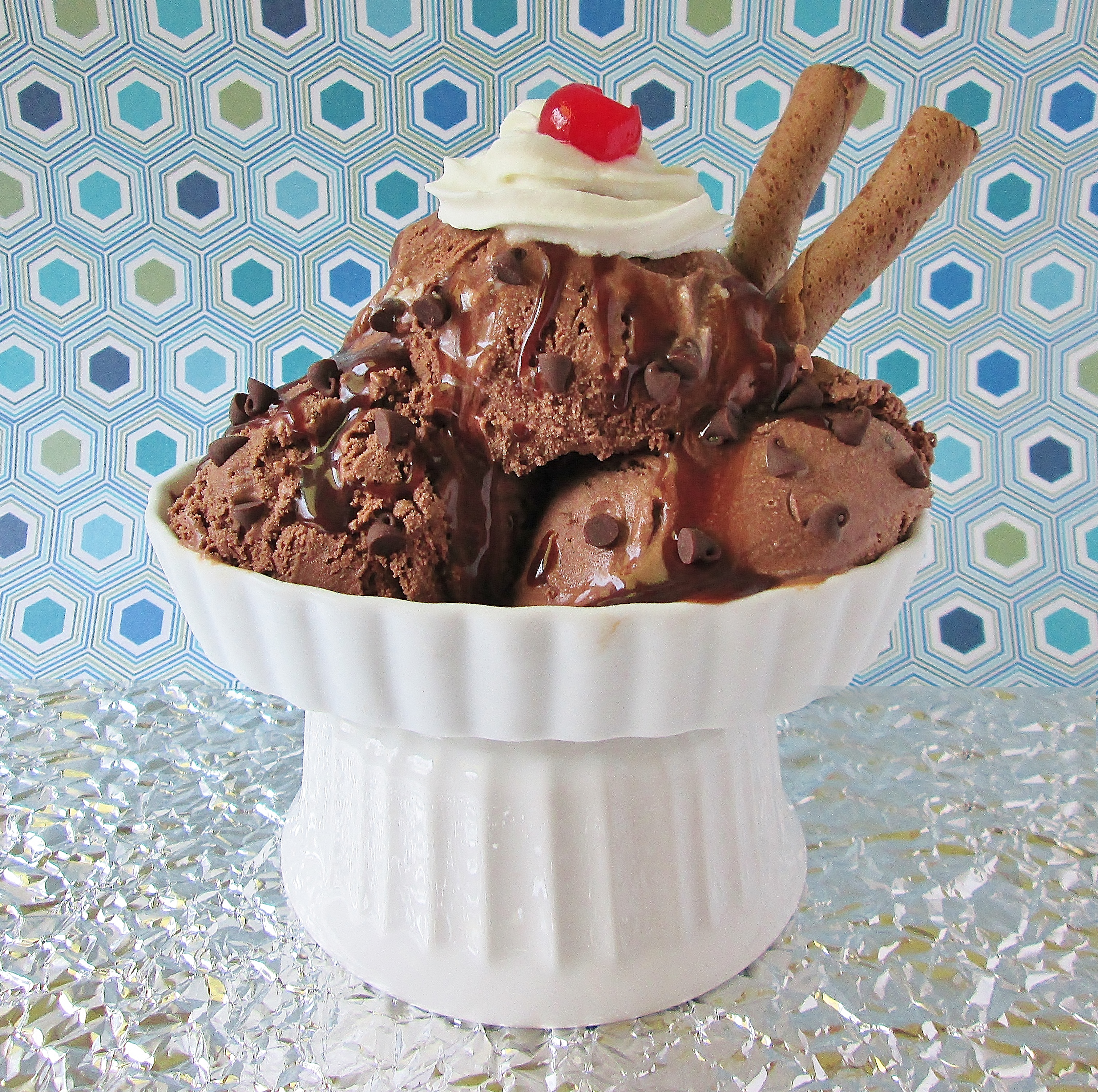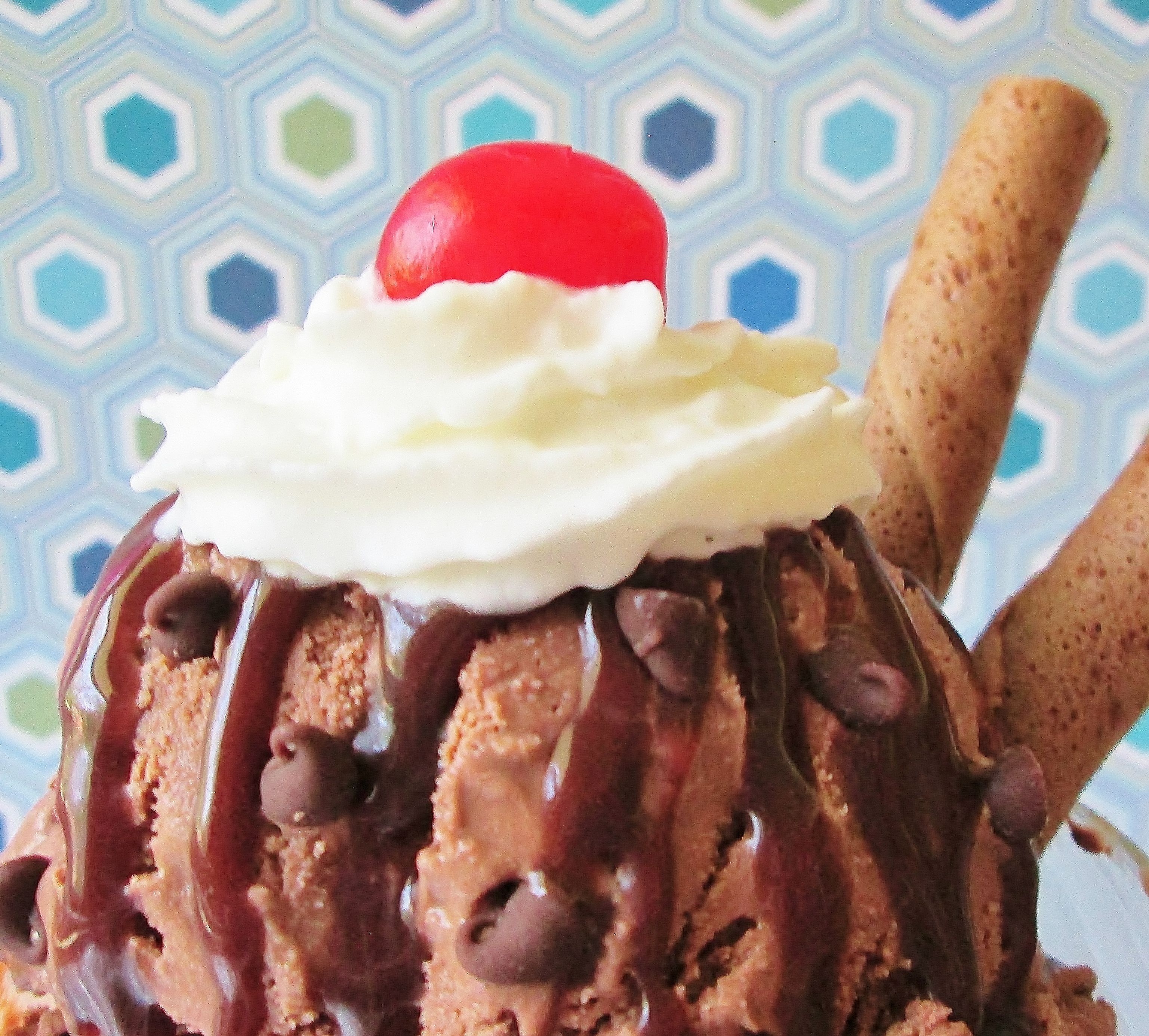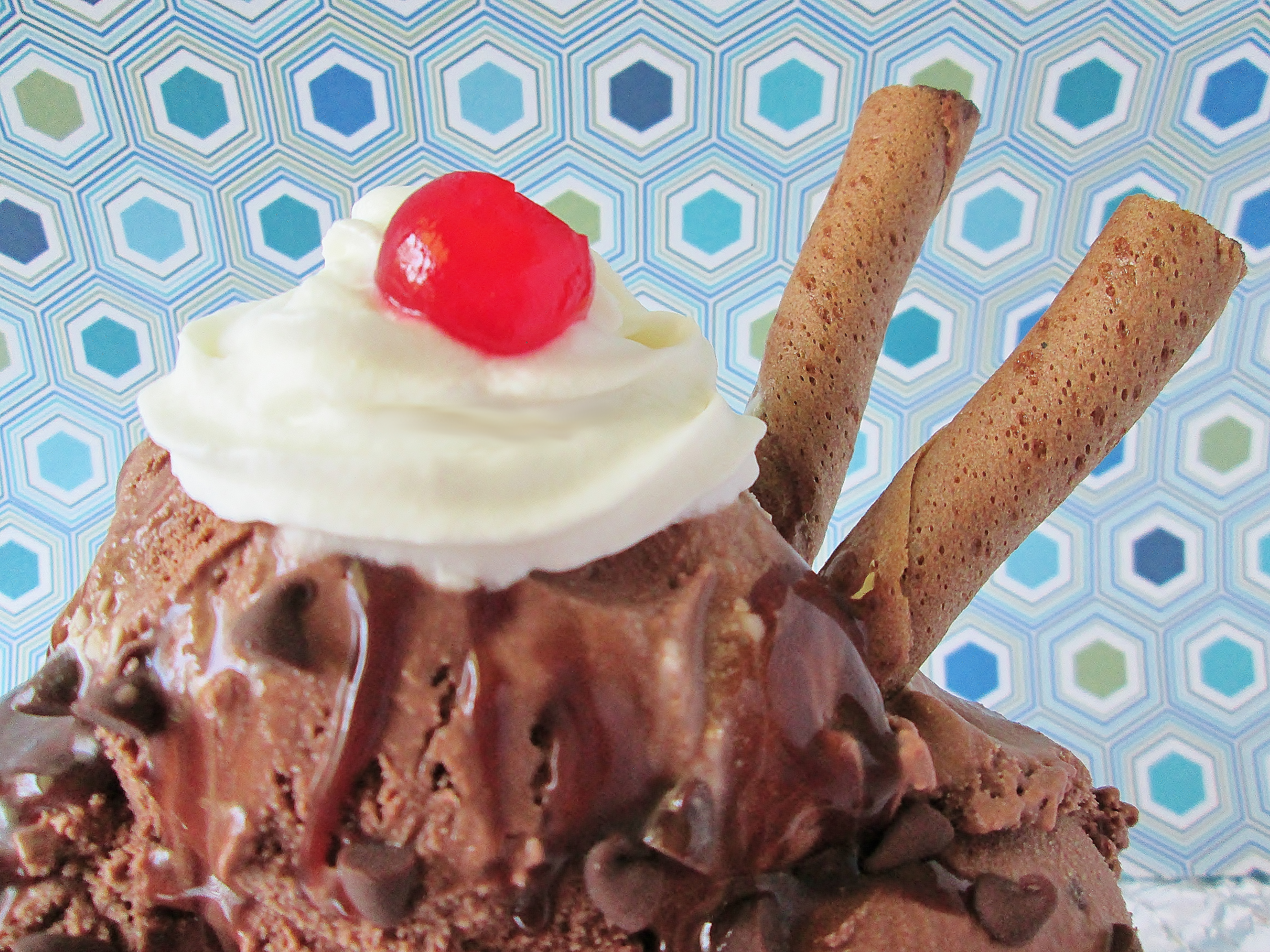 Freezing for a little while after churning makes it easier to scoop. - Cut your pirouettes in half. Place 3 scoops of ice cream in a serving dish. Add half your fudge, chocolate chips, whipped cream, and cherries. Place two Pirouette pieces into your sundae at an angle.