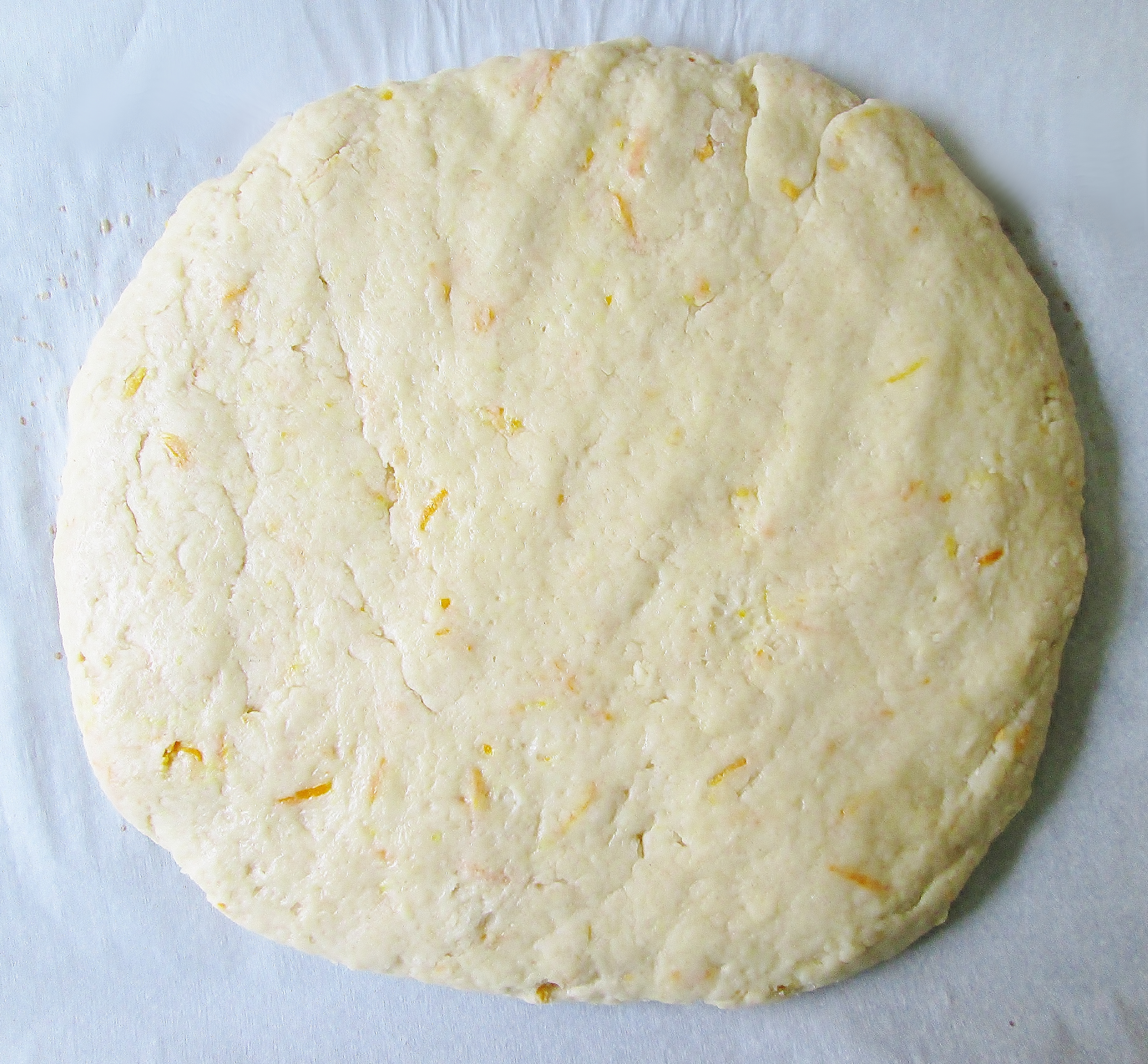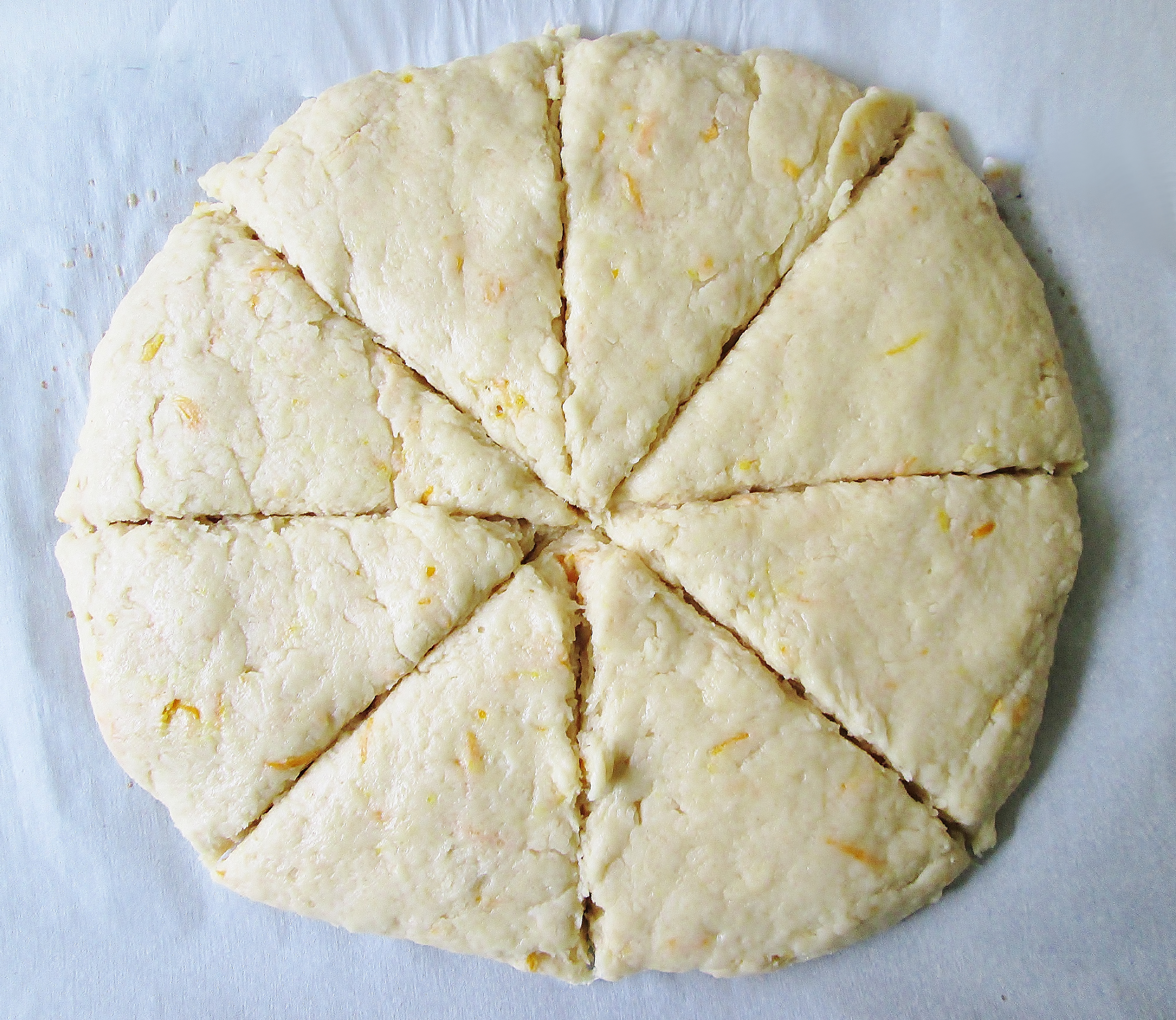 The dough will be damp and a little sticky. We don’t want to work it too much, because that can make the scones tough. - Shape the dough into a ball with your hands, making sure to press any stray bits from the bottom of the bowl into the ball. Place it on your baking sheet and flatten it with your hand into a 7 1/2 – 8 inch round disk. Use a sharp knife to score the dough into triangles. You’ll want to cut about halfway through the dough to ensure that the lines don’t disappear while baking. To make it easier to separate the portions later, you can even cut all the way through the dough when you reach the edge.