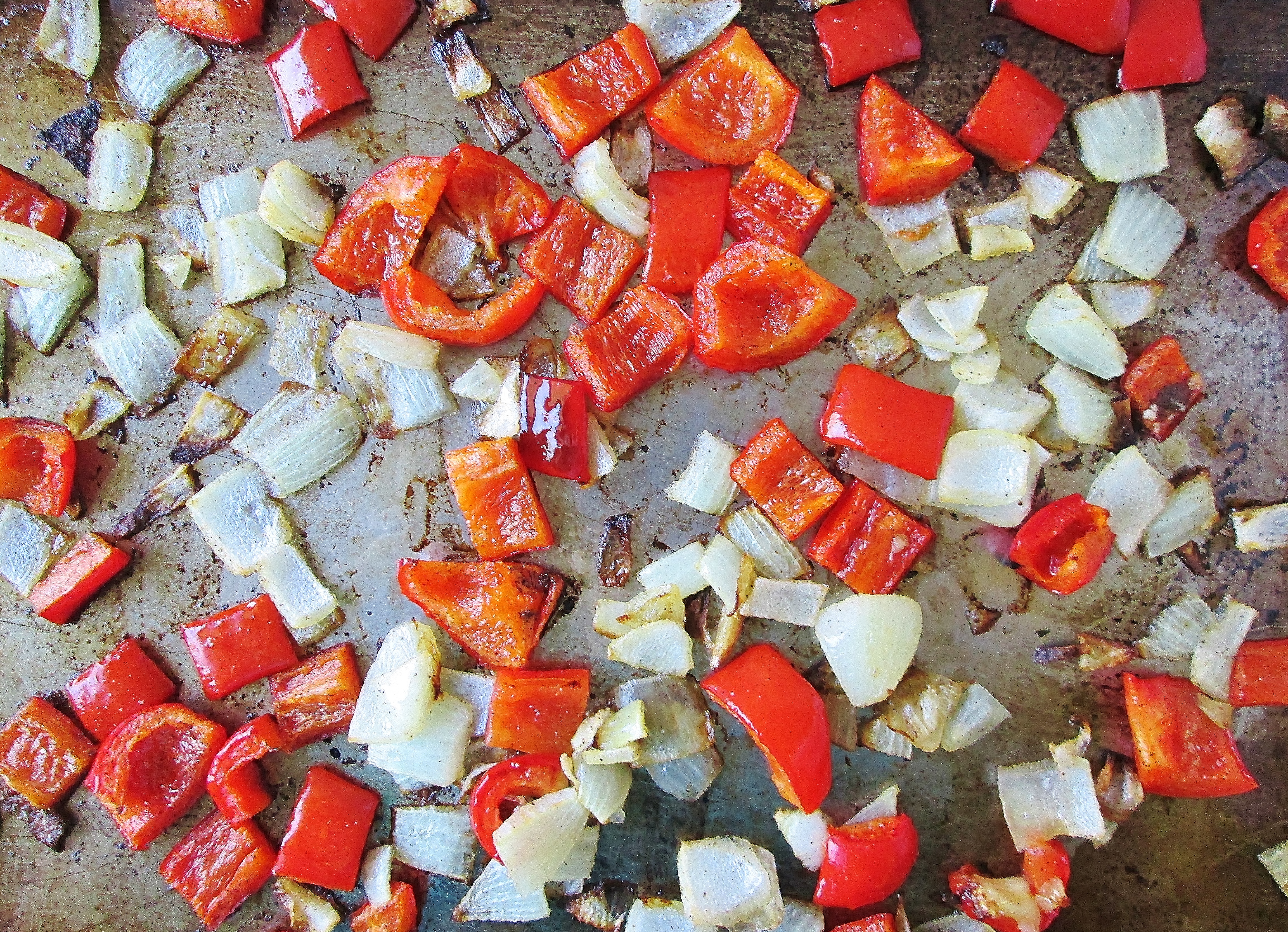 - Place the tomatoes on the top rack of your oven and the peppers/onions on the bottom. Roast for 30-40 minutes or until the edges of the vegetables are beginning to brown at the edges (the red peppers and onions may finish before the tomatoes).