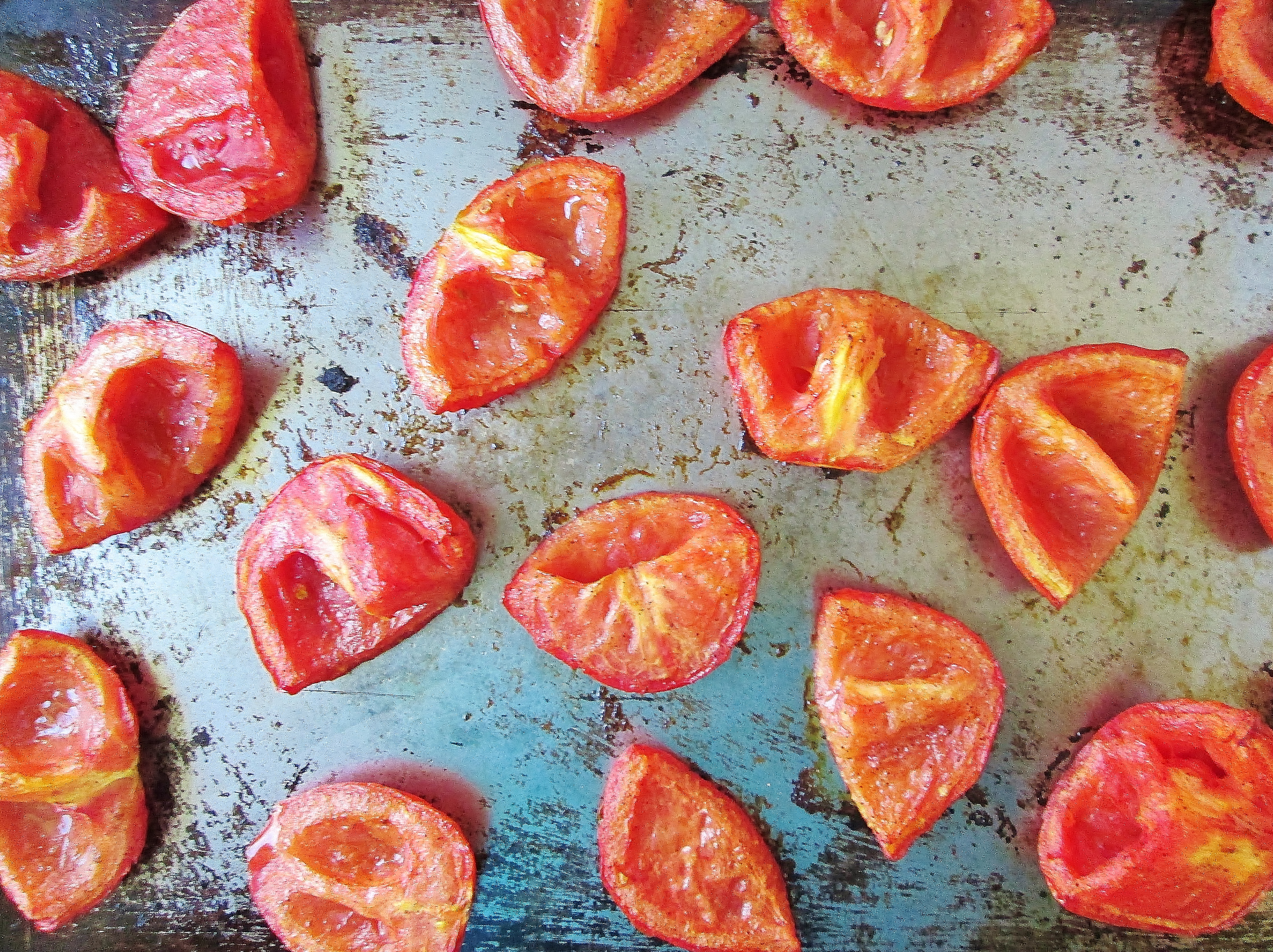 - Cut your tomatoes into quarters and scoop out the seedy parts. Add them to the same bowl with the same seasonings (1 tbsp oil, 1/4 tsp each of salt and pepper). Toss to combine and arrange them skin side down on your second baking sheet.