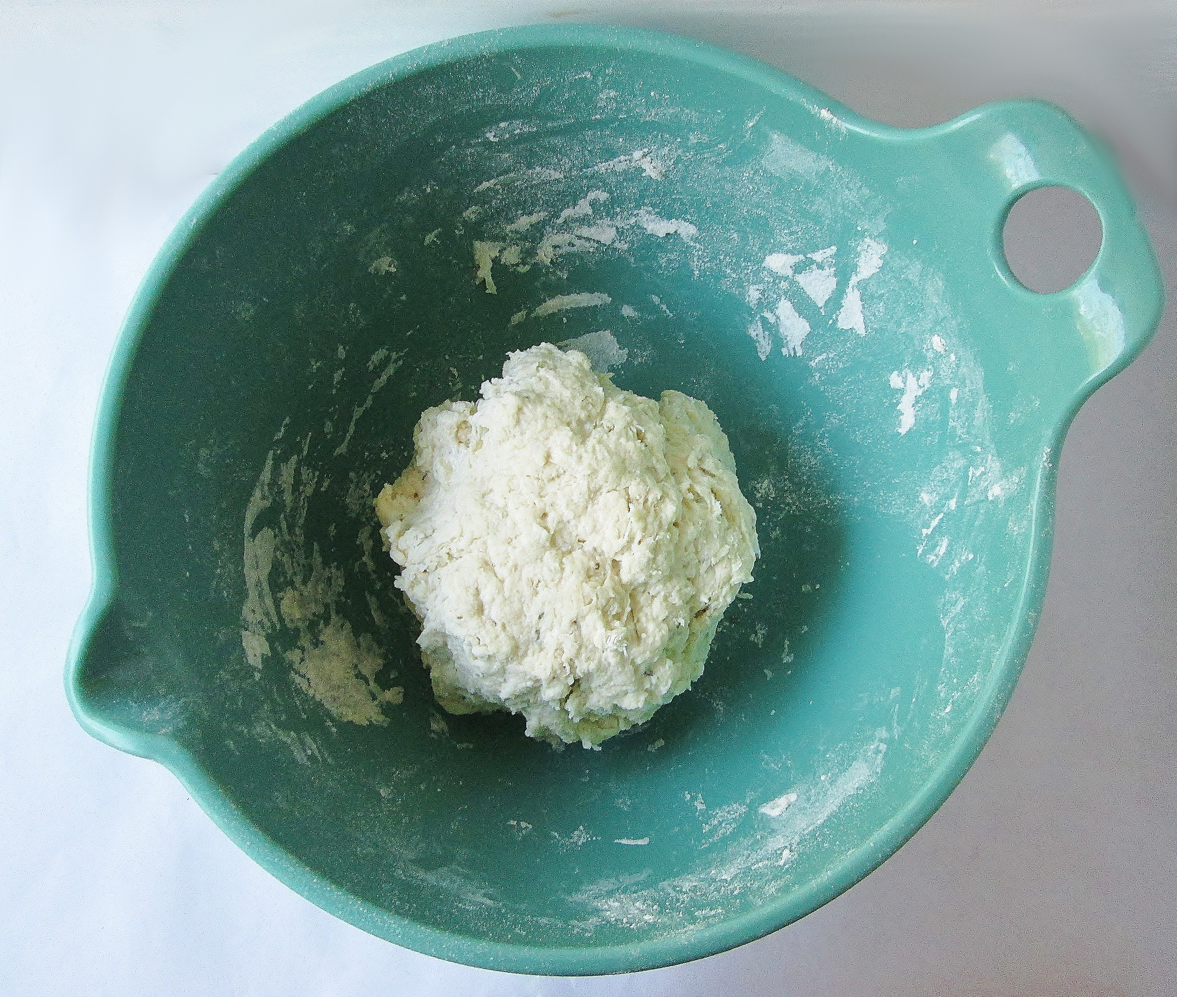 - In a medium-sized bowl, stir together your flour, salt, and (if you’re using them) extra seasonings. Gradually pour in the water about 1/4 cup at a time, working the water through the flour with with your fingers after each addition. When all the water is added, thoroughly knead the dough. In the end, it should come together in a slightly sticky ball.