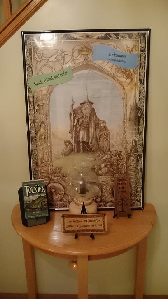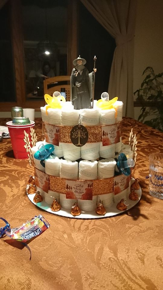 So my mother-in-law threw us a Hobbit-themed shower, and it was one of the cutest parties I’ve ever attended. There was a homemade sign pointing the way to Middle Earth, Mordor, and the Shire (not to mention homemade mini hobbit food and other Hobbit decor that I got to take home!).