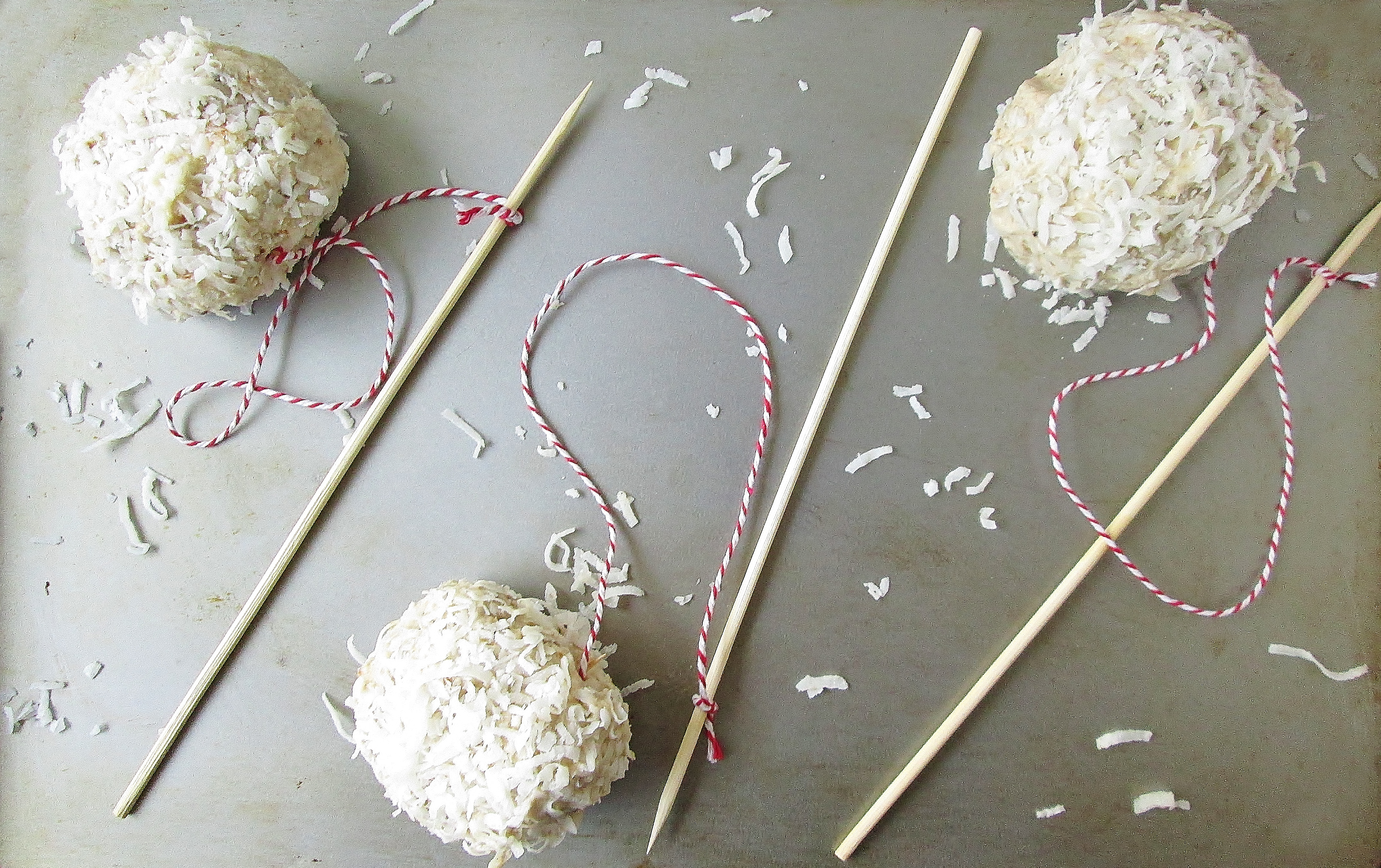 - Cut a length of 17-inch twine. Tie or tape one end of the twine to a bamboo skewer. Coil the other end of the twin across the length of a toothpick. Insert the wrapped toothpick all the way into the center of one of the ice cream balls.