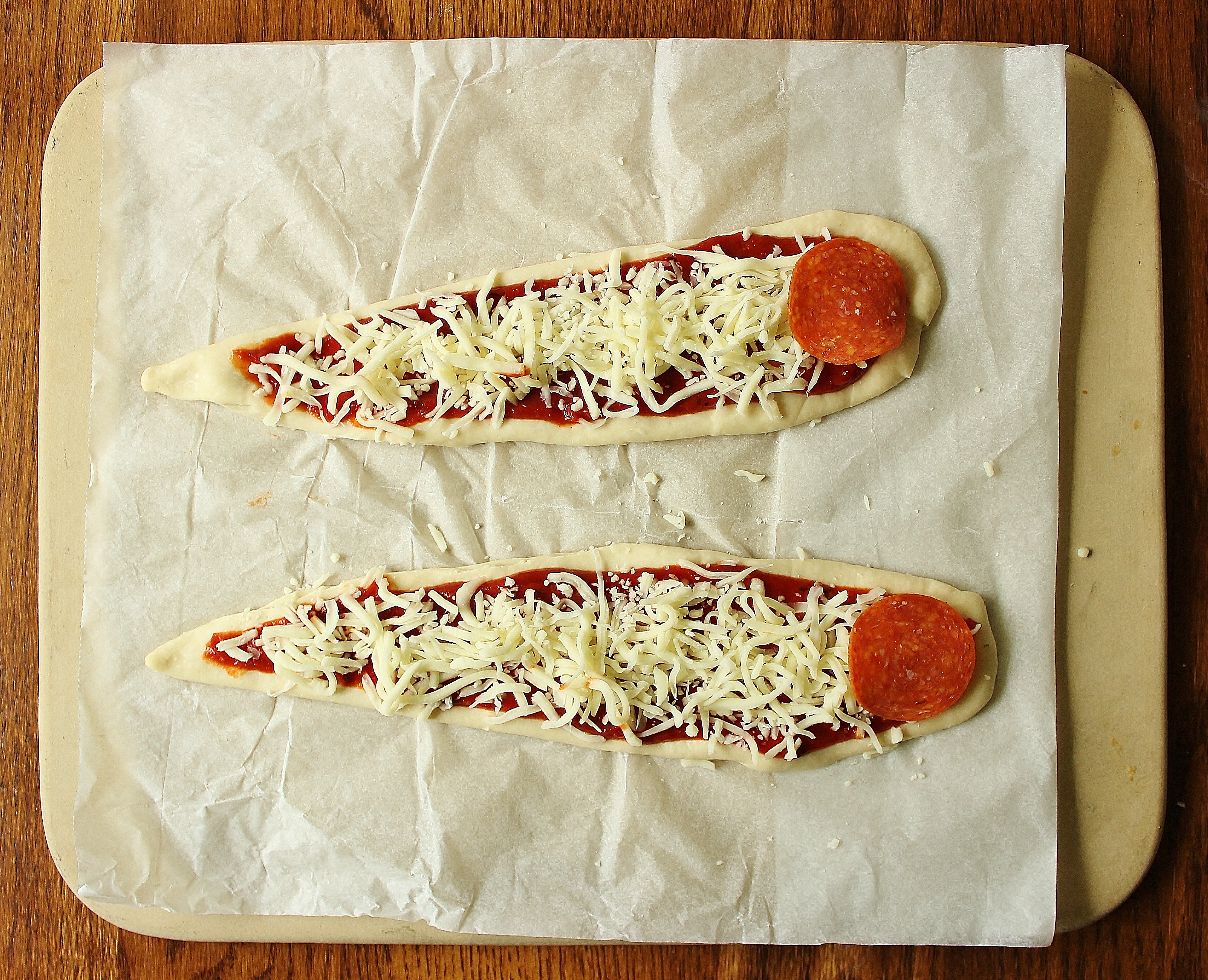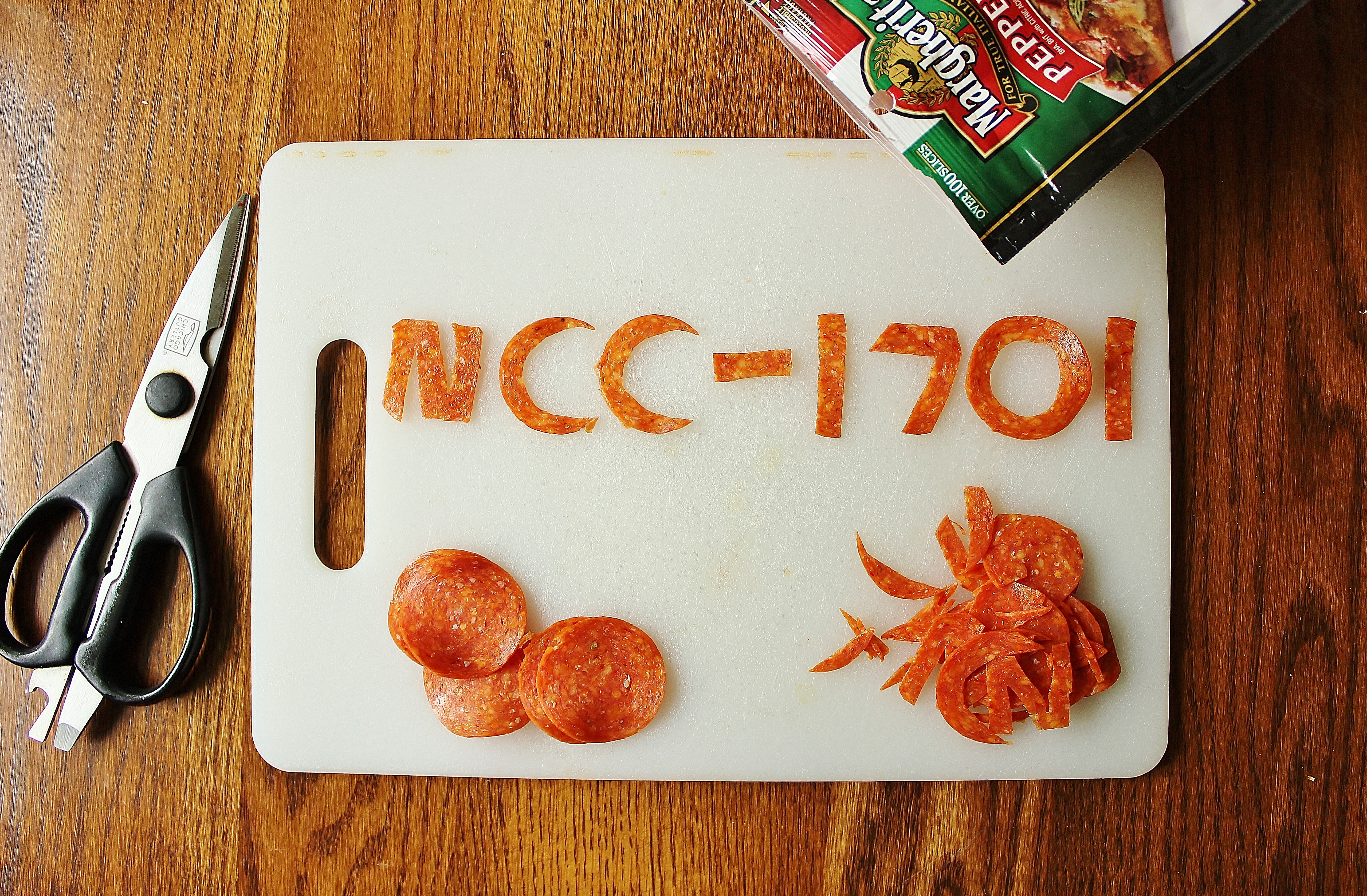 - Spread the sauce evenly on top of your pizzas and sprinkle on the cheese. Place 2 pepperonis on the wide end of the warp nacelles and 7 in a circular pattern in the center of the saucer section. Cut your remaining pepperonis with kitchen scissors to read “NCC-1701” and place these along the outside edge of the saucer section.