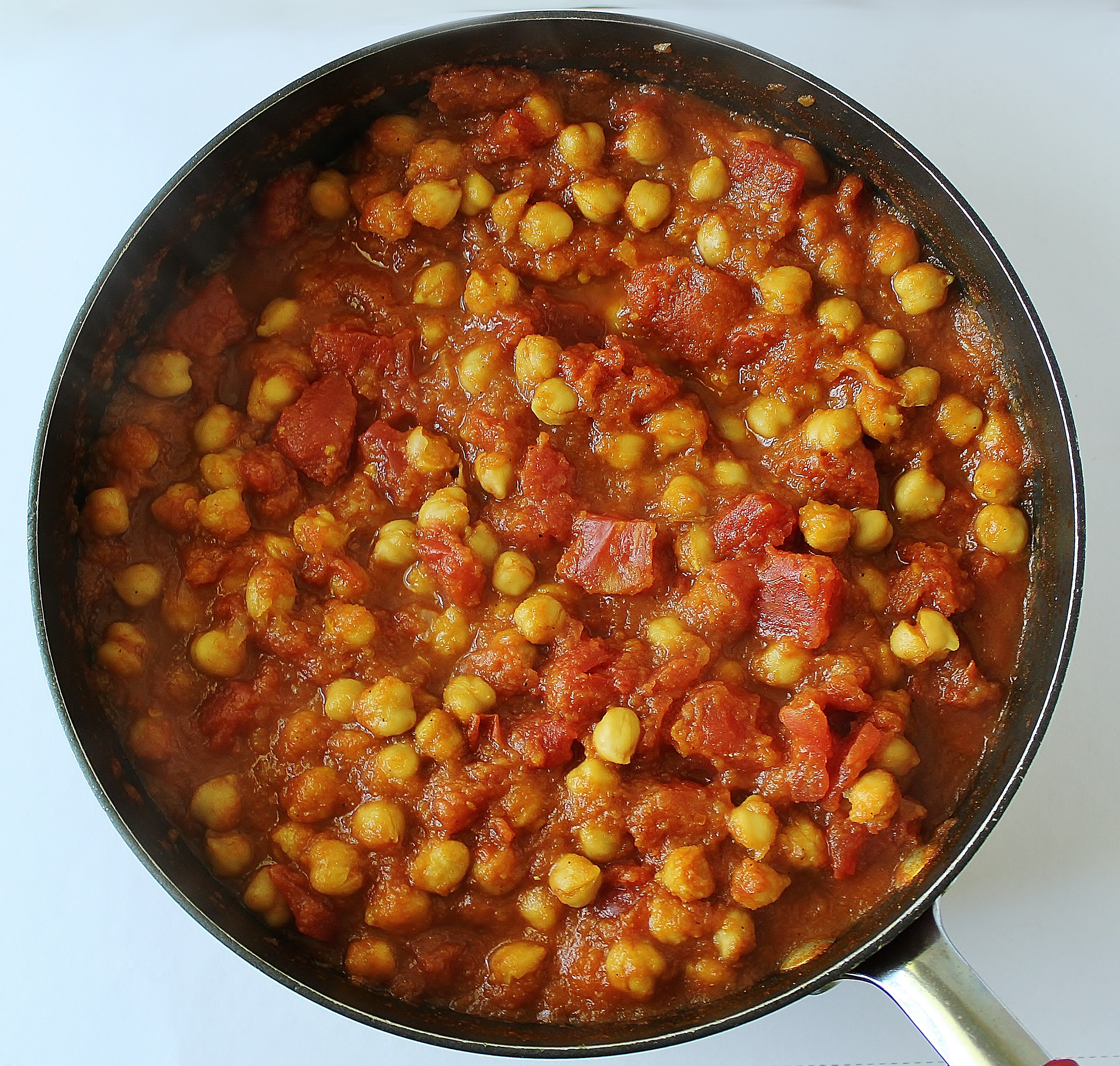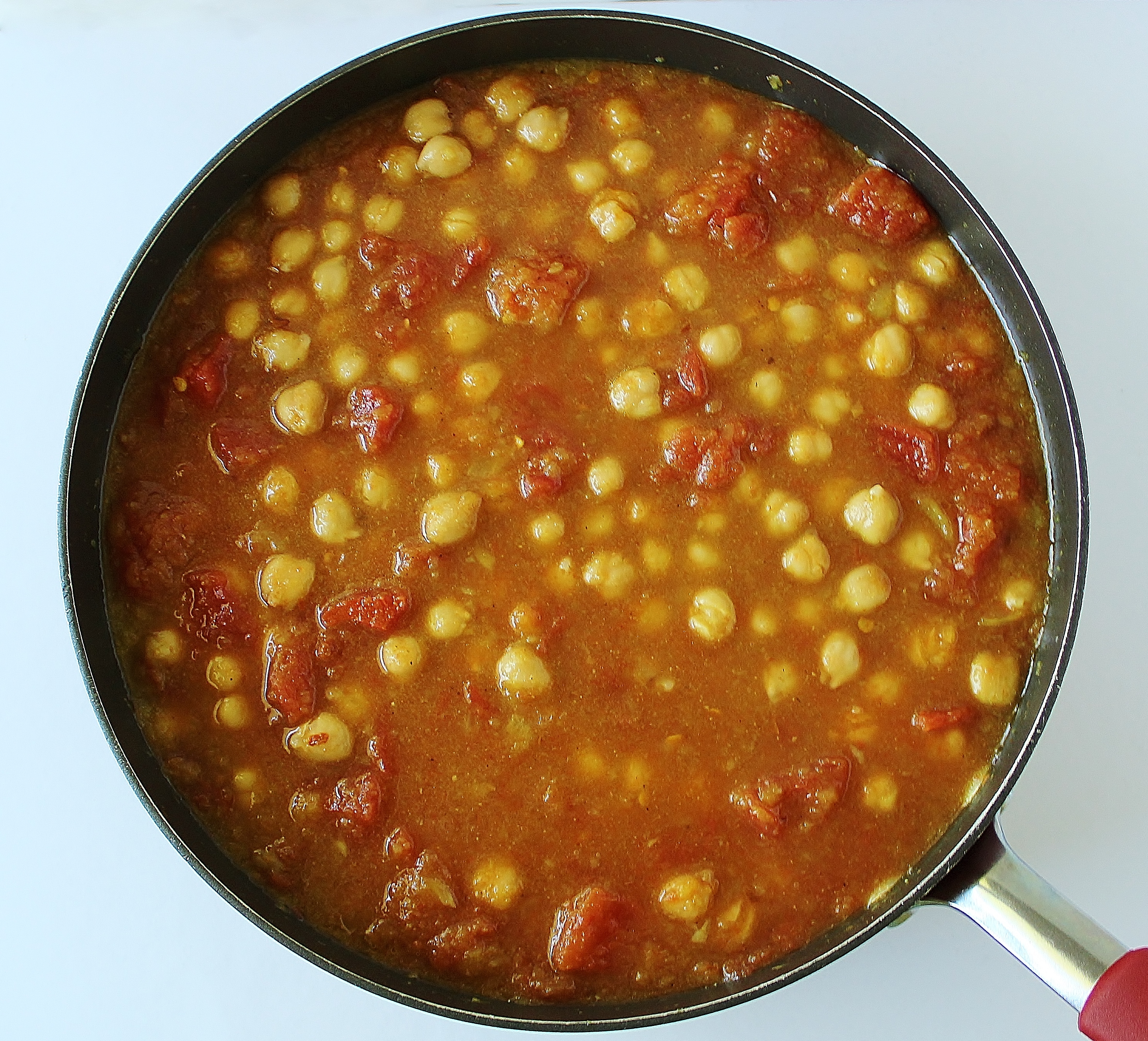 - Add the water, tomatoes, and chickpeas, stirring to combine. Cook for about 30 minutes, stirring occasionally, until most of the liquid has cooked away and you’re left with a thick sauce-like consistency.