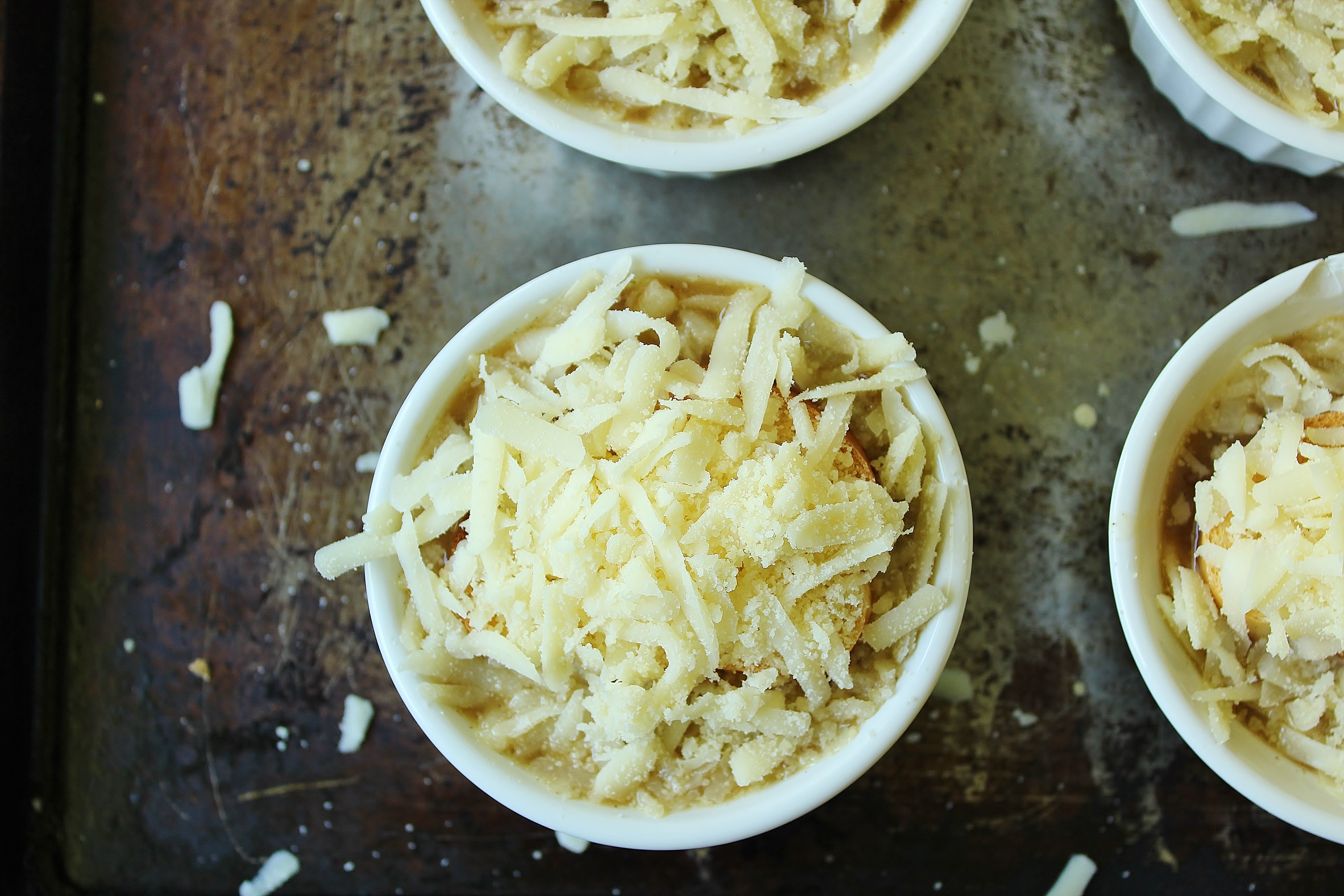 - Add 3 generous pinches of cheese mix to the soup (I’m talking pinch with all your fingers) and stir until melted. Stir in the grated onion. Ladle the soup into 7 oz. ramekins and place the slices of toast on top. Liberally sprinkle with the cheese mix.