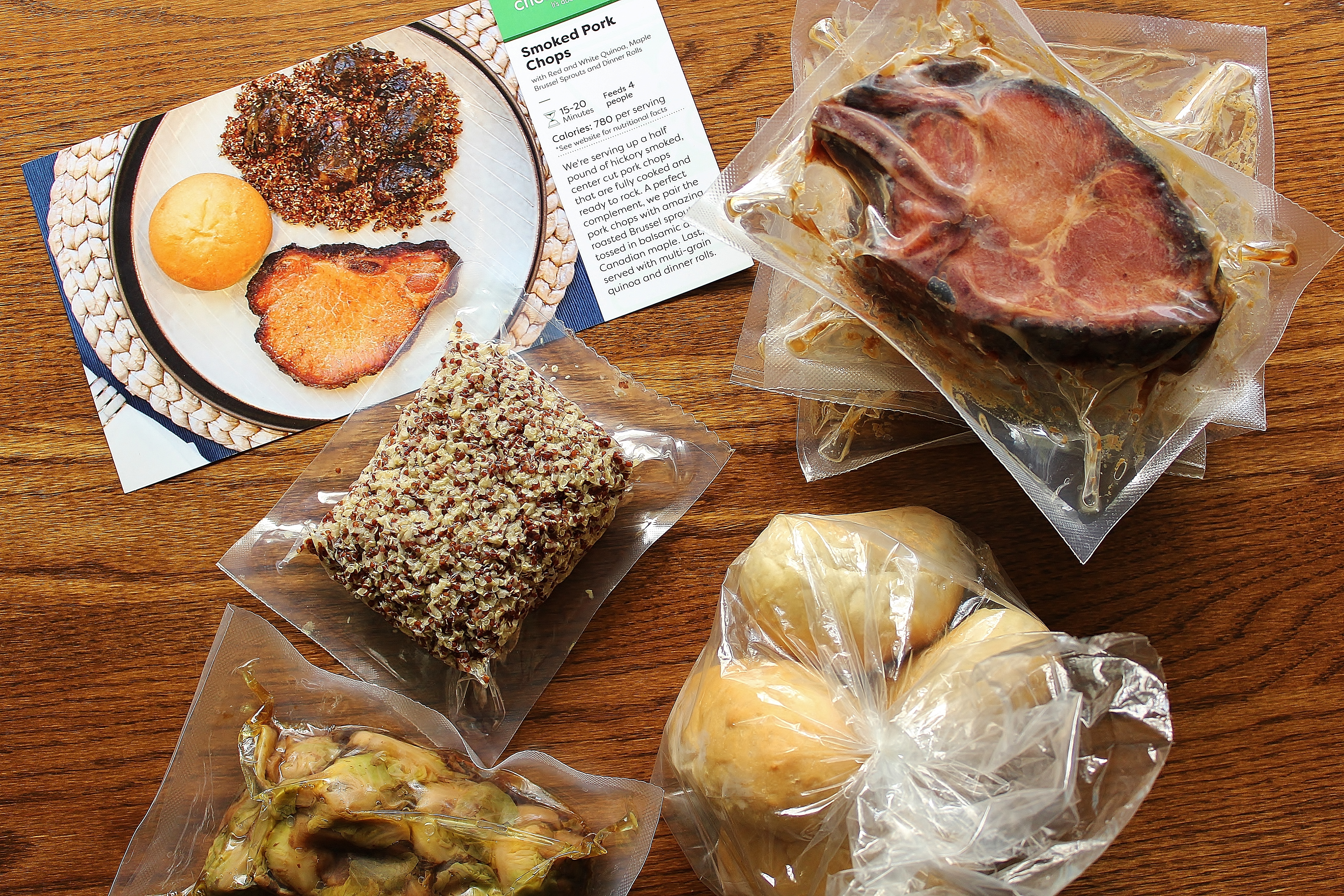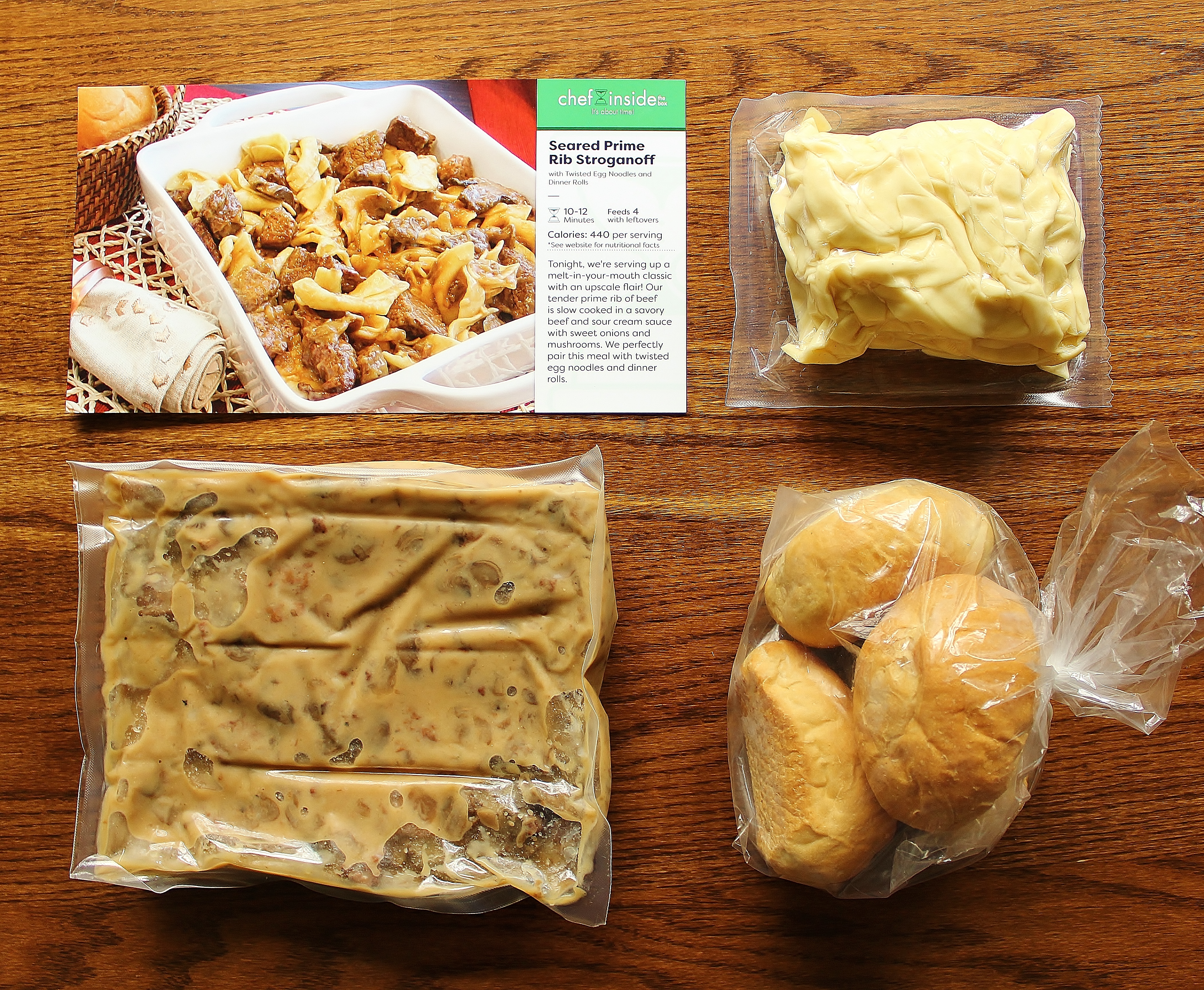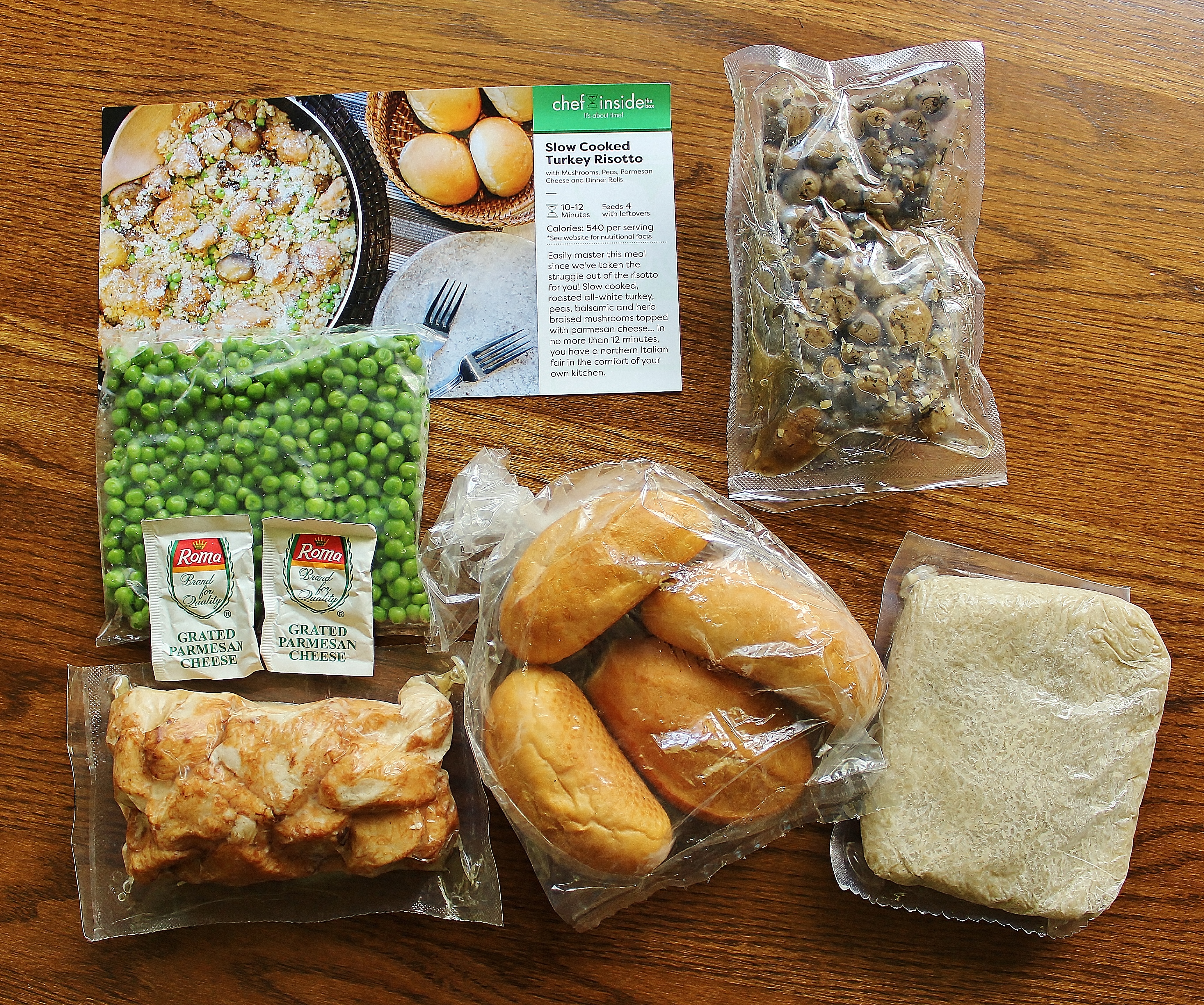 Each kit contained individually vacuum-sealed packages of ready-to-heat food, a bag of four rolls, a postcard with instructions, and an itemized ingredient list.