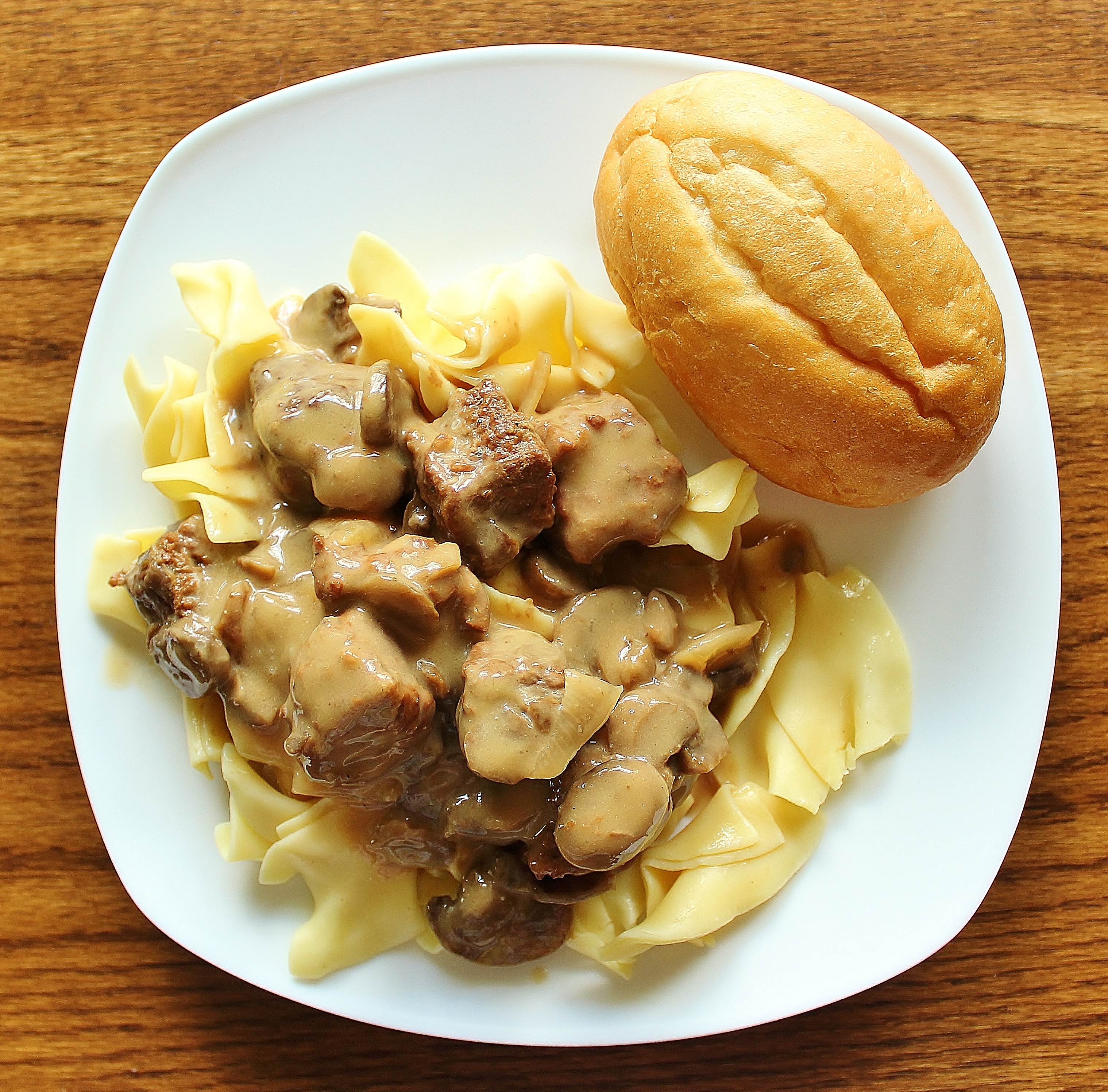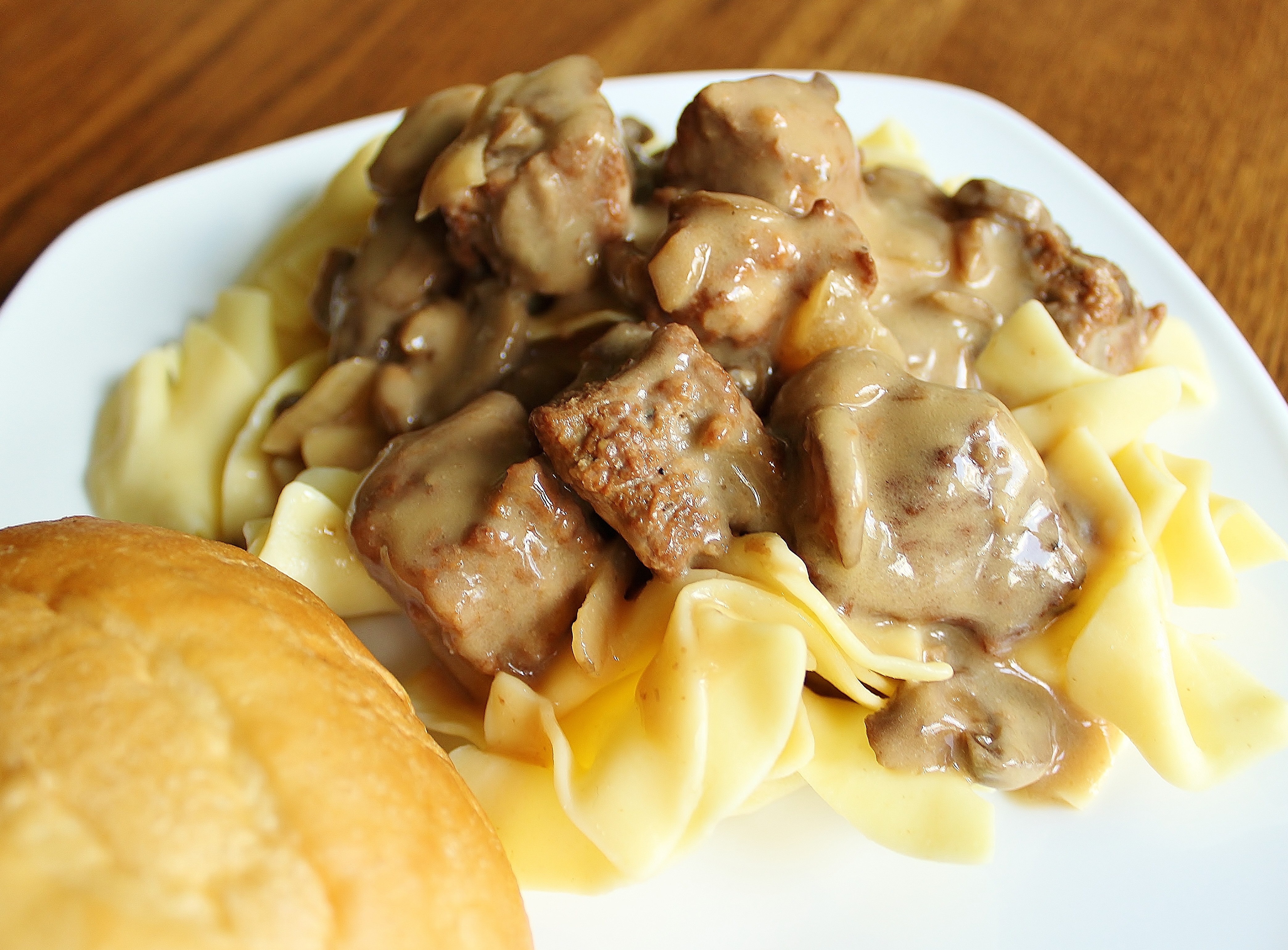 with Twisted Egg Noodles and Dinner Rolls