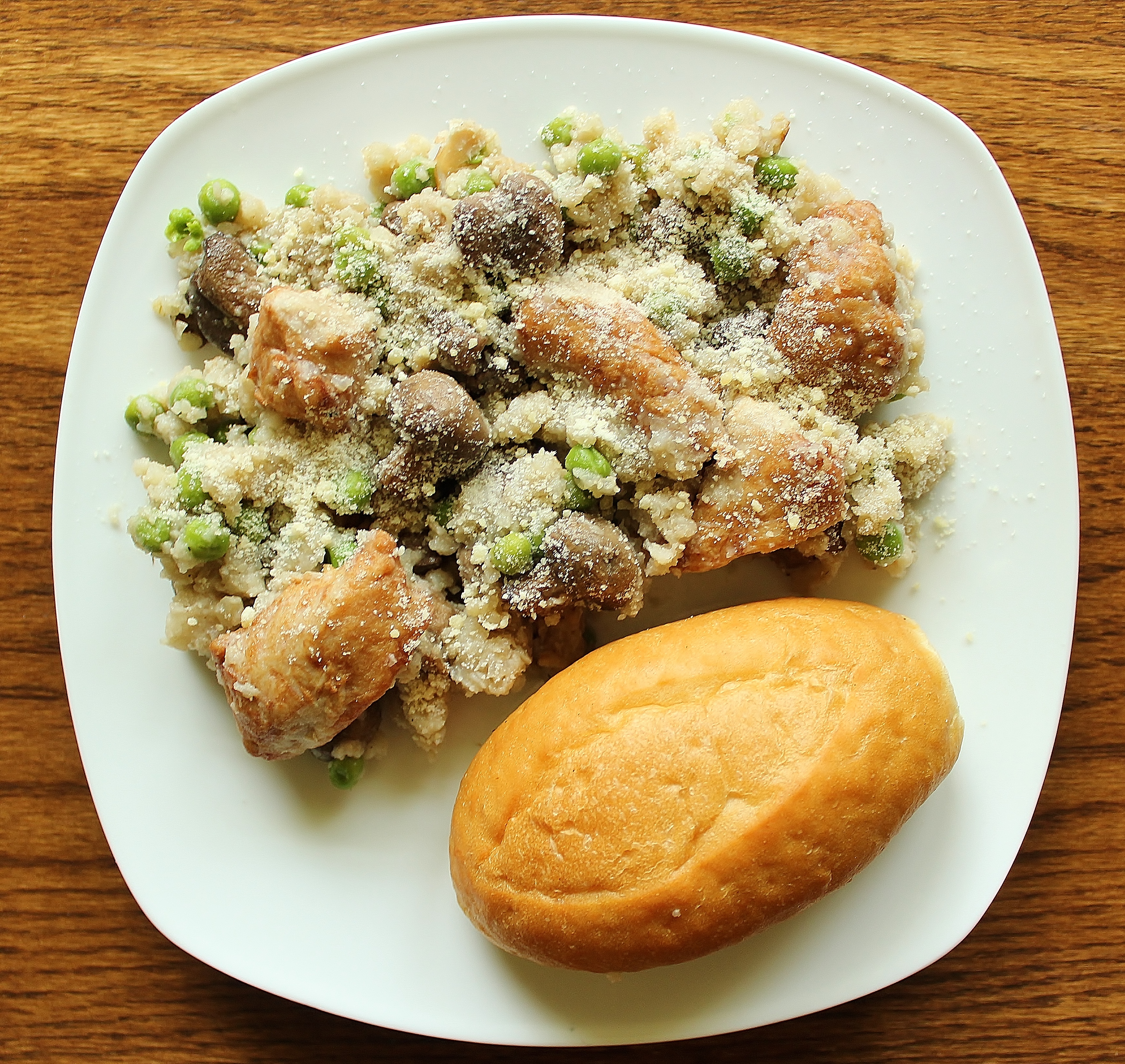 with Mushrooms, Peas, Parmesan Cheese and Dinner Rolls