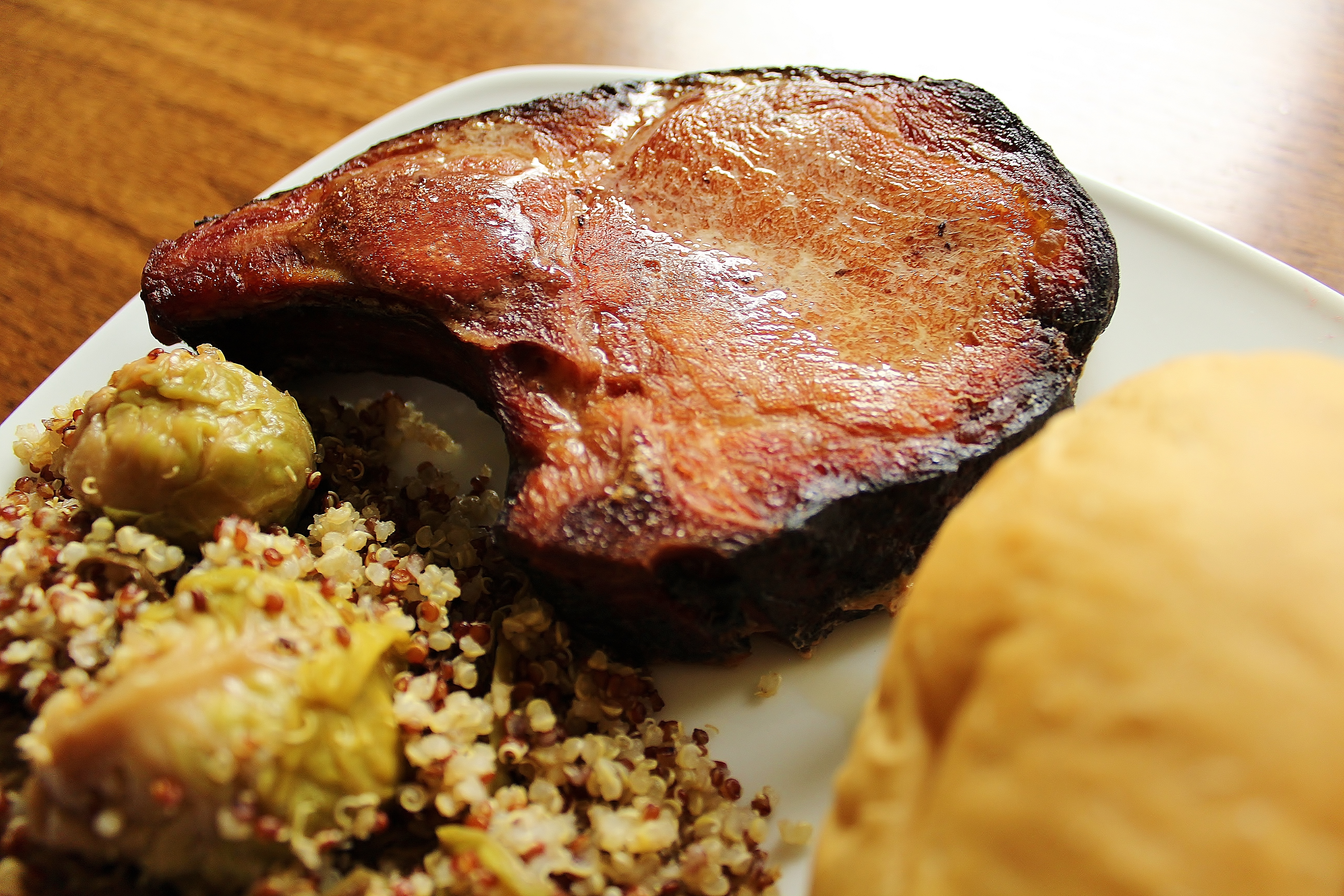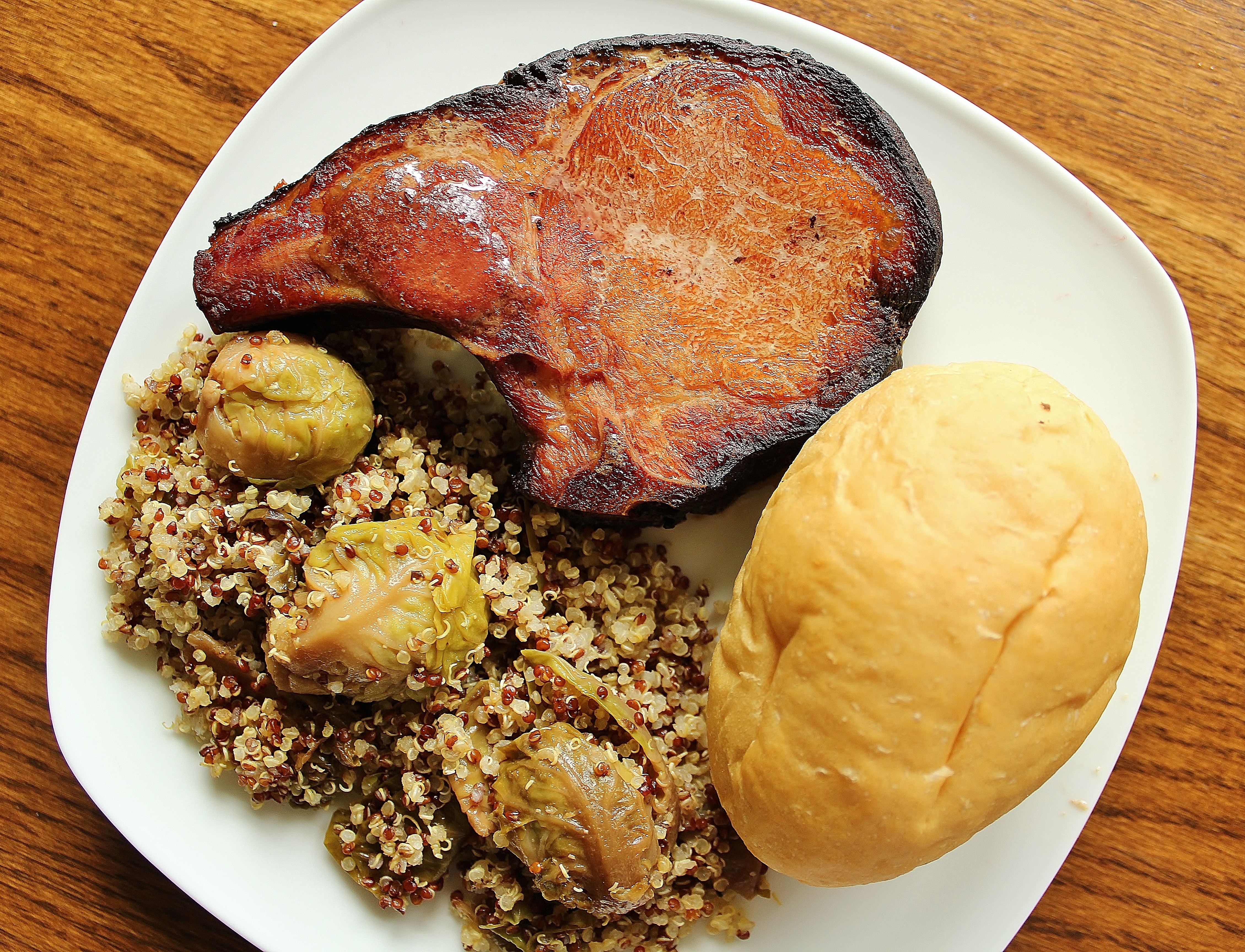 with Red and White Quinoa, Maple Brussel Sprouts and Dinner Rolls