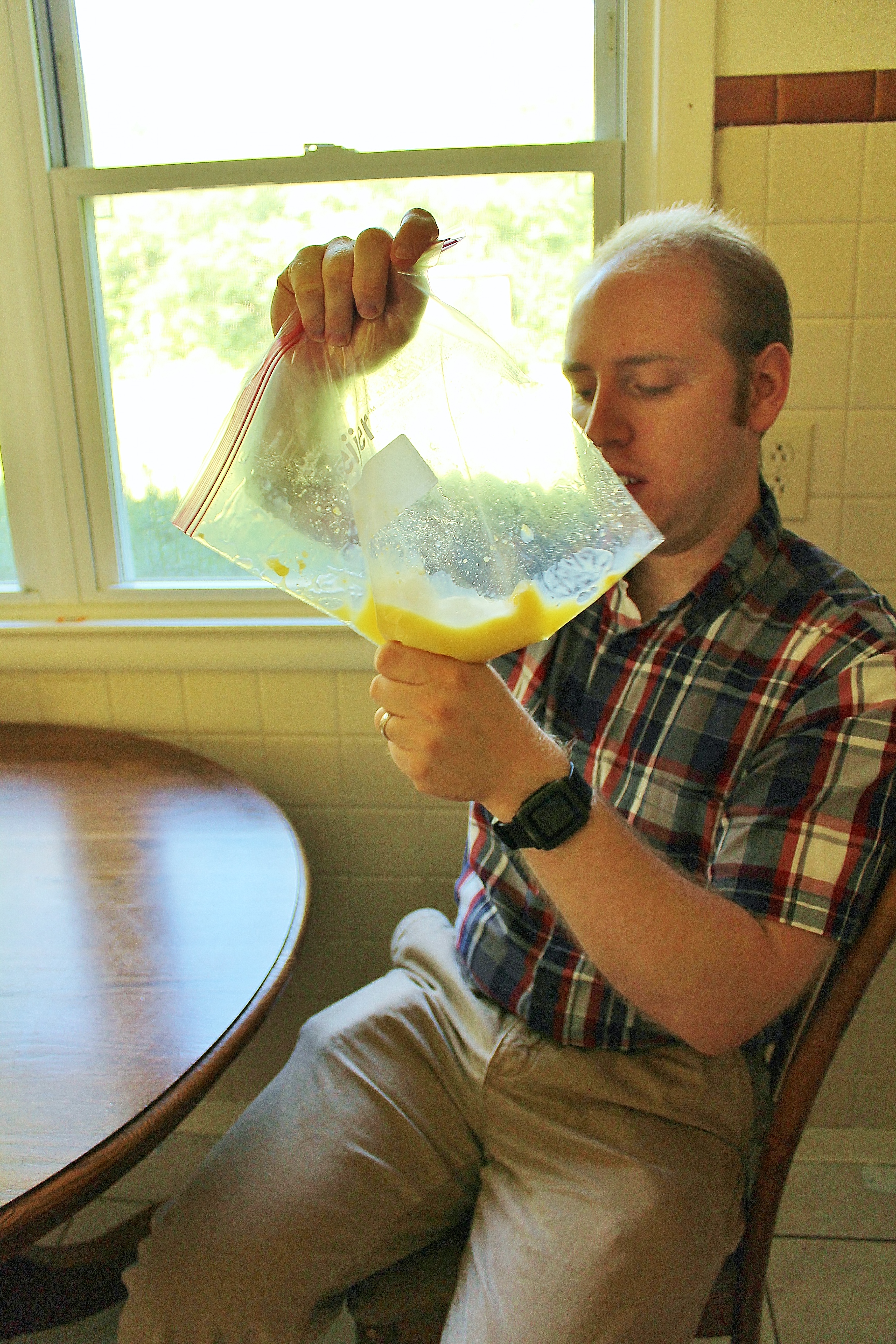 - Pour in your water. Seal the bag (making sure to push out as much air as possible). Squish the contents of the bag thoroughly for 3-5 minutes or until you reach pudding consistency.