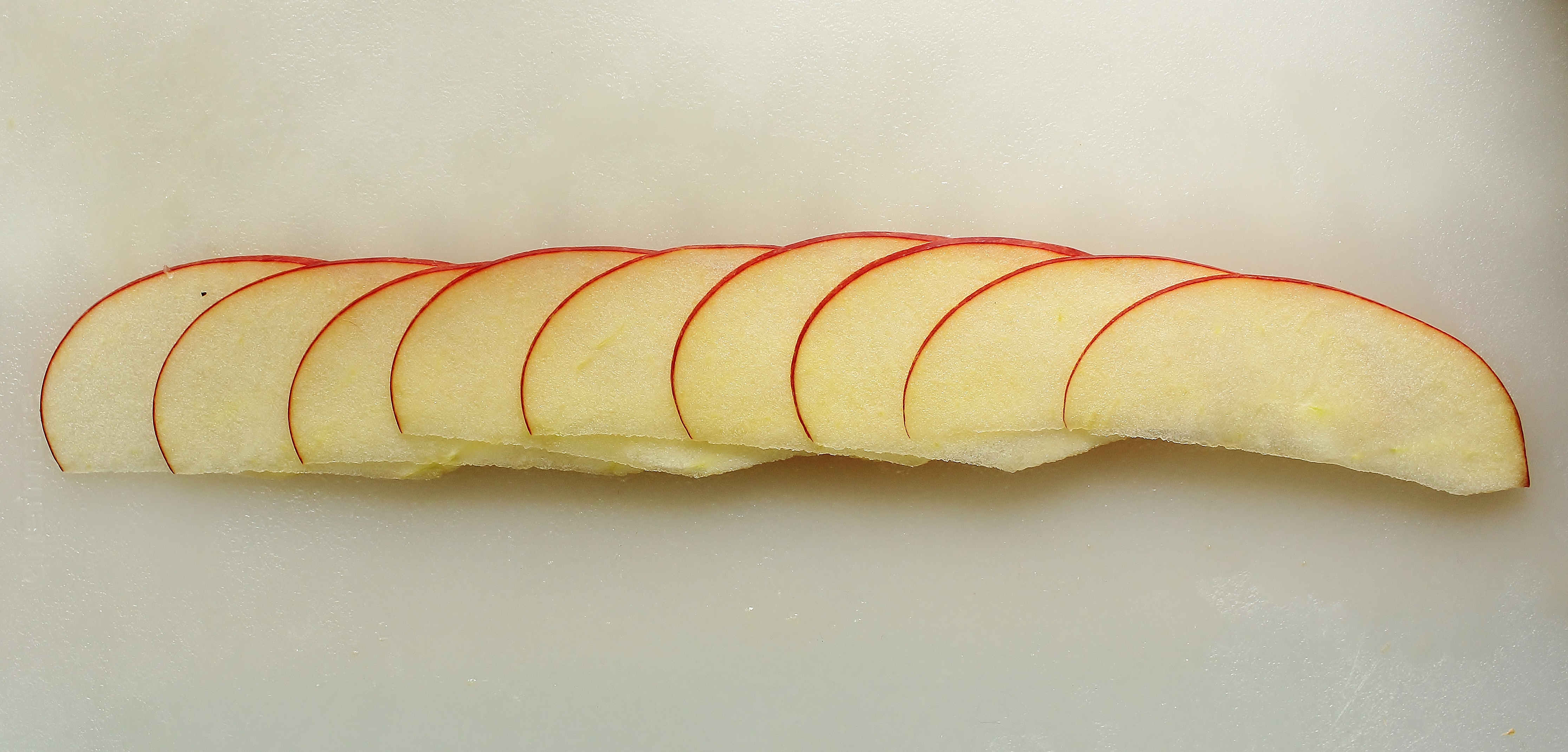- Squirt some lemon juice on a cutting board and line up 10 apple slices overlapping each other in a straight line. Slowly roll the slices into a tight spiral, making sure to keep a good grip on the outside apples.