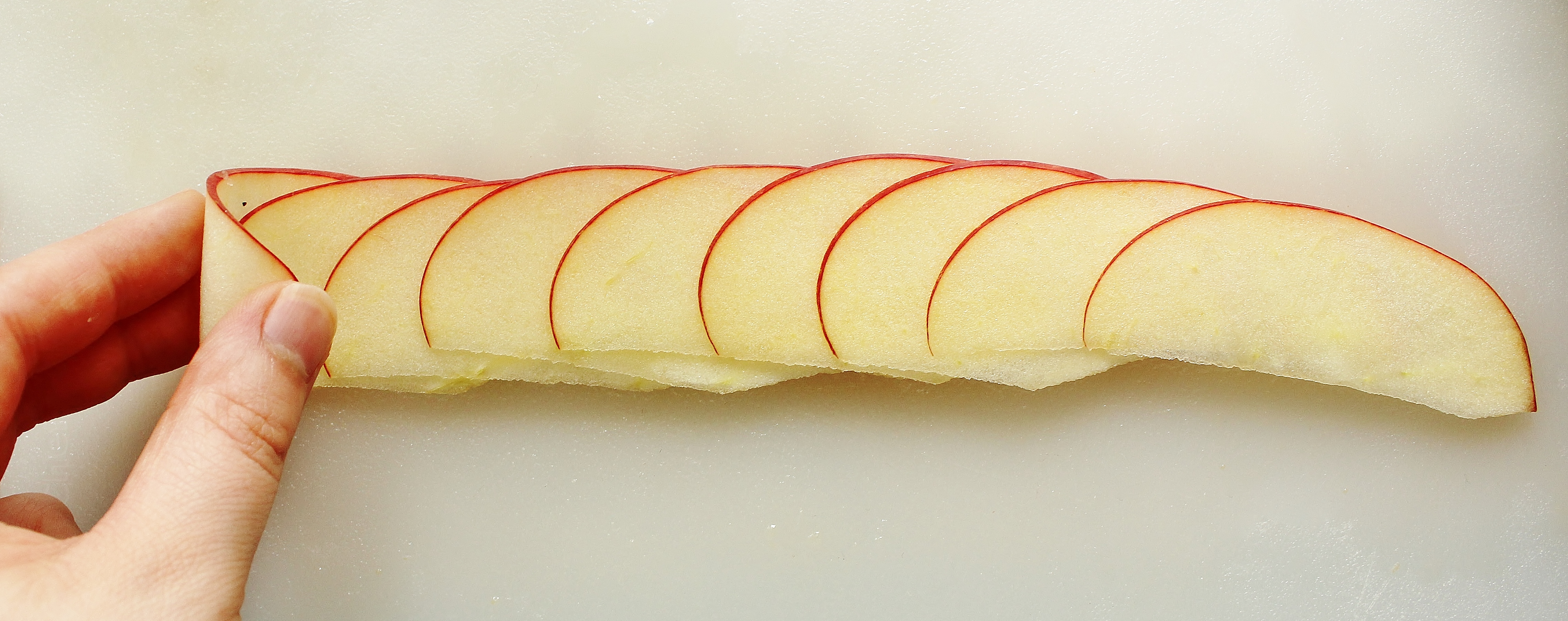 - Cut your apples into quarters and cut out the seeded portions. Slice the quarters thin using the second setting on a mandolin (you want them veeeery thin, otherwise they’ll snap when you bend them). As you cut, add the finished slices in a bowl and toss them with a few drops of lemon juice every so often to prevent browning.