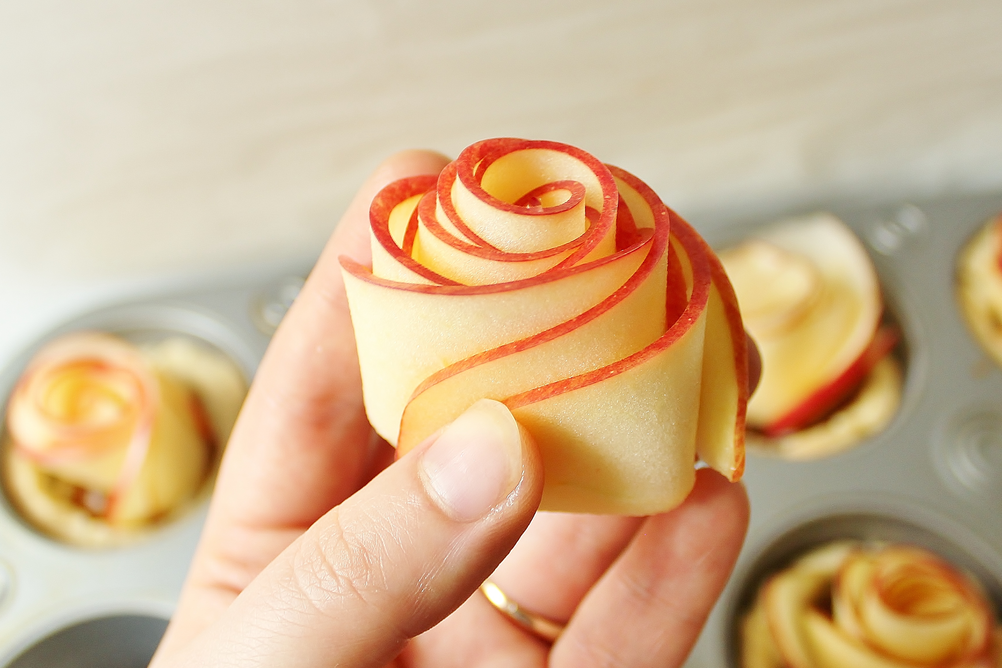 - Place the rolled rose in the center of one of the tart shells, pressing down to make sure it holds its shape. Repeat with all the remaining apple slices.