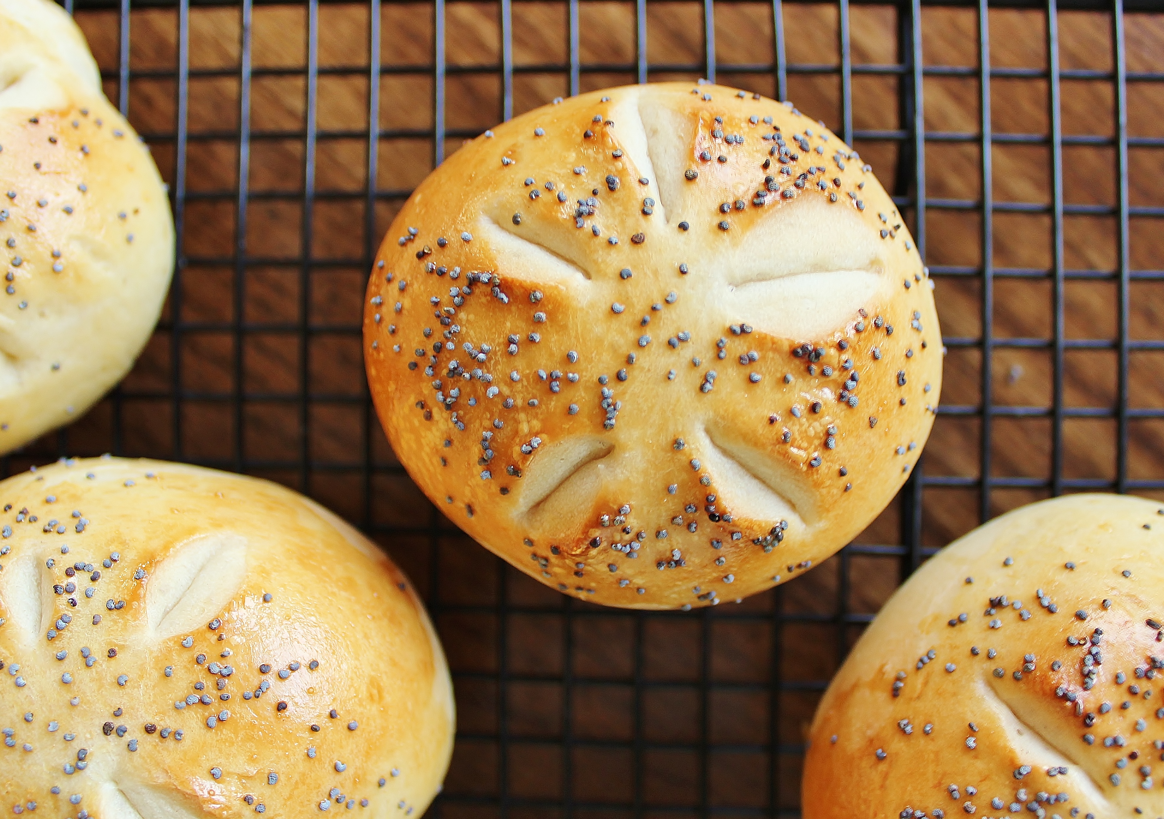 - FOR THE KAISER ROLLS: Preheat oven to 400°. Line a baking sheet with parchment paper. Separate the dough into 9 equal portions and shape into balls, placing the balls on the baking sheet. Lightly cover with a clean kitchen towel and allow to rest for 30 minutes. Brush with the beaten egg and sprinkle the poppy seeds on top. Carve 5 curved lines from the center of each bun to make a flower shape (I used a pair of kitchen scissors, which worked well but didn’t show the curve clearly in the end. You can also buy a kaiser roll stamp, which works better.). Bake for 10-12 minutes or until the tops are golden brown and firm when tapped.