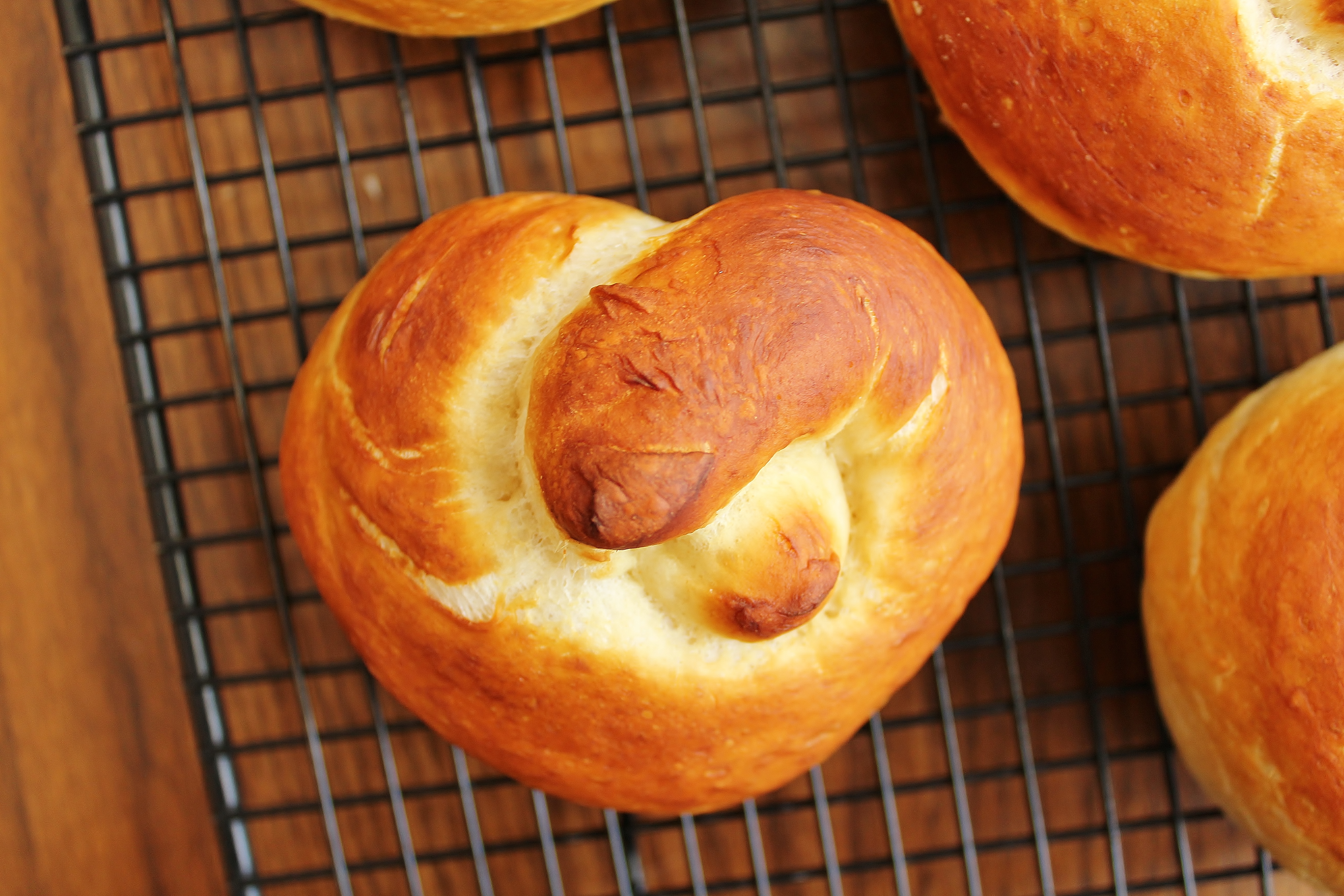 Time for our Little Red Riding Hood recipe! Unlike Rumpelstiltskin, which required me to get a little creative with finding a recipe, I knew from the beginning what I wanted to make for Red’s recipe: the bread she brings her grandmother! Of course, plain old white sandwich bread wouldn’t do. I wanted something different, something special. I decided to make 3 kinds of bread rolls—all of them German, since that’s the kind of bread the Brothers Grimm version of Red would be carrying. I gathered a list of traditional German breads and chose the three that I felt were the prettiest, most distinctive, and most iconic of the culture. Pretzels, cinnamon raisin braids, and kaiser rolls made the final cut! Kaiser rolls are technically Austrian, but since they’re served in Germany too, I decided to give them a pass. 😉 And since I was totally new to making pretzels, I used the baking instructions from Sally’s Baking Addiction as a guide.