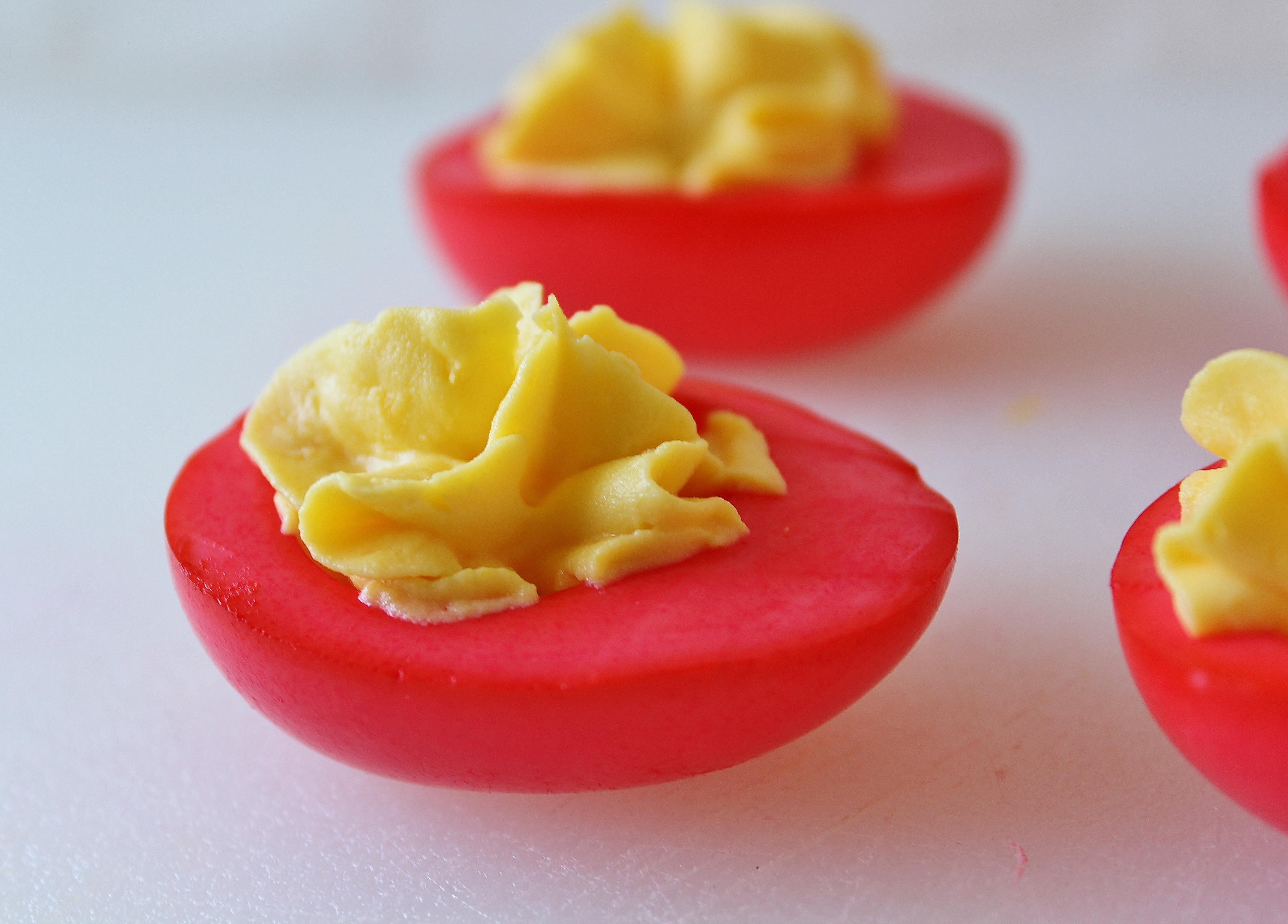 I wound up making regular deviled eggs for the party, but these precious little egg boats are what WOULD have happened if I hadn’t forgotten to dye the eggs before I started filling them. I was kinda bummed that my vision never made it to the real party, but I whipped up a mini batch this week so I could share them with you all here on the blog. Maybe they’ll get a chance to make a little boy smile at one of YOUR parties! 🙂