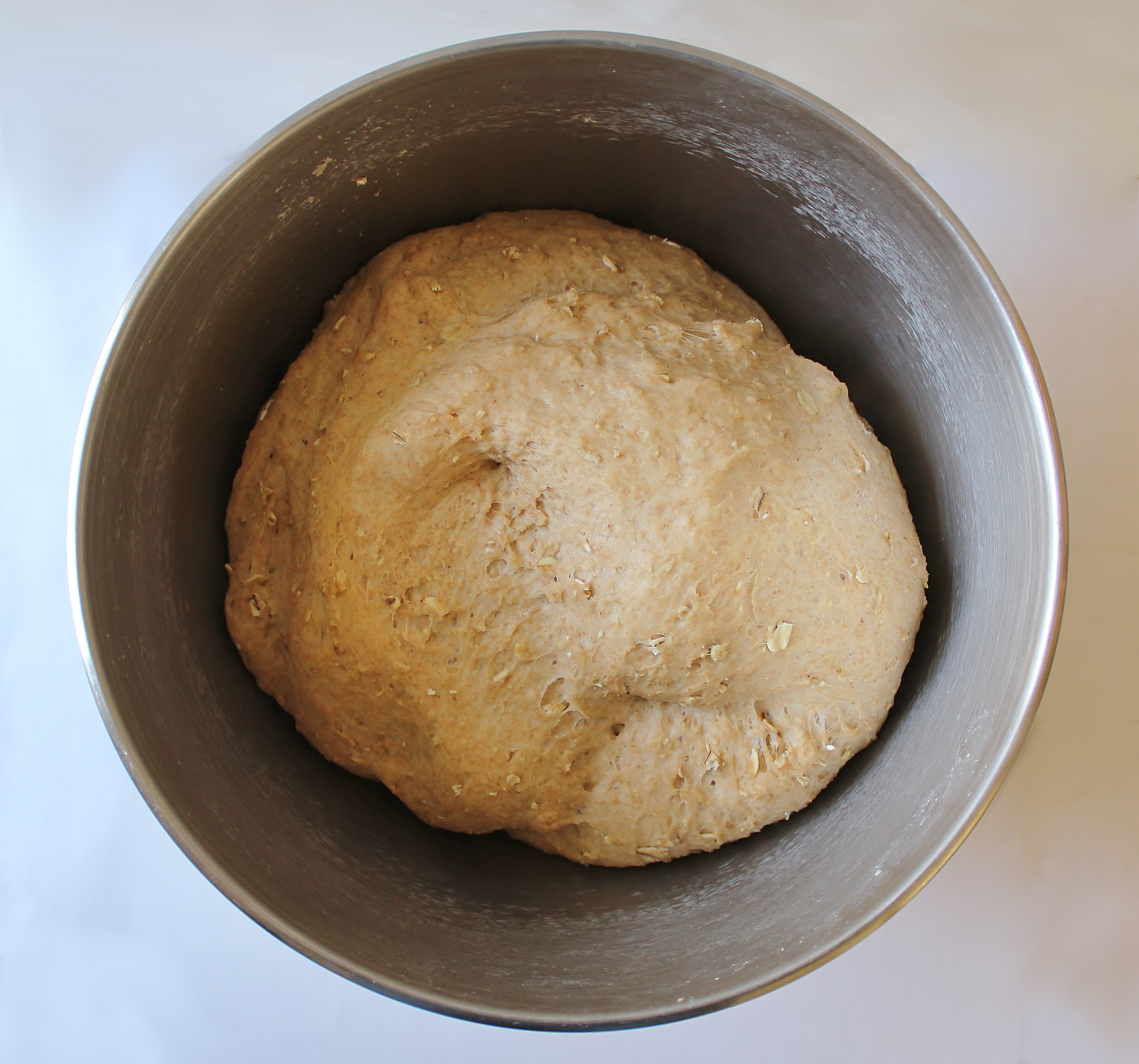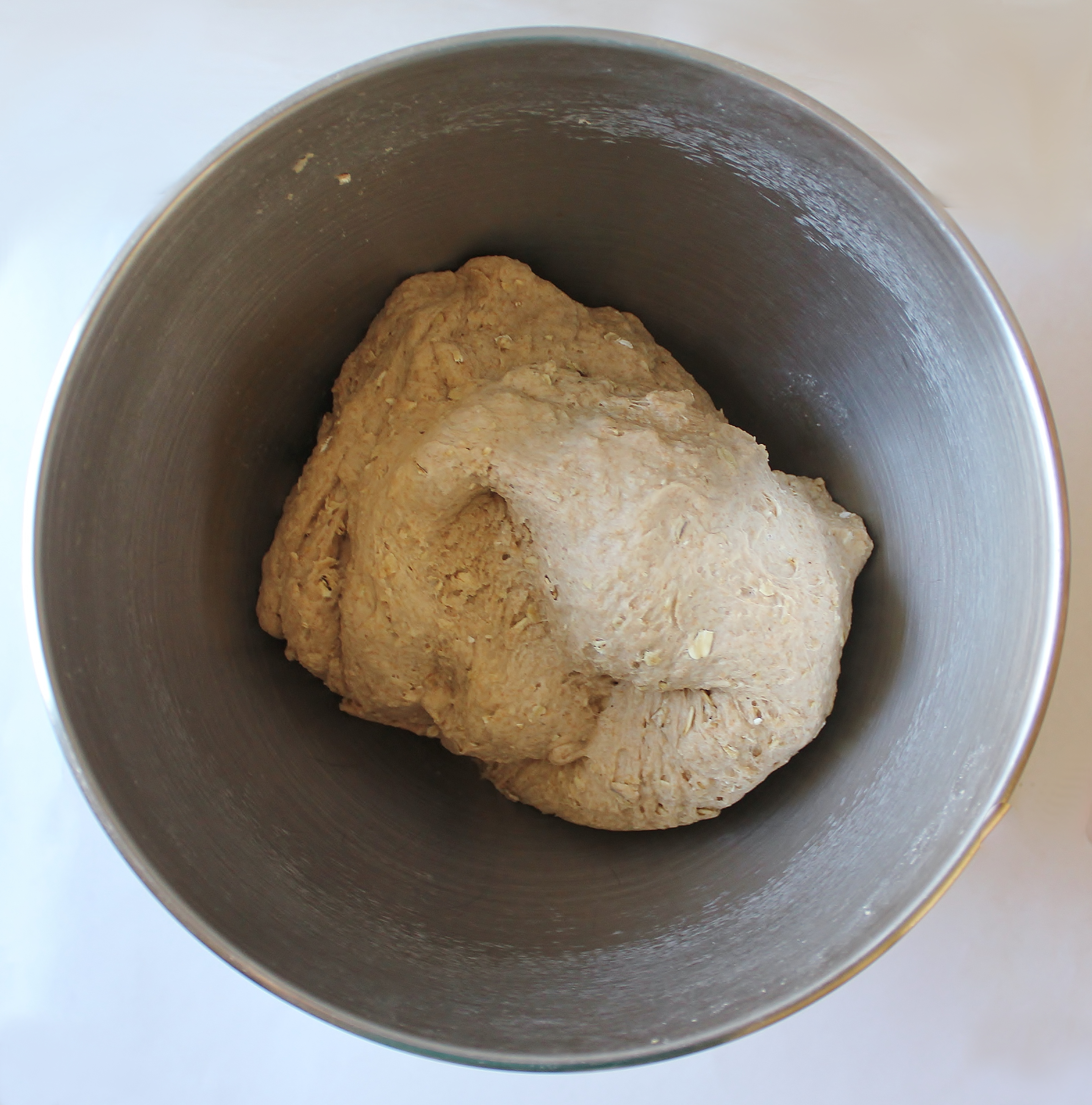 - Stir in the flours, oats, butter, and salt. Knead with a dough hook on medium speed for 6 minutes (the dough should be smooth, elastic, and just slightly sticky). Cover the bowl with a clean kitchen towel and allow to rest for 1 hour.