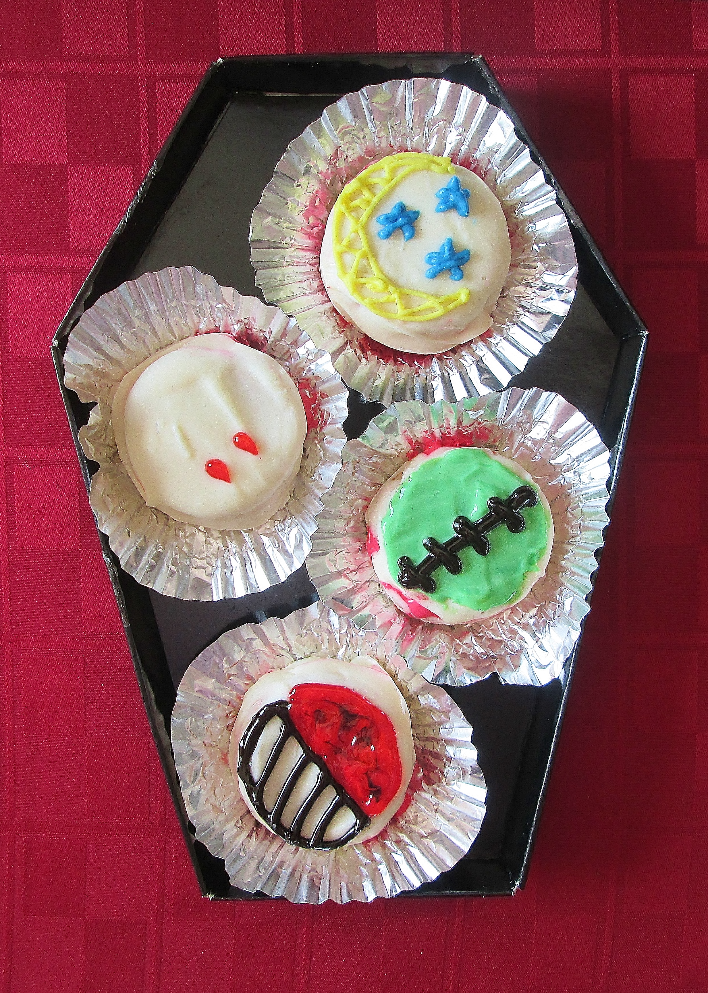 I made mine look like specific goons from the comics, but you can do yours however you want. I can’t help thinking what a fun dessert this would be to bring to a Halloween party, since they kinda look like ghosts! 😉