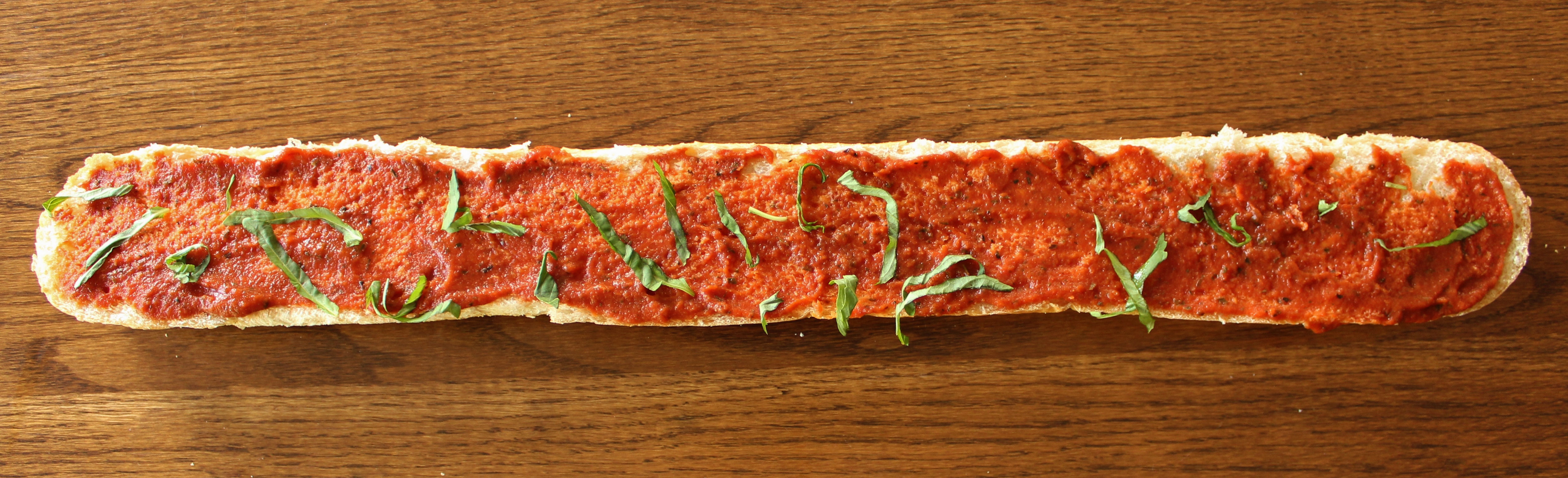 - Slice your bread lengthwise and set aside the top. If you want, you can toast it, though you’ll probably have to cut it in half width-wise for it to fit on a pan. I recommend doing this if you plan on assembling far ahead of time (like several hours before a party), since this will help prevent the sauce from soaking into the bread and making it soggy.