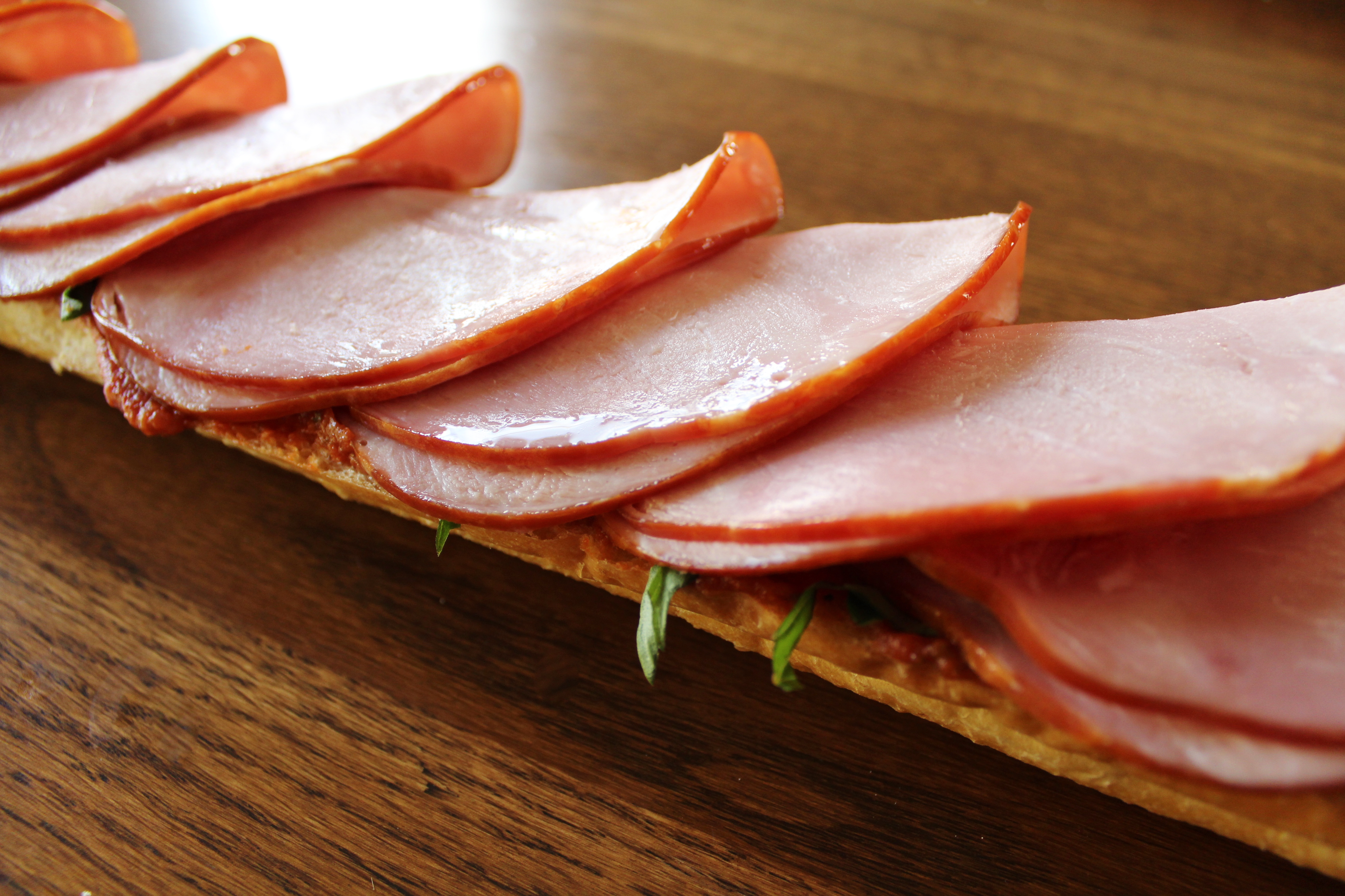 - Spread 1/2 cup pizza sauce on the bottom portion of the loaf. Coarsely chop approx. 4 medium basil leaves and sprinkle on top. Layer on the ham, half the pepperoni, 8 slices of mozzarella, the remaining half of the pepperoni, and 4 slices of mozzarella. You can go a full 8 on the second layer of cheese if you want. I decided to go with less so it would be easier to see all the ingredients in the final pictures, but I LOVE cheese. I never feel like there’s too much! ^.^